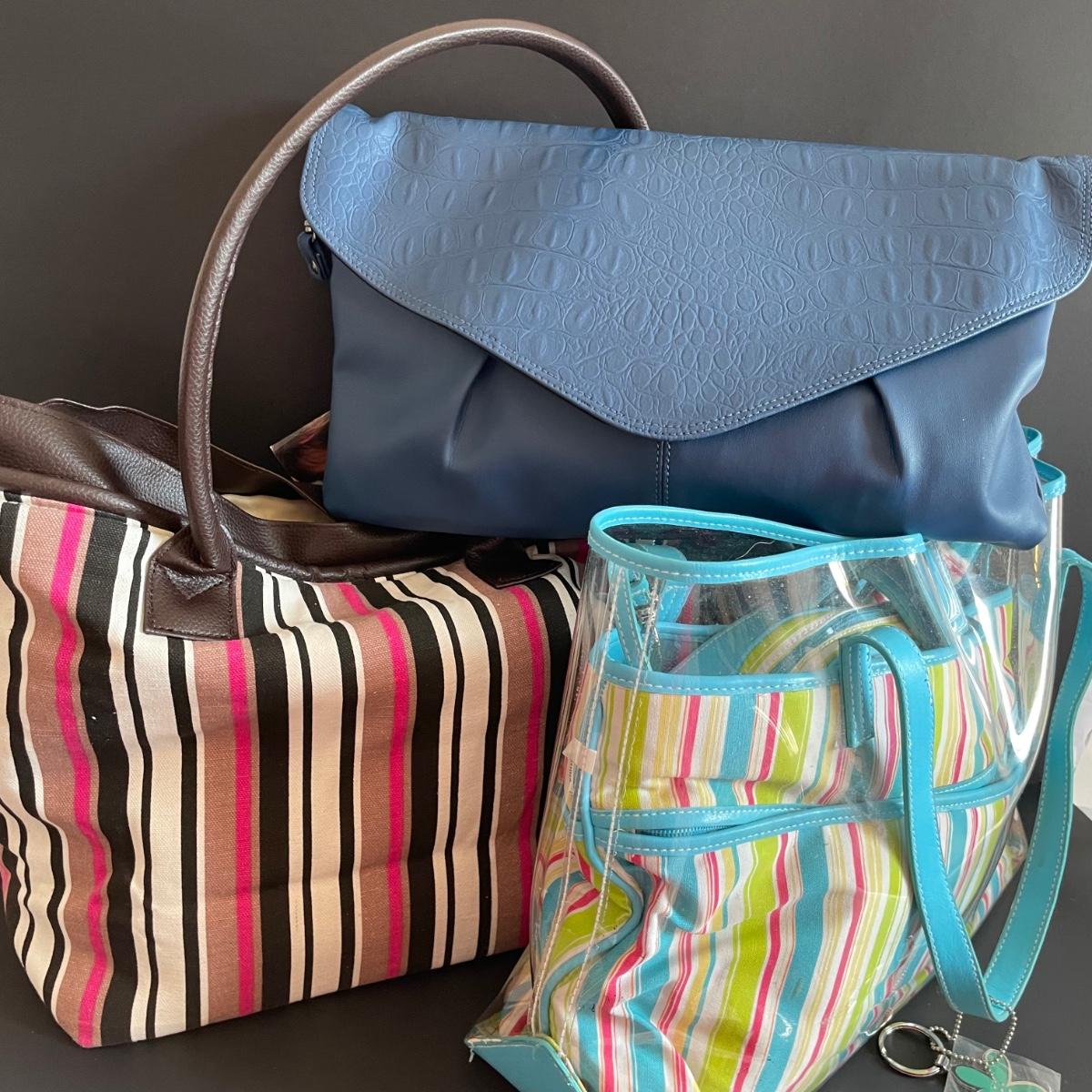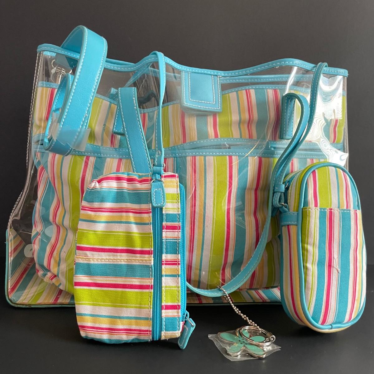 LOT 3: Colorful Handbags, Striped Knitting Tote, Clear Beach Bag with Matching Accessories and Blue Clutch Purse with Shoulder Strap