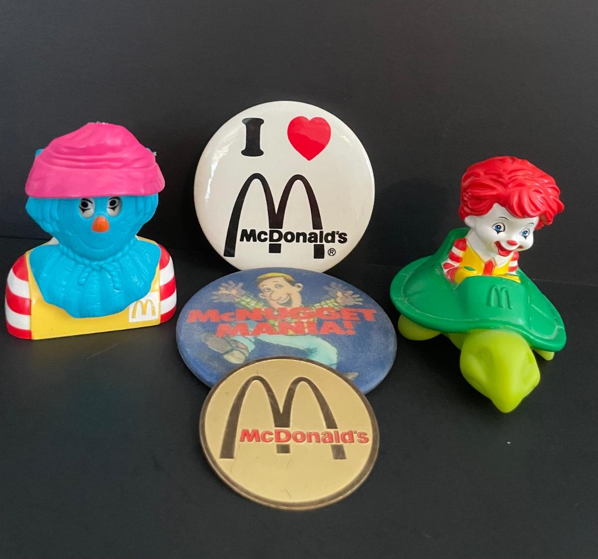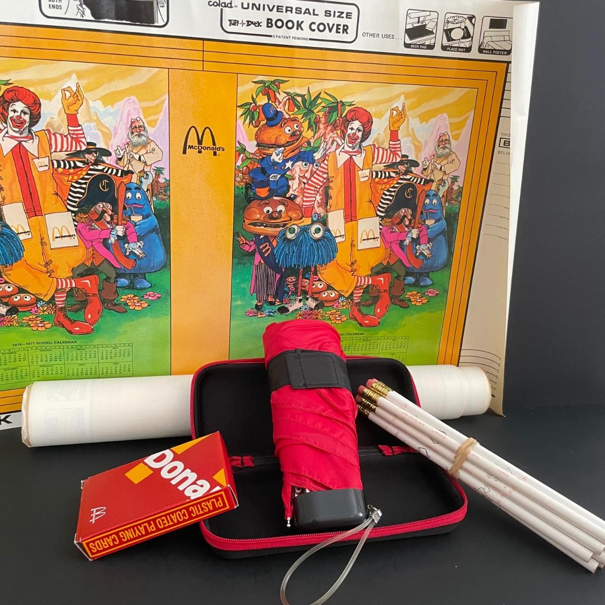 LOT 5: All Things Ronald McDonald Featuring Ronald McDonald Graphic Tee Shirt, Back to School Book Covers, Pencils, Miniature Dolls and an Unique Assortment of Ronald McDonald Collectibles