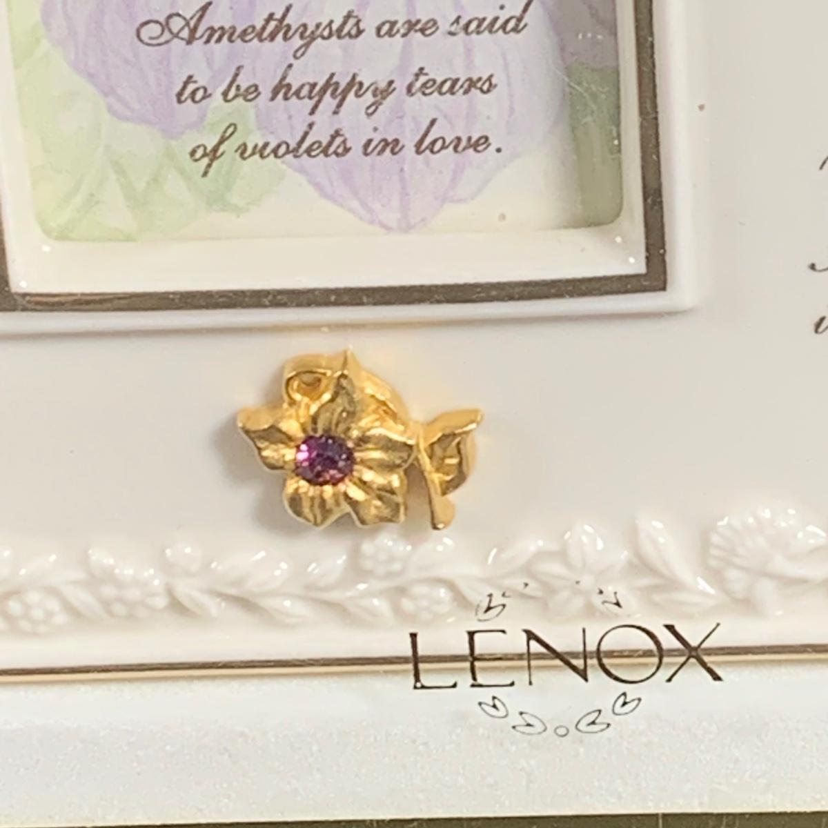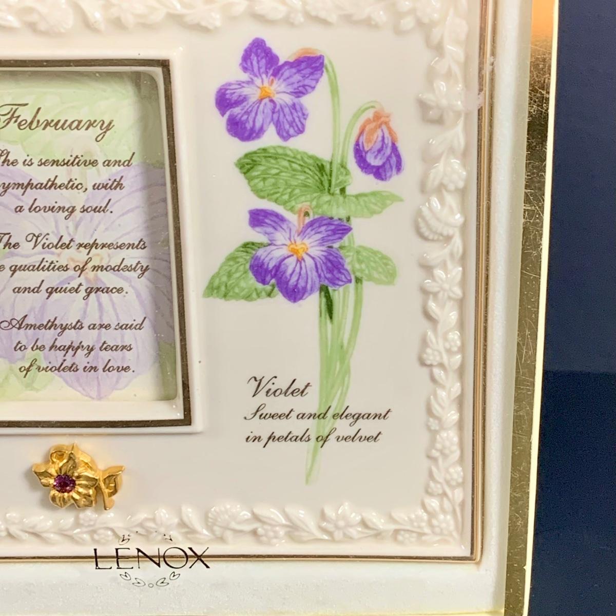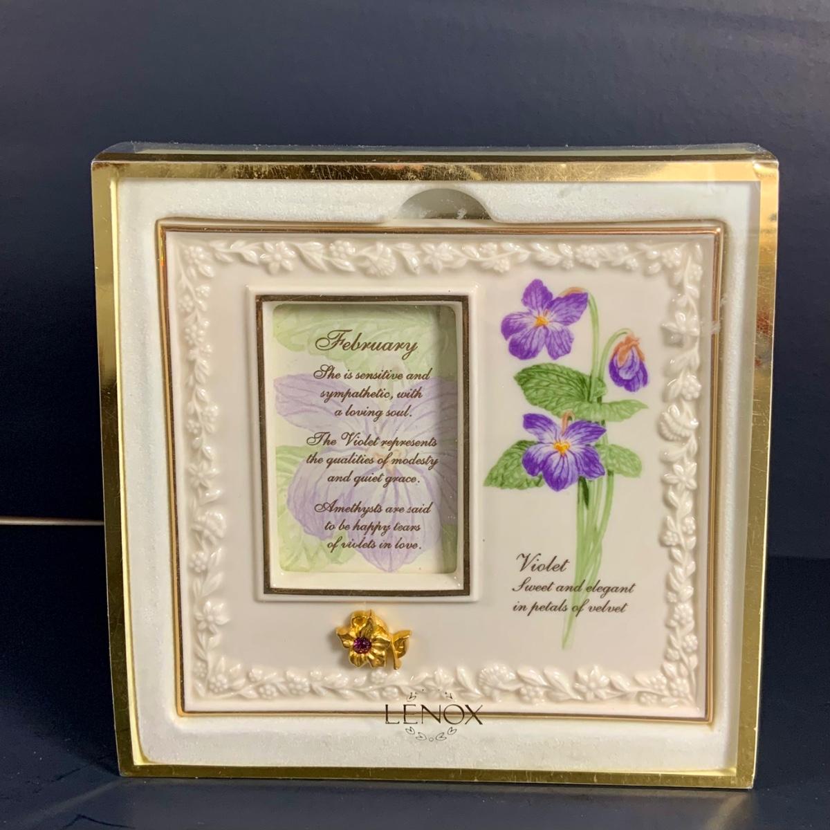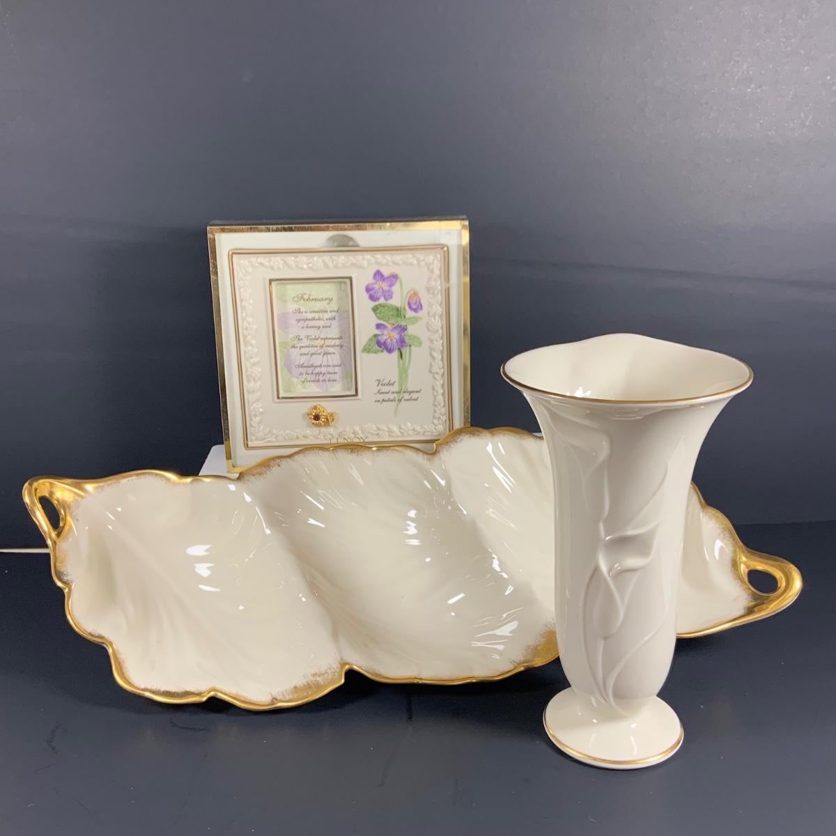 LOT 30: Lovely Lenox China Collection - Lilies of Beauty Vase, Triple Leaf Serving Dish with Gold Trim and February Birthstone Frame