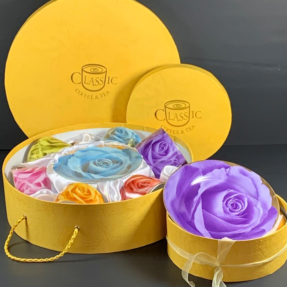 LOT 31: Classic Coffee and Tea Rainbow of Roses Cups, Saucers and Cookie Plates All in Oringinal Round Boxes