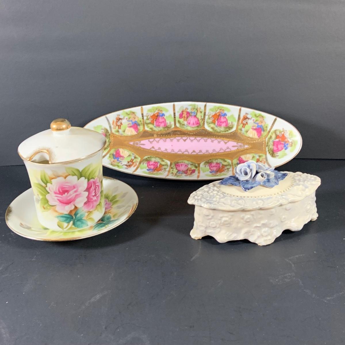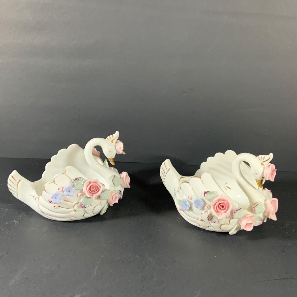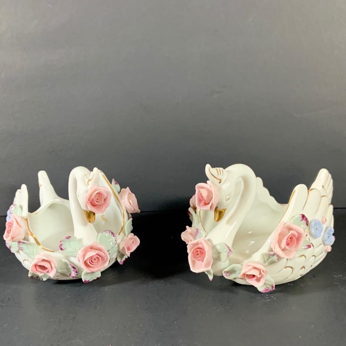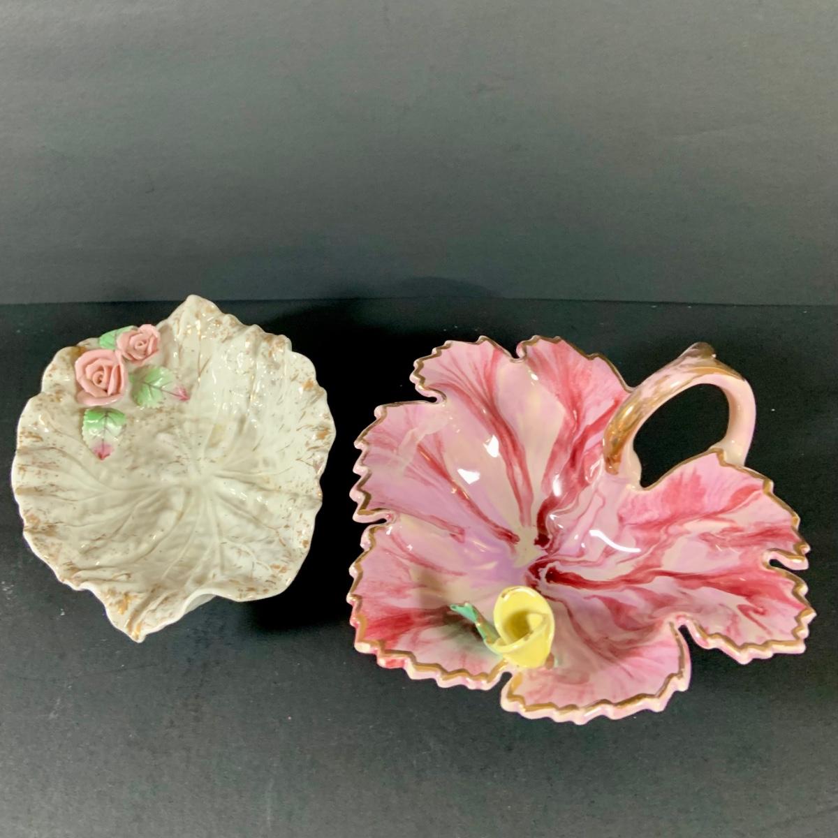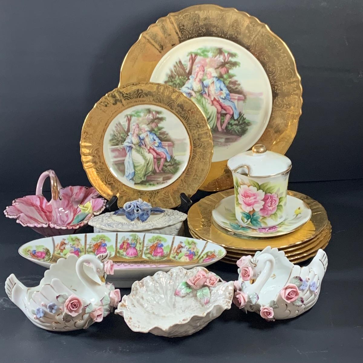 LOT 41: Victorian Collection Featuring Gold Rimmed French Garden Dinner Plate and Cookie Plates, Swans with Roses, Leaf Bowls by Lefton and Other, Royal Vienna Oval Bowl , and More