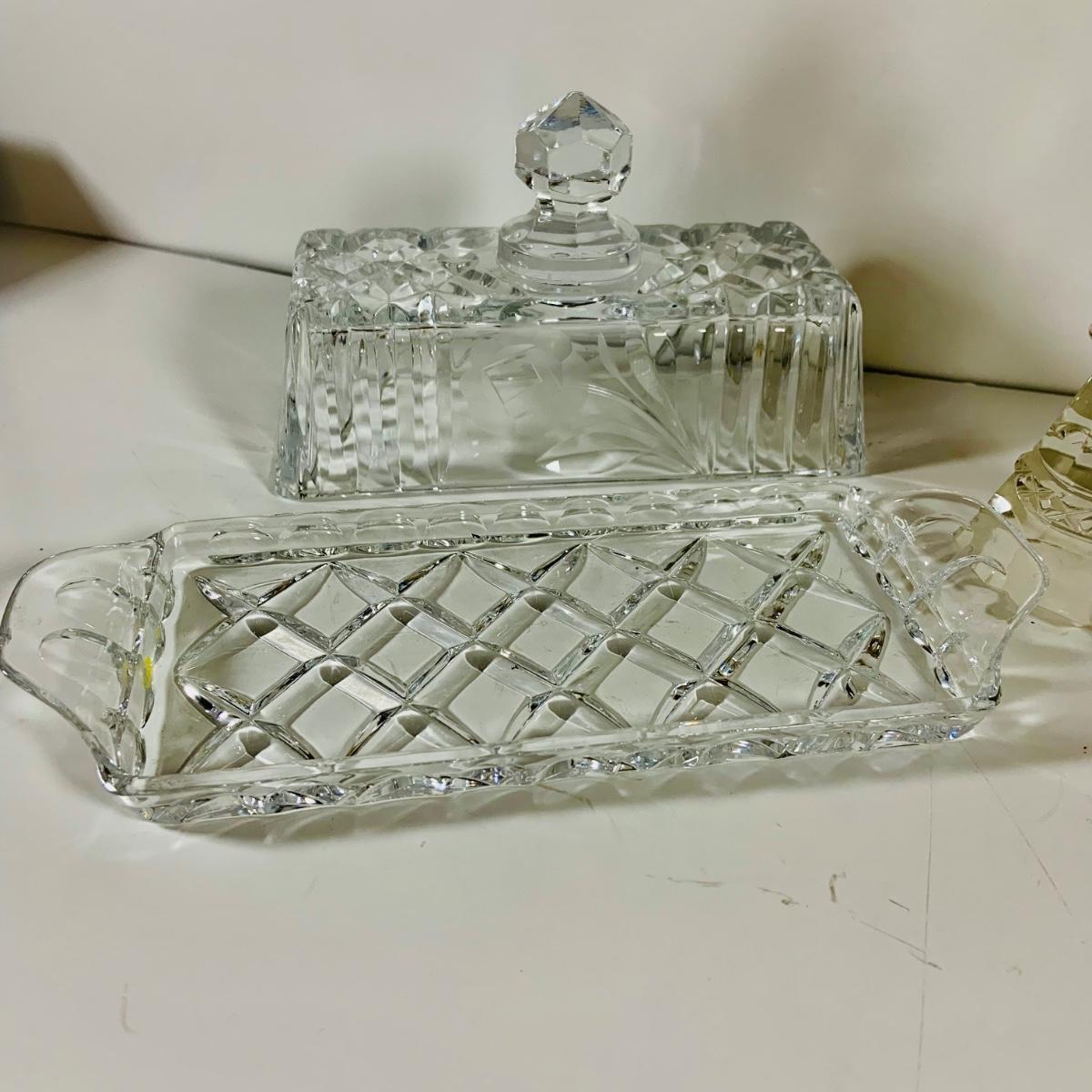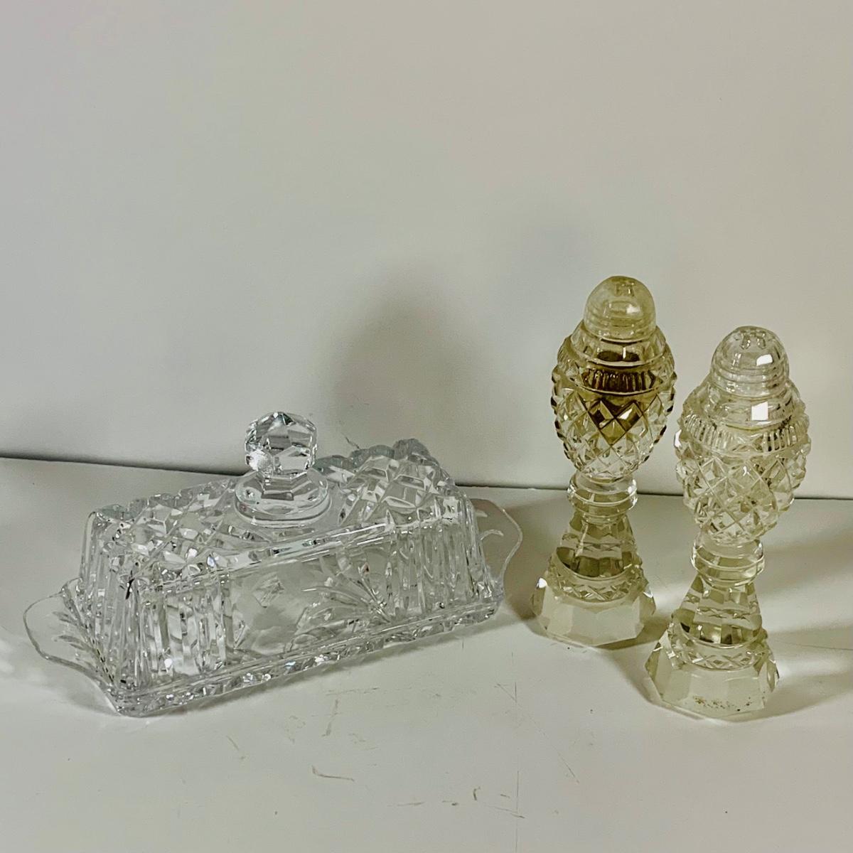 LOT 43: Collection of Crystal and Other Serving Essentials, Including a Crystal Pitcher, Salt and Pepper Shakes, Covered Butter Dish, Salad Bowl and More