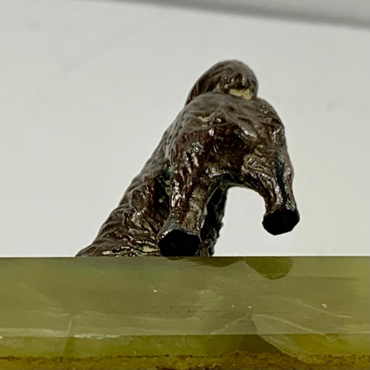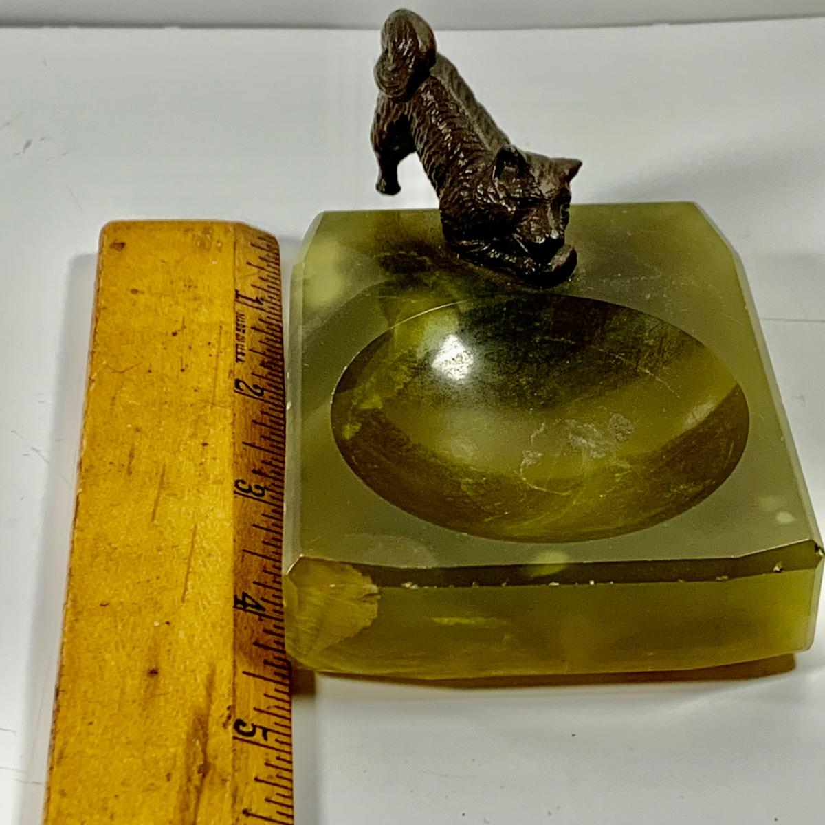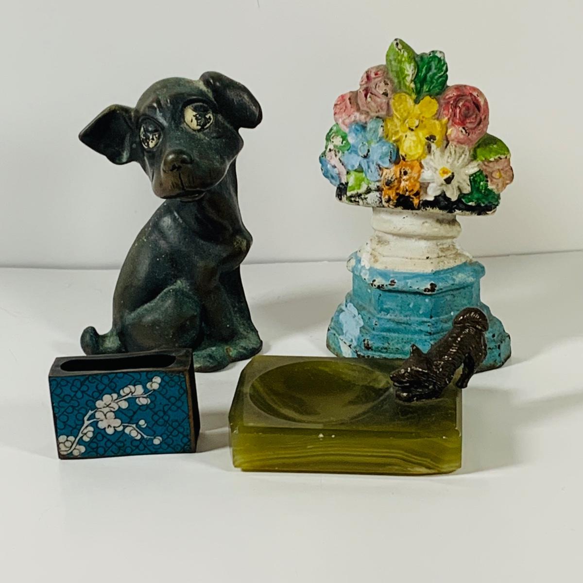 LOT 45: Cast Iron Dog Door and Flower Stop, Chinese Cloisonne and Carved Stone Matchbox Case and Vintage Bronze Dog and Onyx Pin/Trinke Tray
