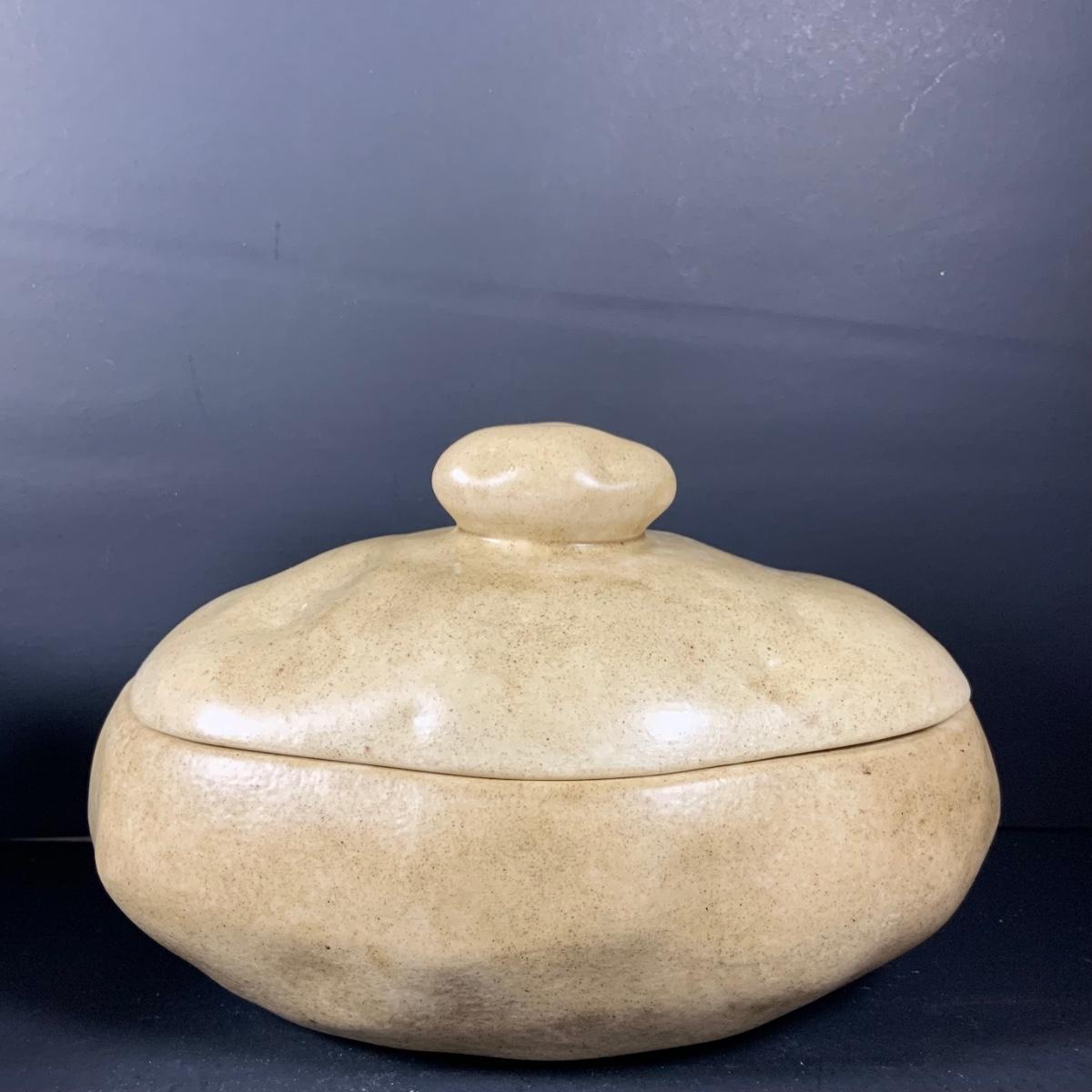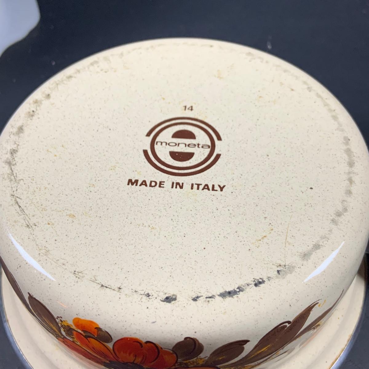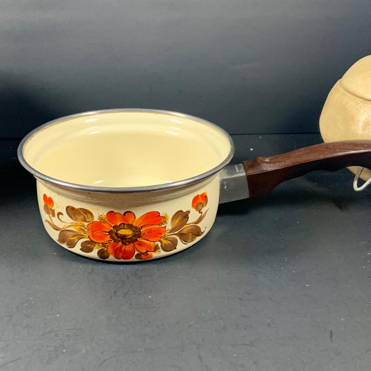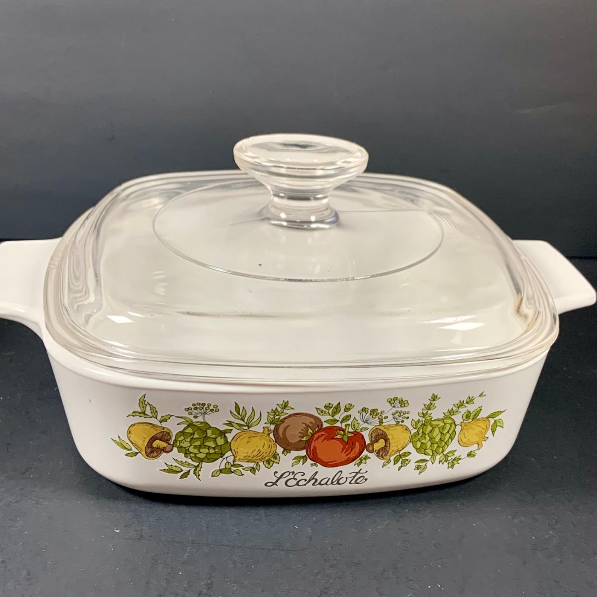 LOT 53: Vintage Ceramic Atlantic Mold Potato Serving Dish, Corning ware Spice of Life 1qt Baking Dish with Lid. Moneta Enamel Sauce Pan and Fire King Golden Wheat Baking Dish