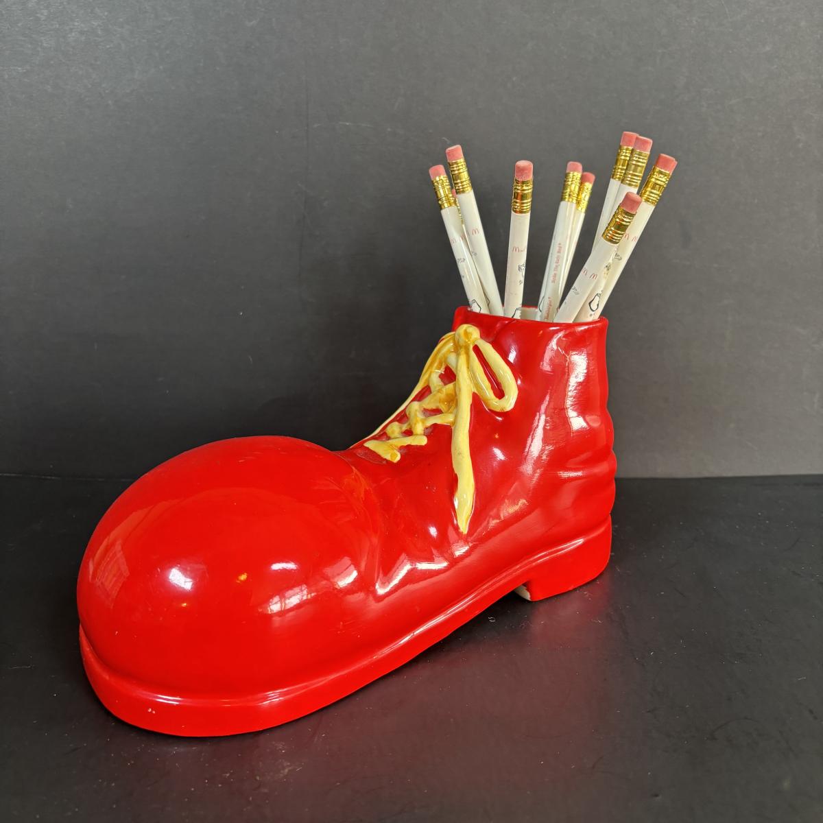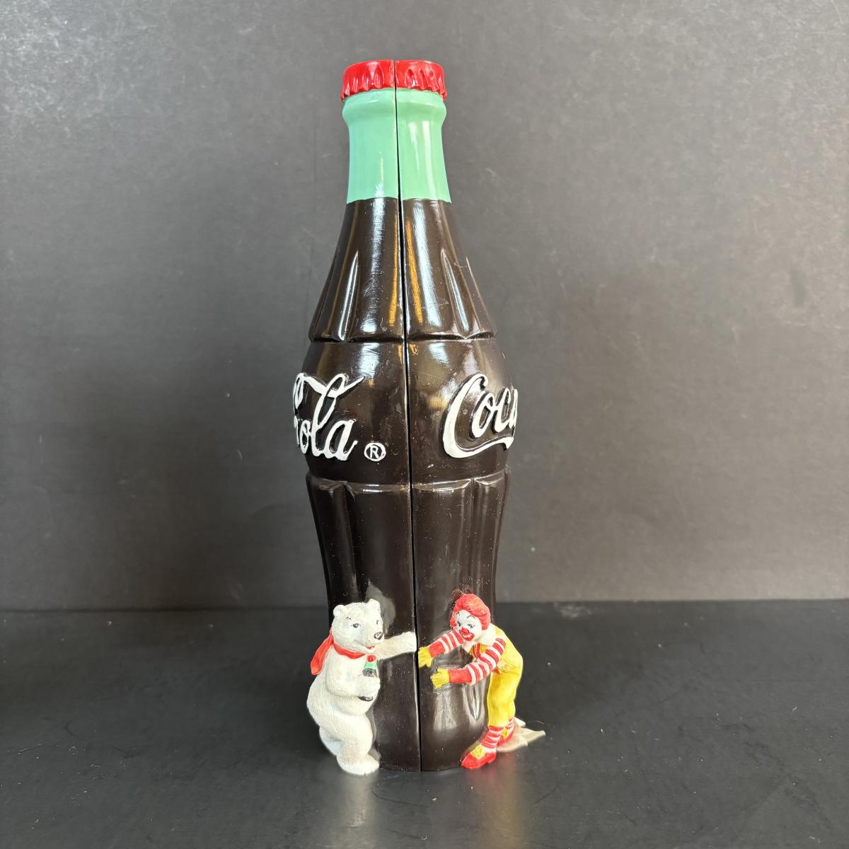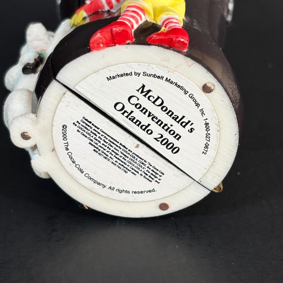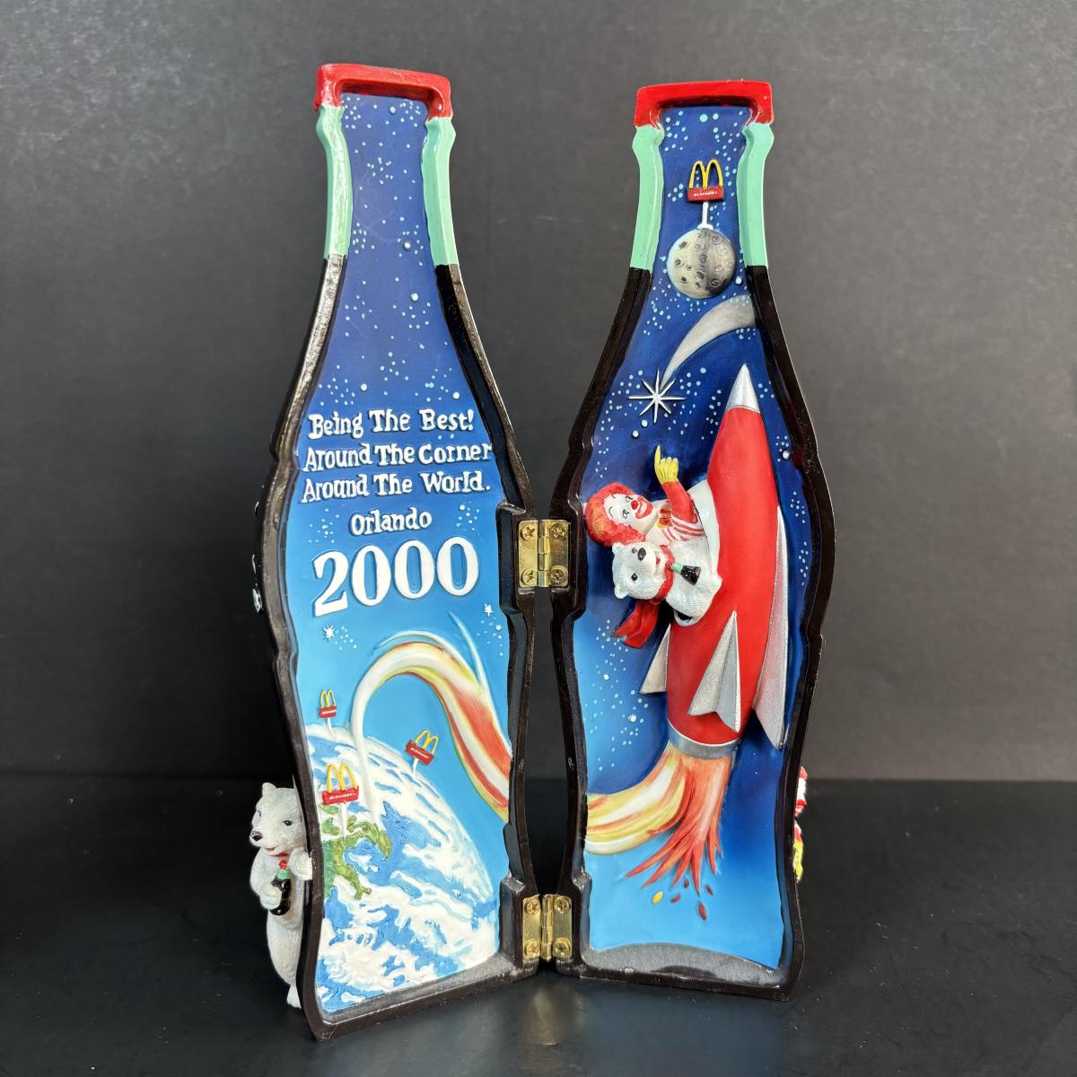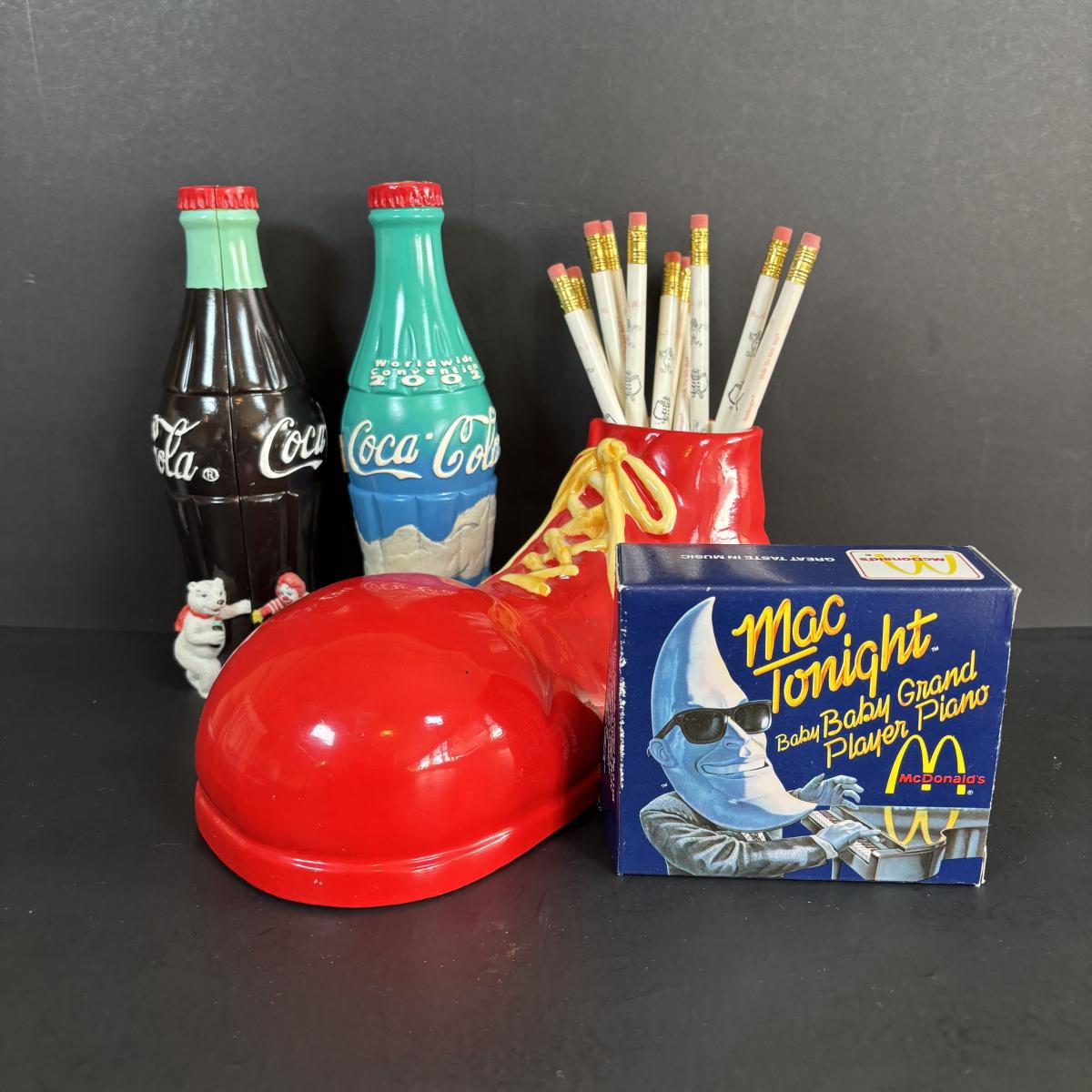 LOT 96: RARE Ronald McDonald's Red Shoe Ceramic Planter, 1988 Mac Tonight Piano, 2000 & 2002 Worldwide Convention Hinged Coca-Cola Bottles, & Character Pencils