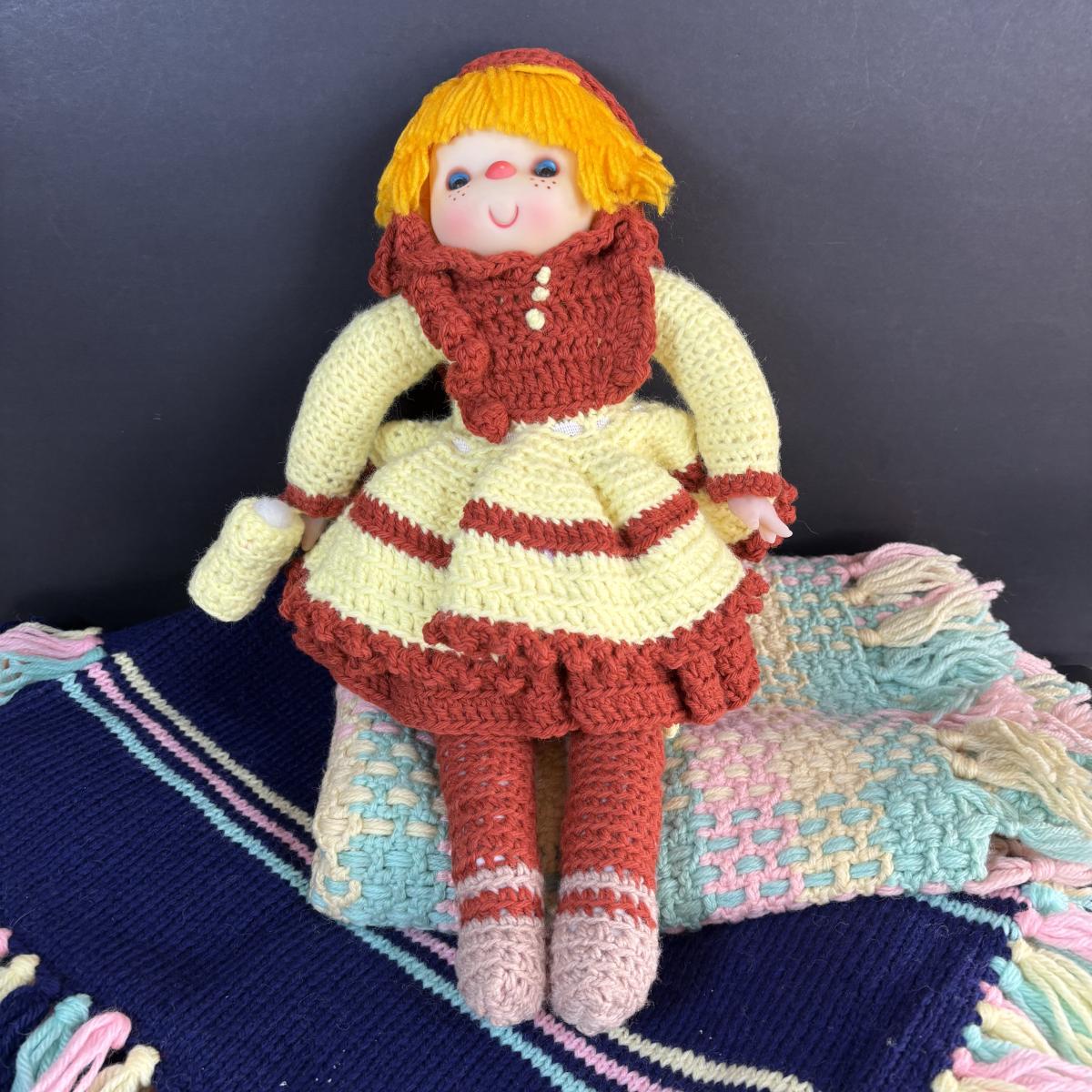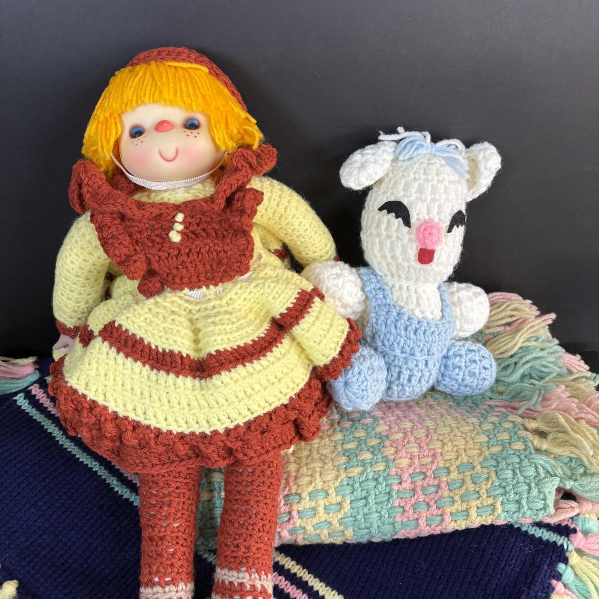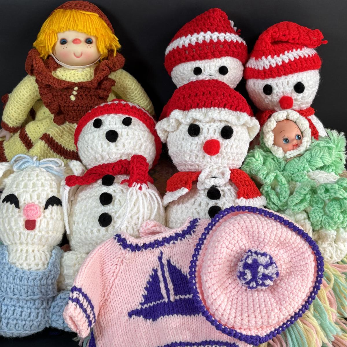 LOT 102: Collection of Hand Crocheted Dolls, Snowmen and 2-Baby Afgans