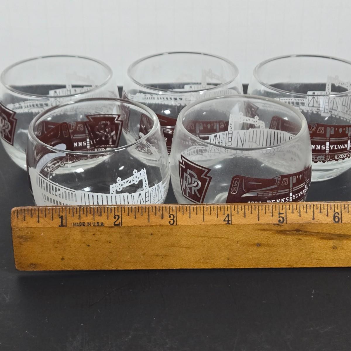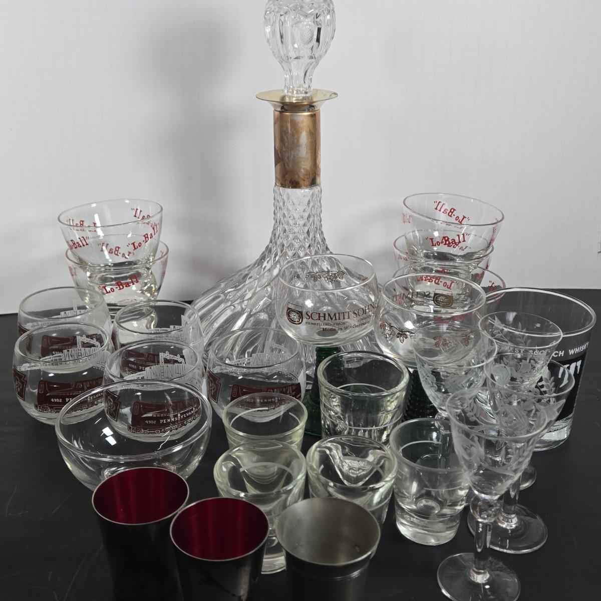 LOT 112: Crystal Wine Decanter, Vintage 1950s Pennsylvania Railroad GG1 Roly Poly Glasses, Schmitt Sohne Liqueur Glasses, Lo Ball Glasses, Vintage Libby Shot Glasses, Crystal Cordial Glasses, and More
