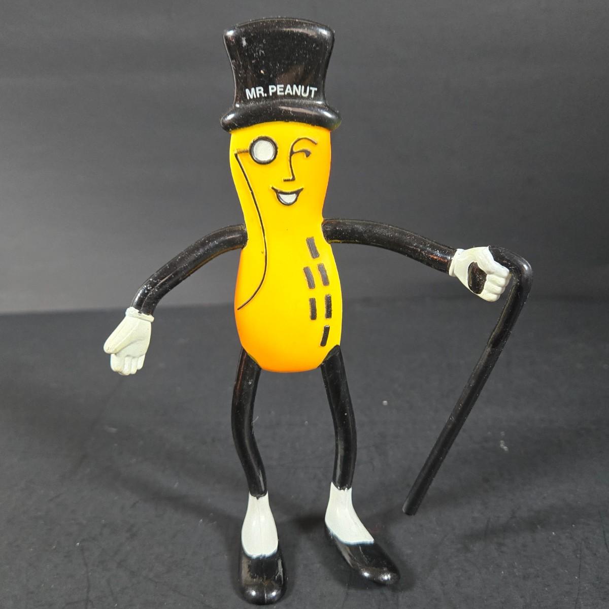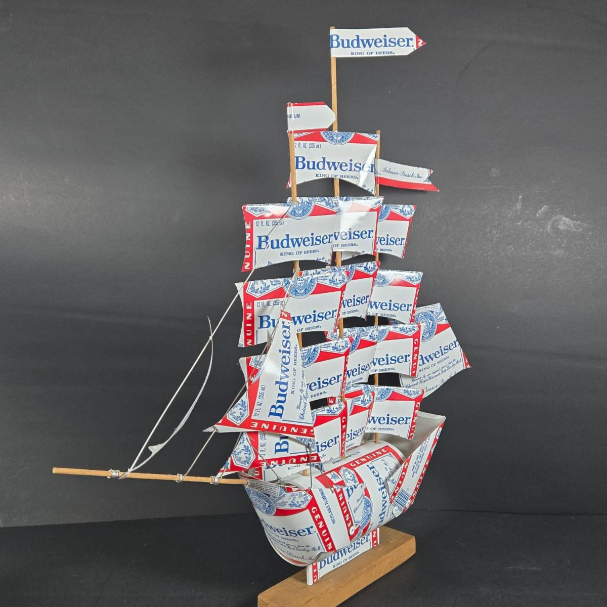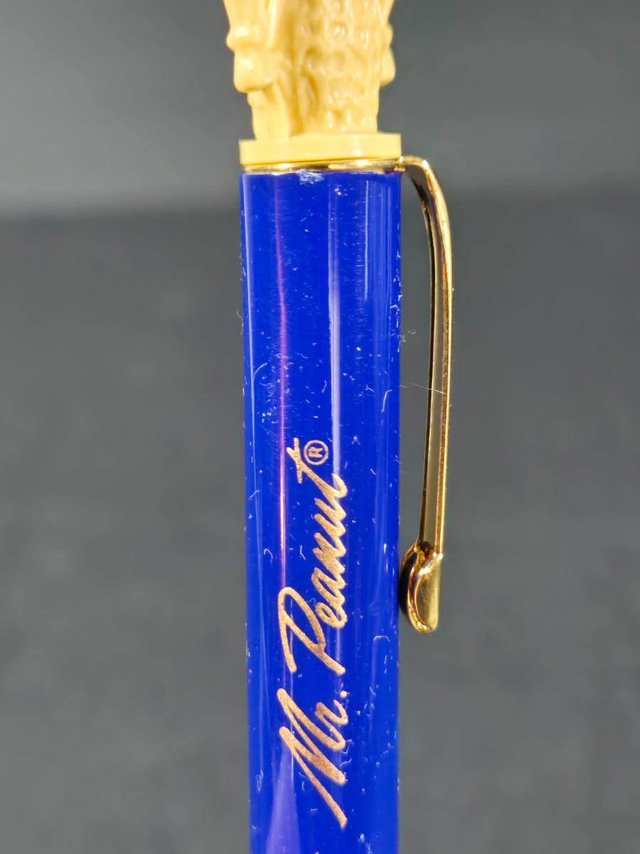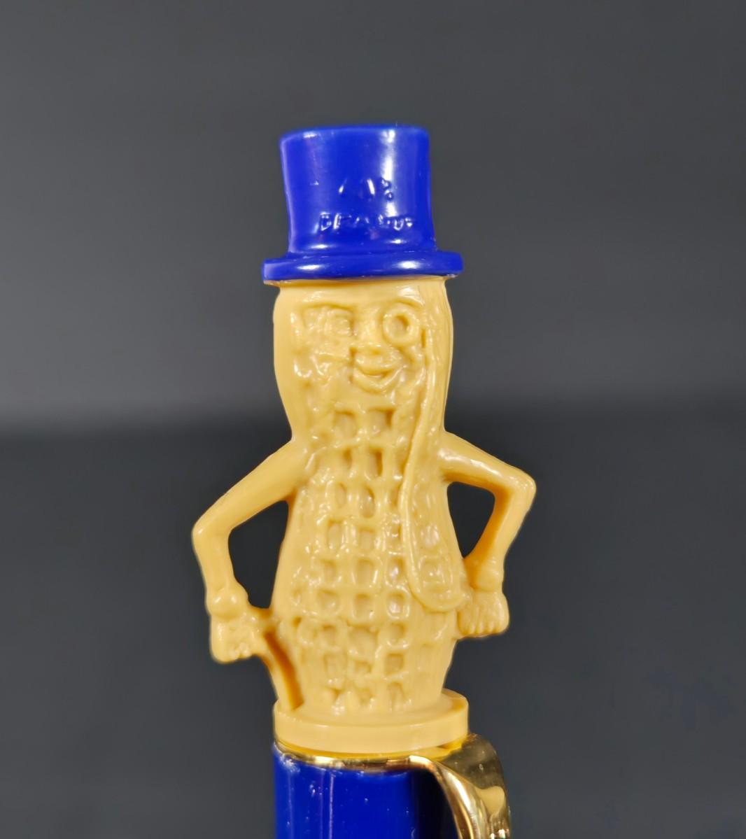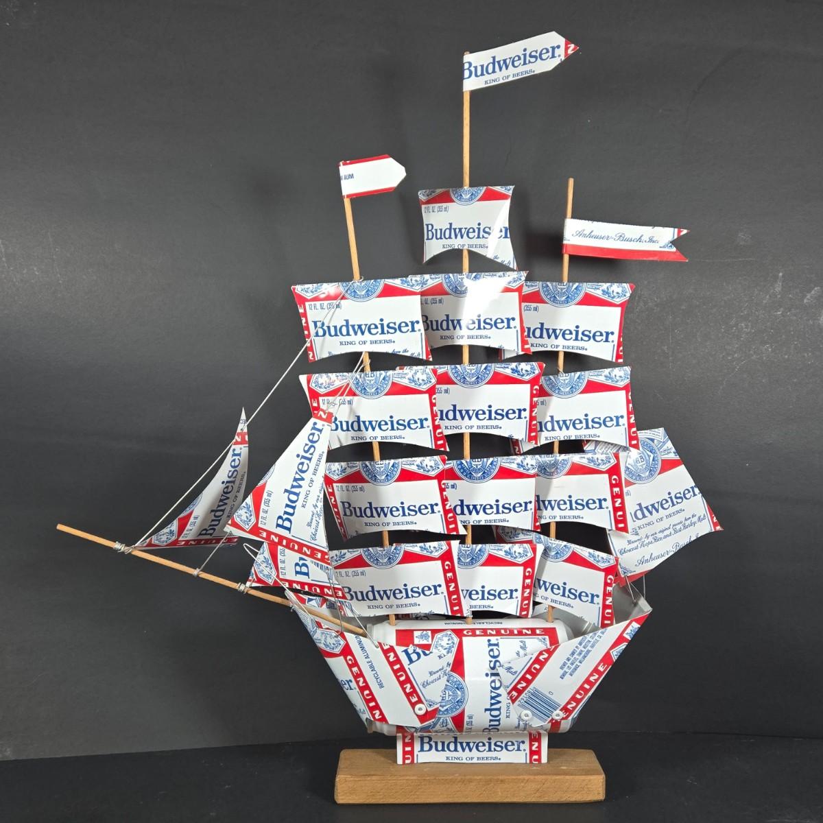 LOT 133: Handcrafted "BUDWEISER" Sailboat, BUDWEISER Pens, MR. PEANUT Bendable Figure, MR. PEANUT Pen, & Vintage Metal Biplane Music Box