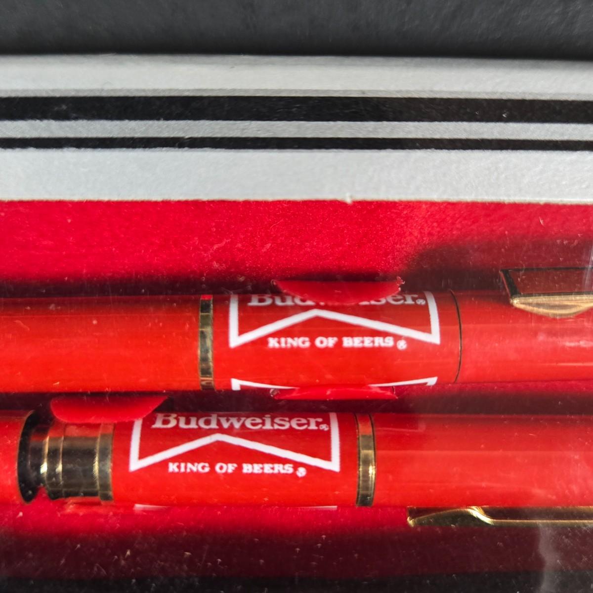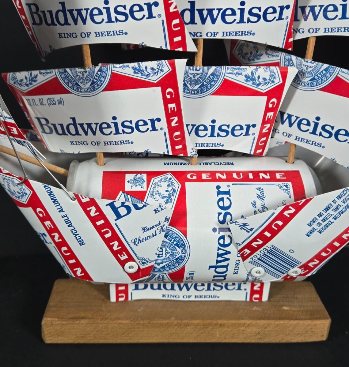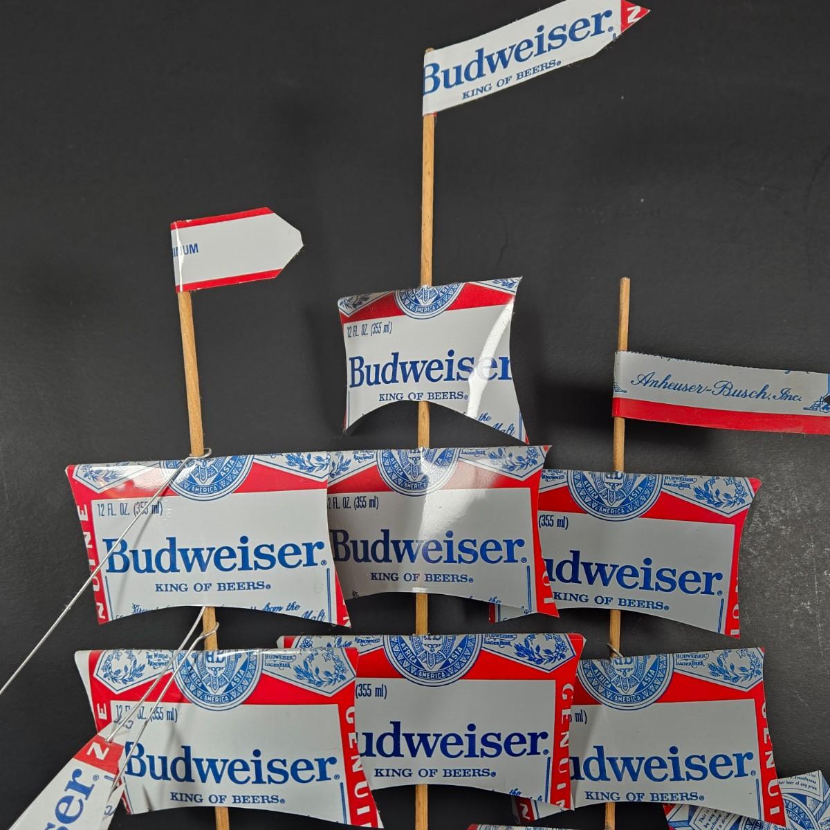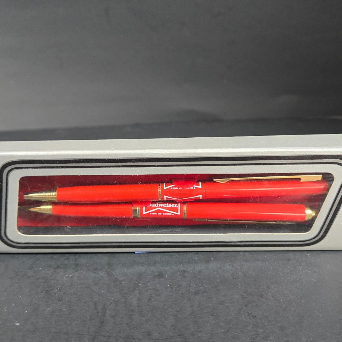 LOT 133: Handcrafted "BUDWEISER" Sailboat, BUDWEISER Pens, MR. PEANUT Bendable Figure, MR. PEANUT Pen, & Vintage Metal Biplane Music Box