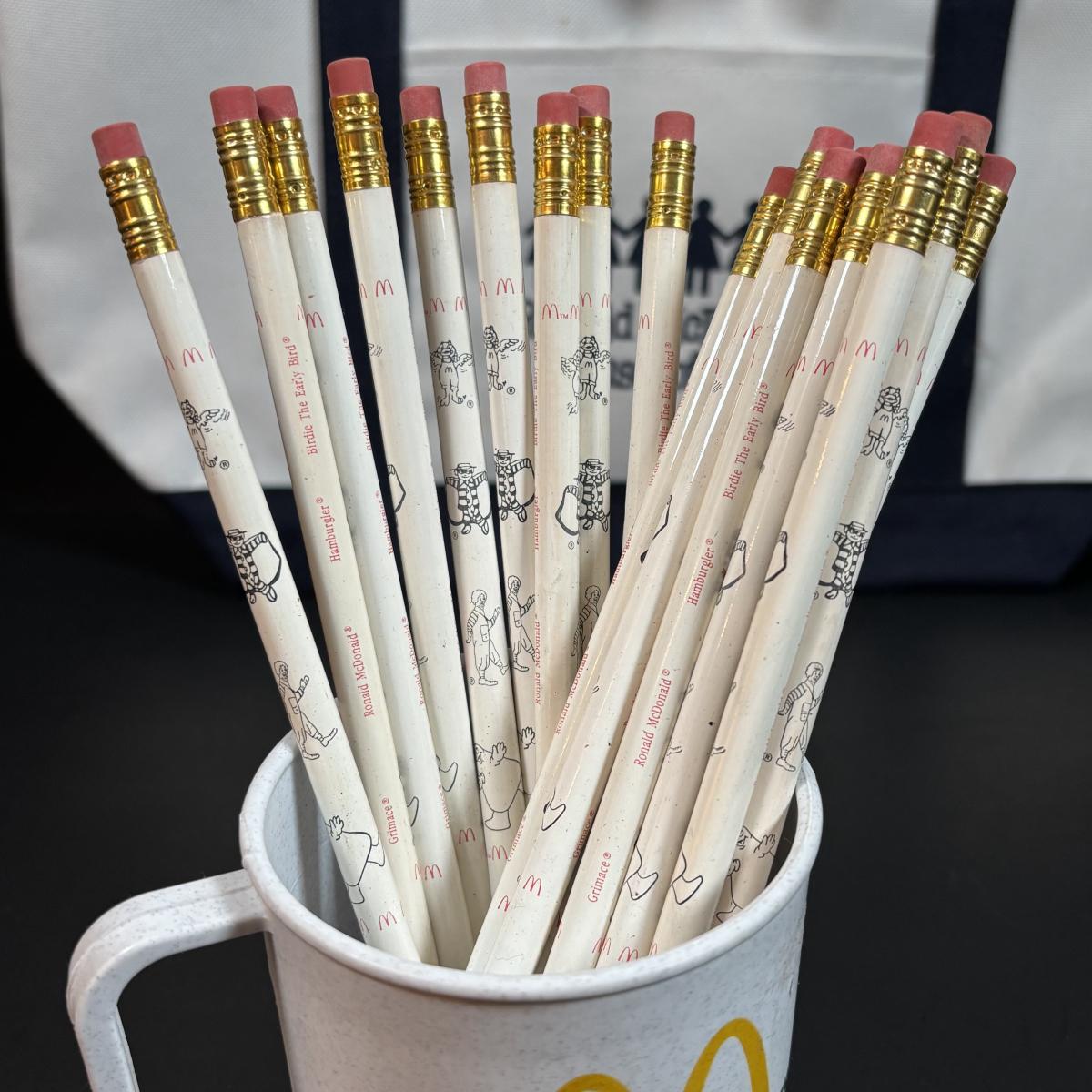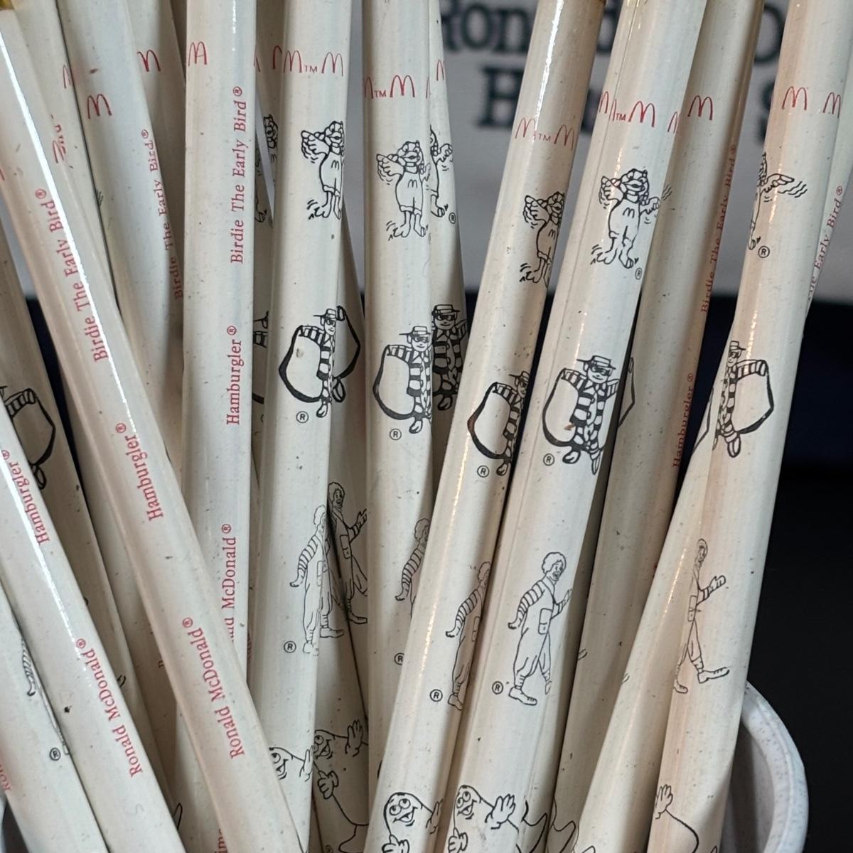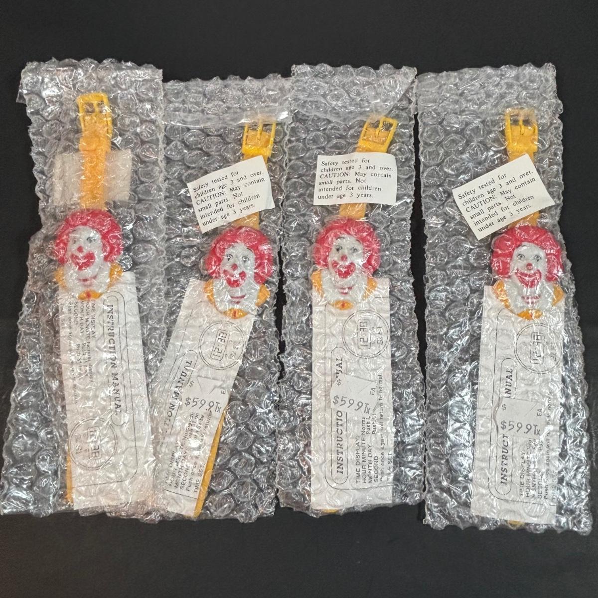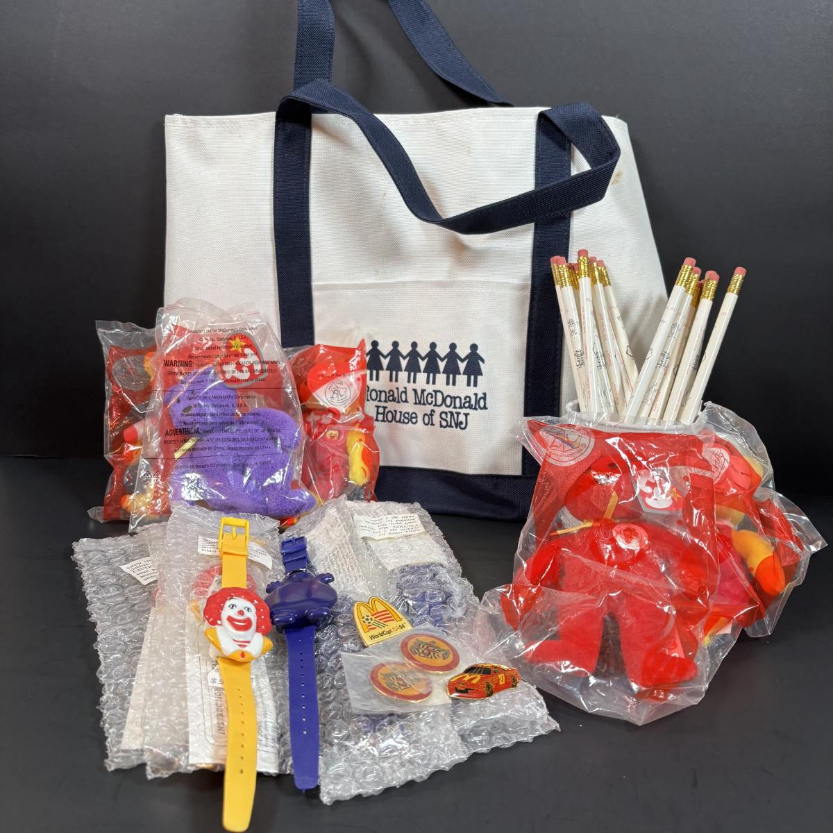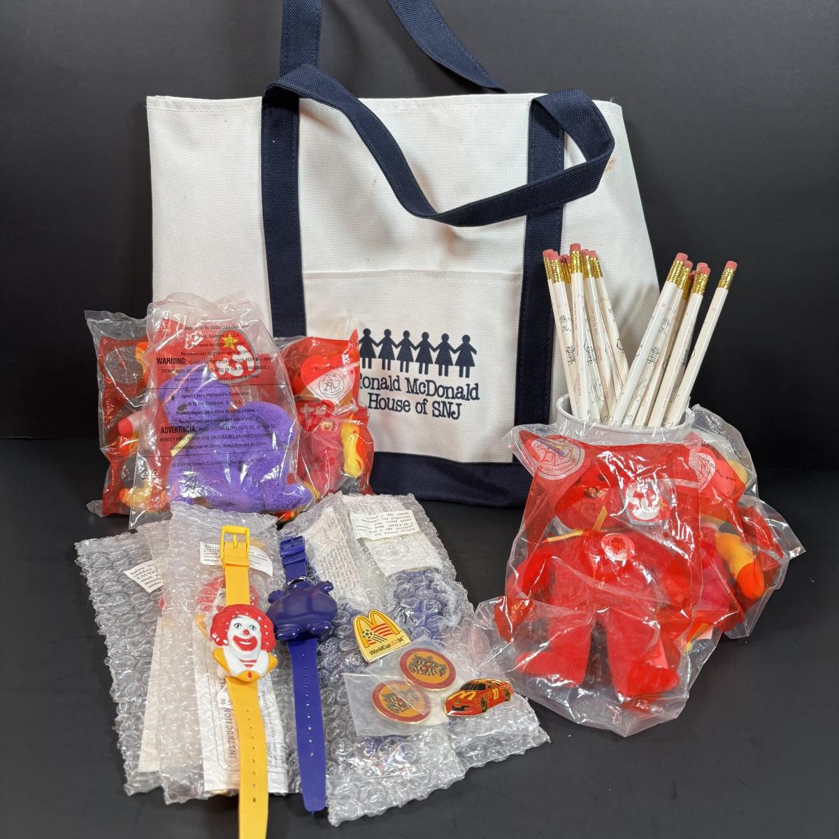 LOT 153" Vintage McDonald's Grimace & Ronald McDonalds Flip Digital Wristwatch (qty 8,), McDonalds Pencils & Lapel Pins, Happy Meal Teenie Beanie Baby Bears & Ronald McDonald House Canvas Tote