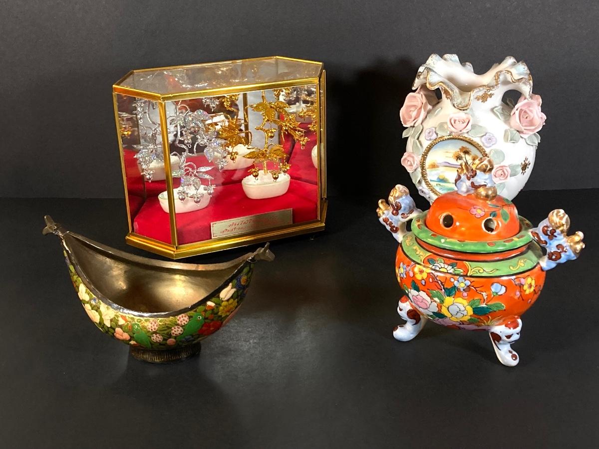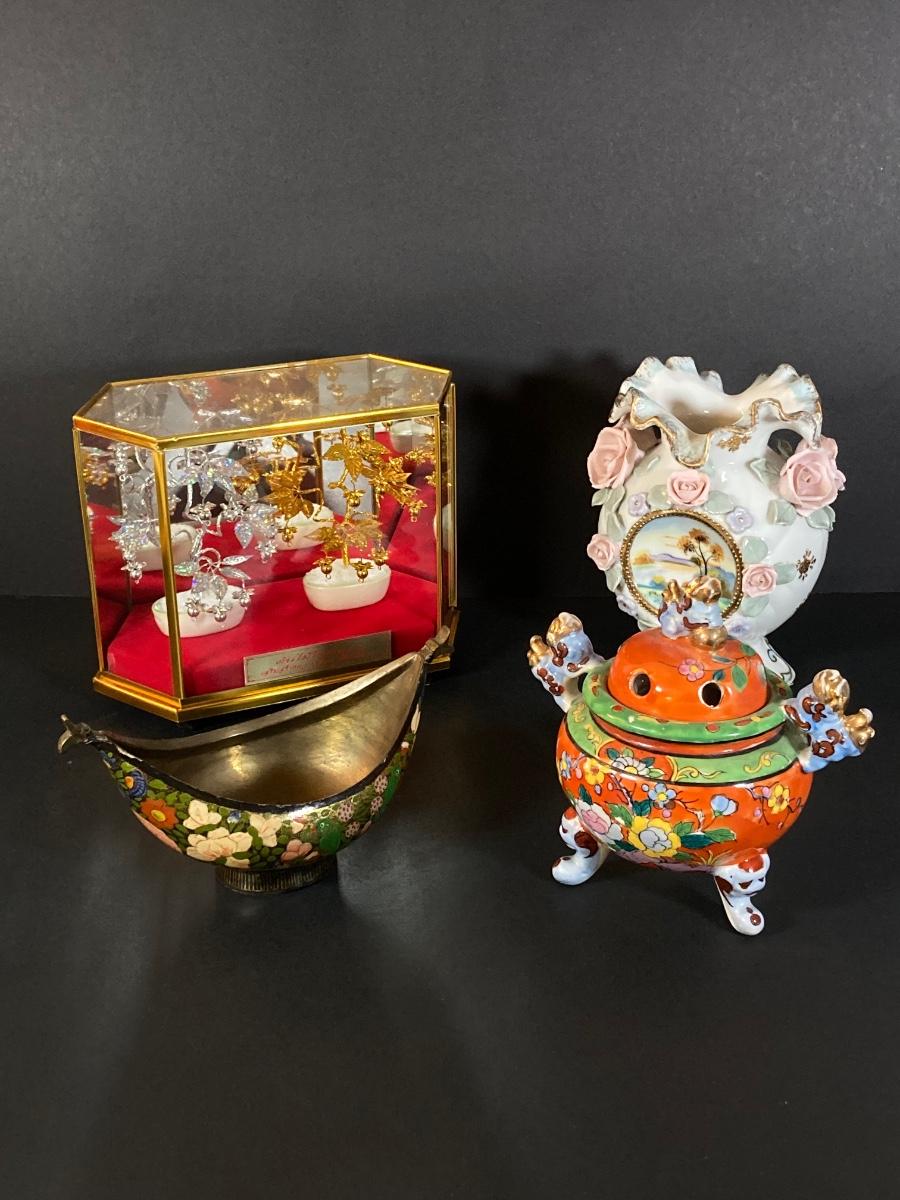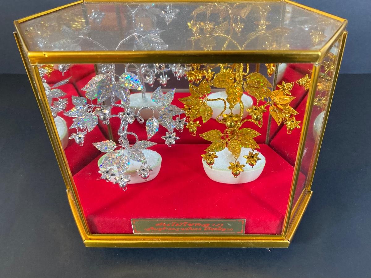 LOT 178: Beautiful Asian Decorative Collection - Sphinx, Silver / Gold Tone Trees in Mirrored Glass Box and More