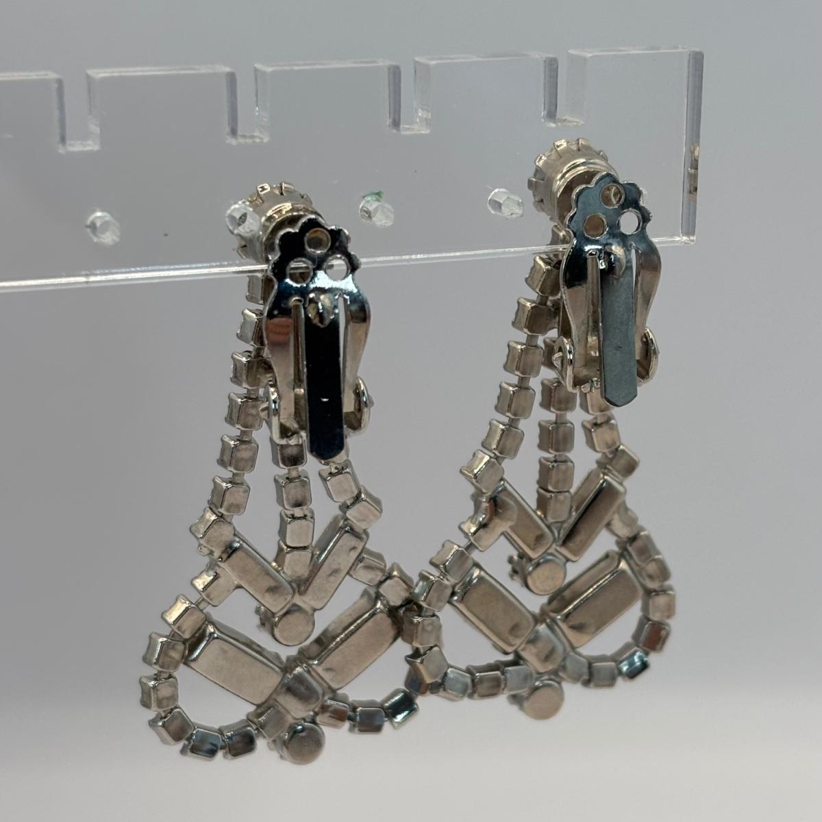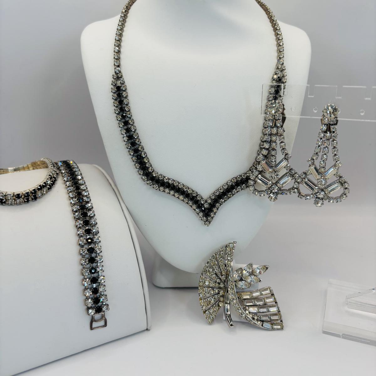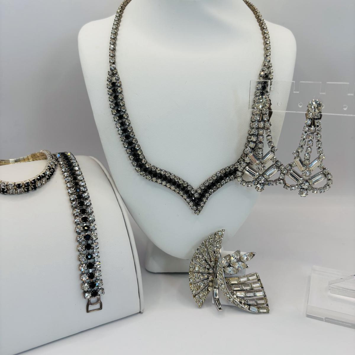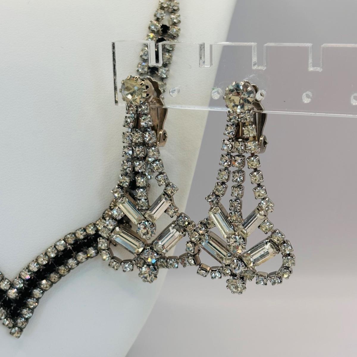 LOT 338: Vintage Silvertone Rhinestone V-Neck Choke Style Necklace & 6.5" Bracelet, Art Deco Style Rhinestone Brooch, Large Dangling Rhinestone Clip Earring & More