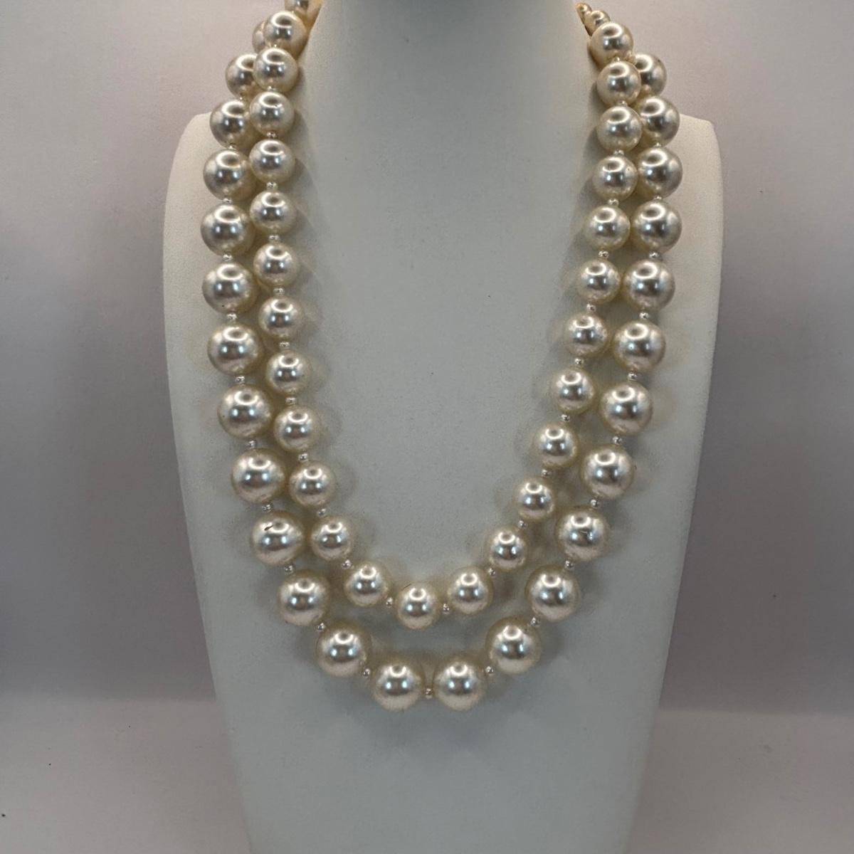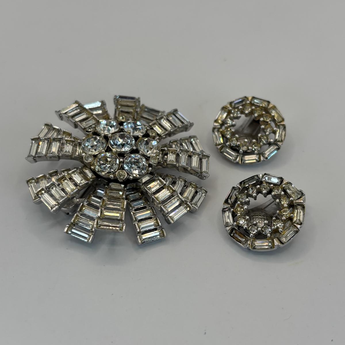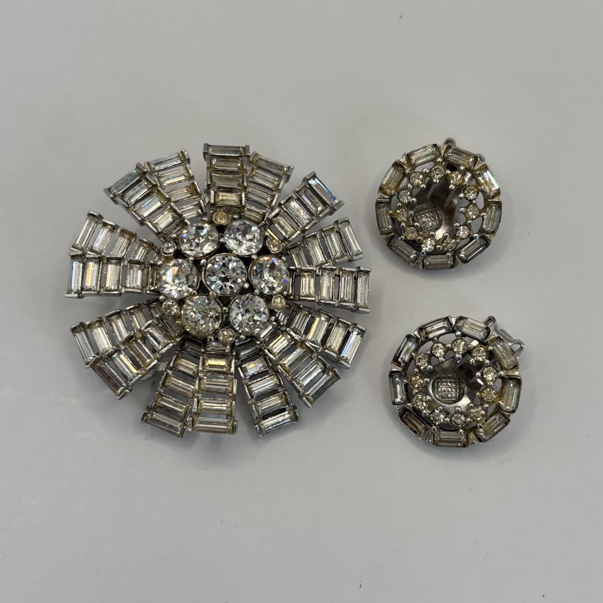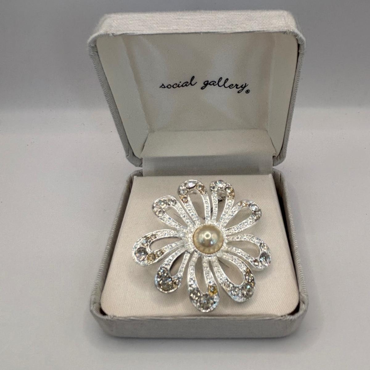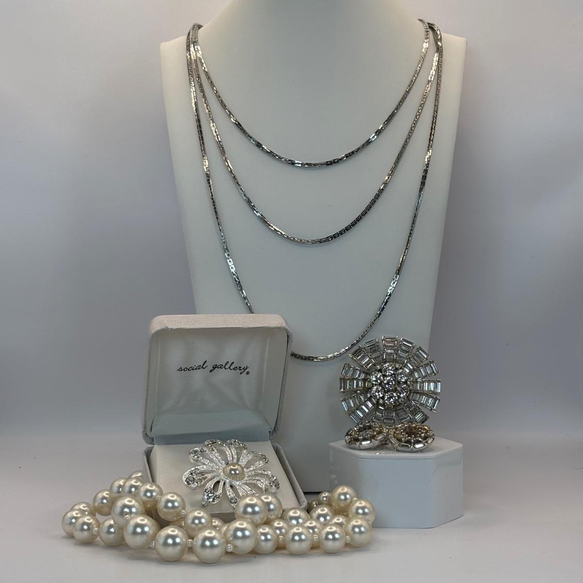 LOT 340 Silver Tone Multi Strand Necklace, Double Strand of Fauz Pearls, Rhinestone Brooch & Clip Earrings & Social Gallery Silvertone Floral Brooch w/Pearl Accent