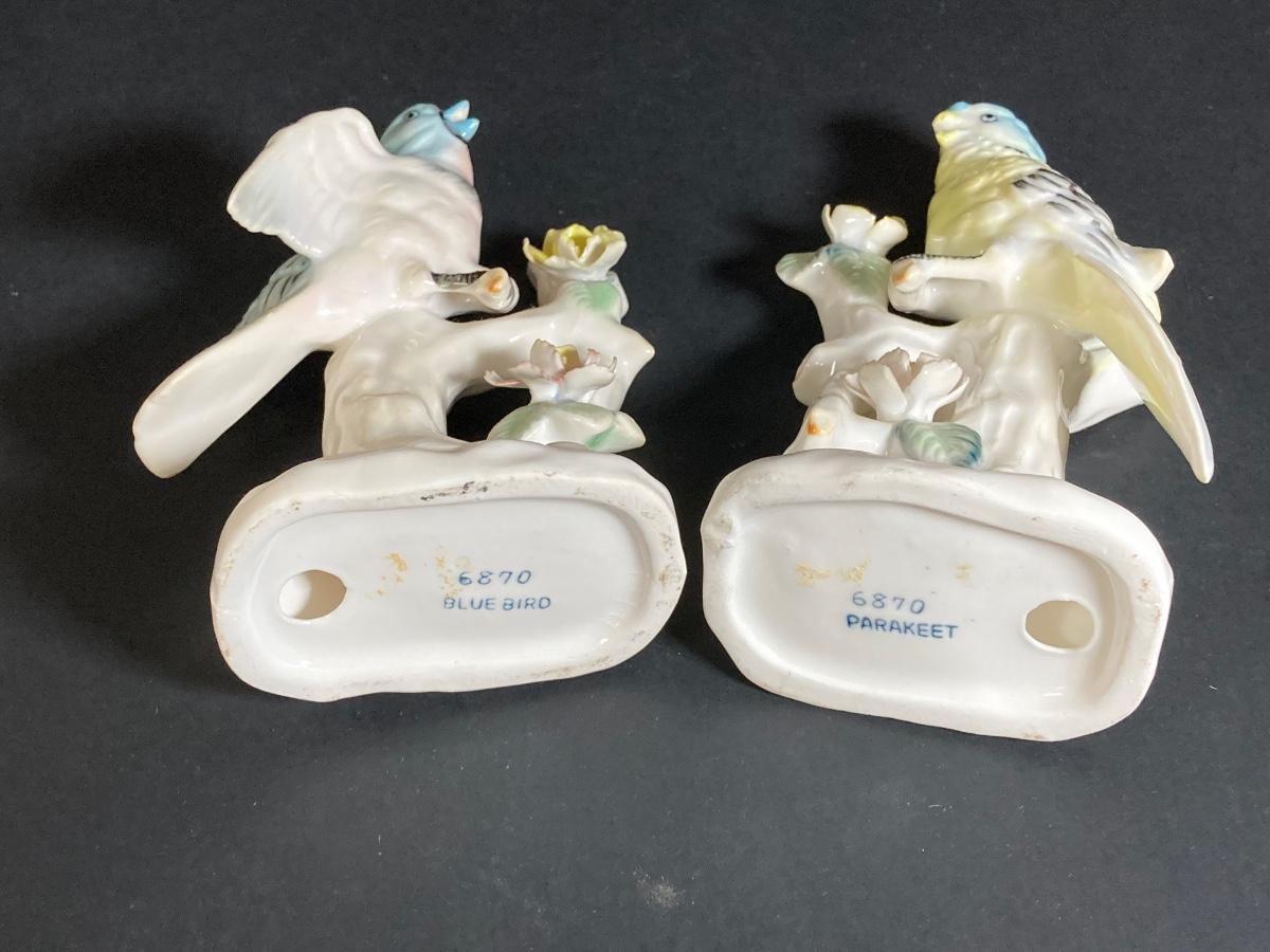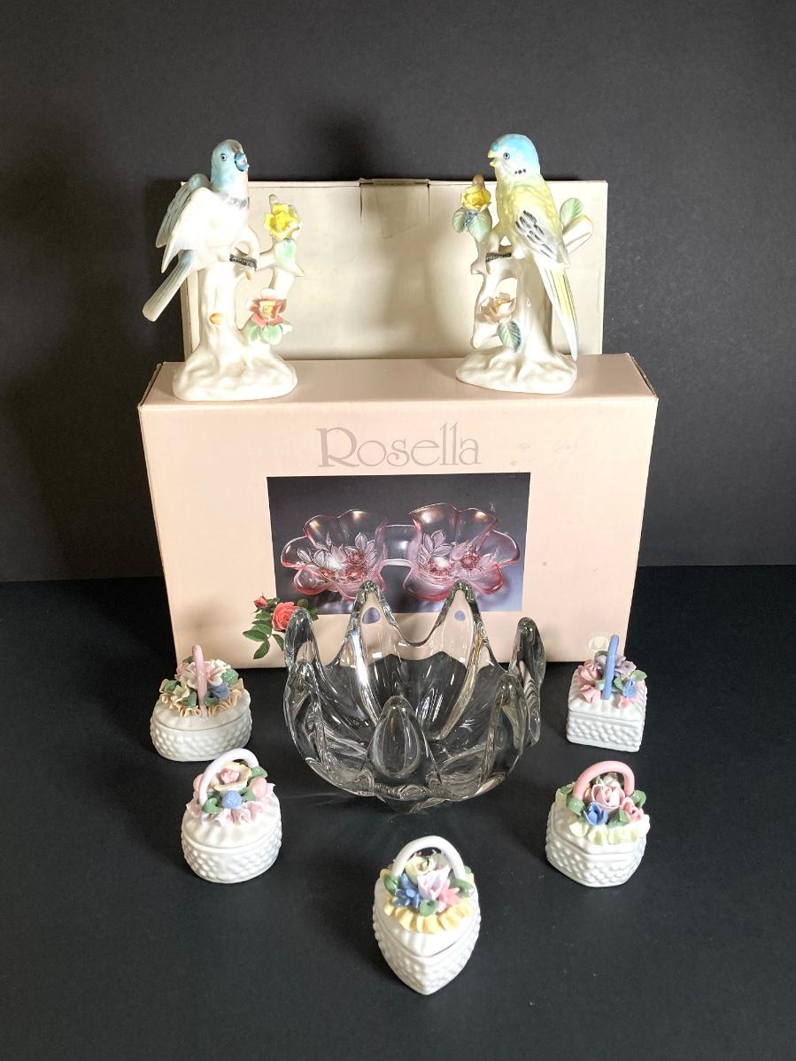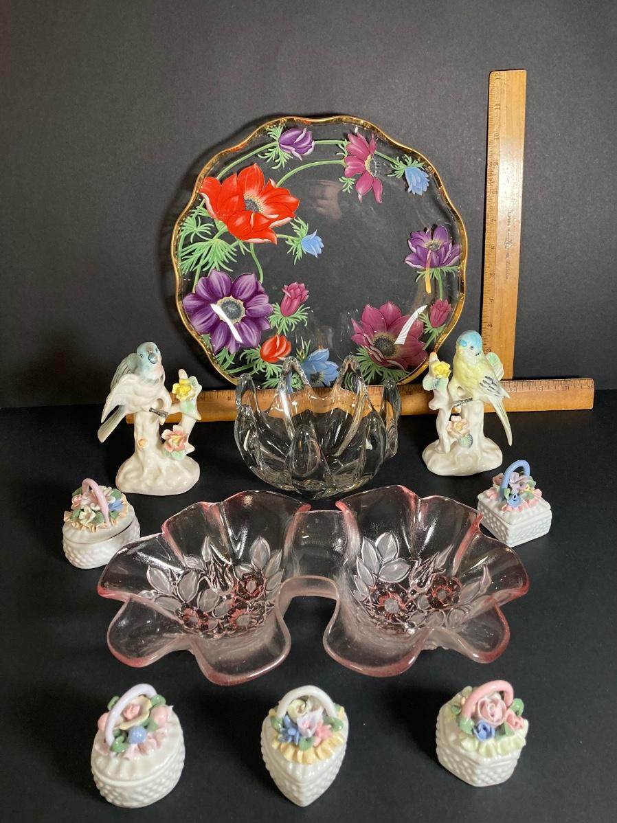 LOT 201: Lefton Floral Serving Plate, Vintage Blue Bird / Parakeet Bird Figurines, Art Vannes France Bowl, Rosella Pink Double Bowl and Miniature Floral Trinket Boxes