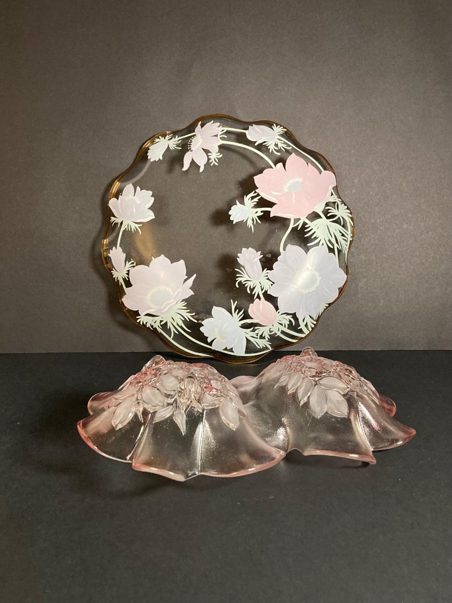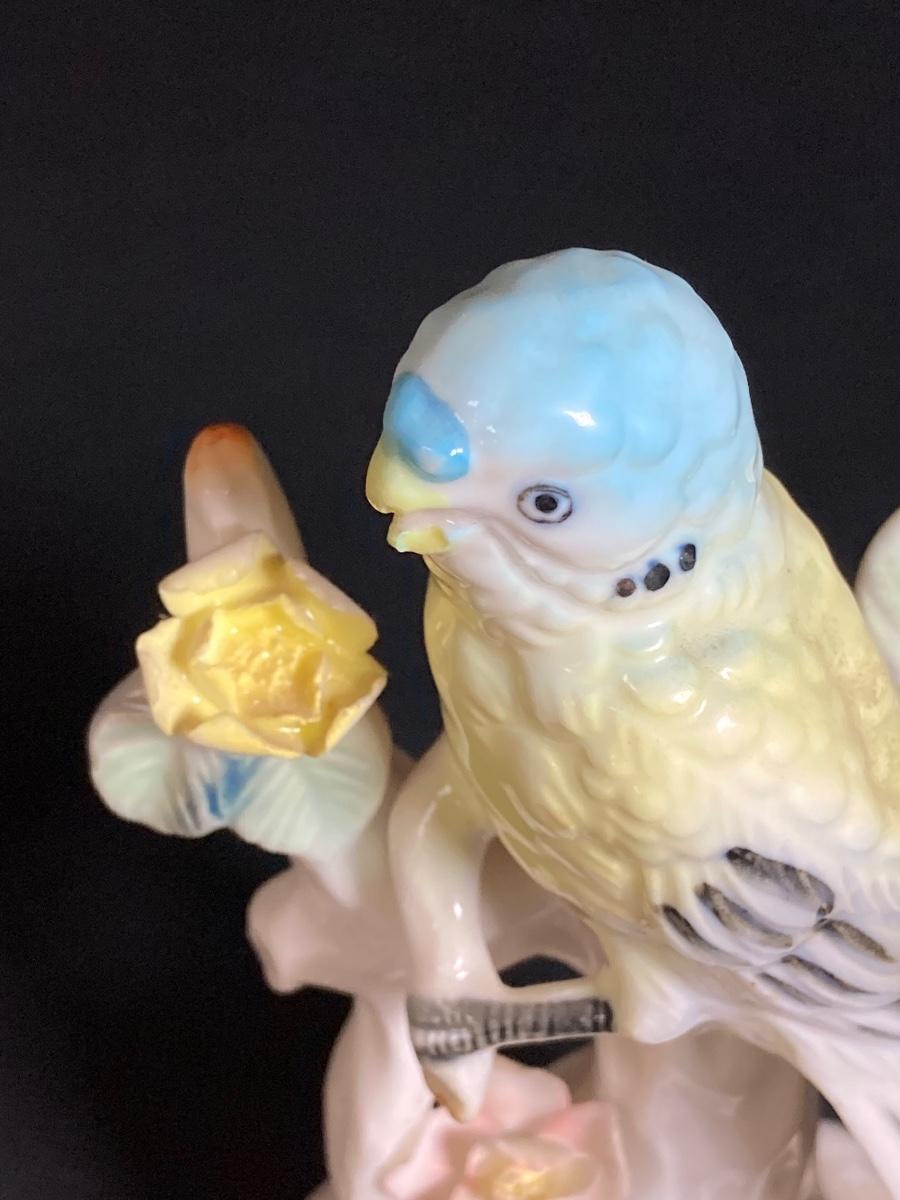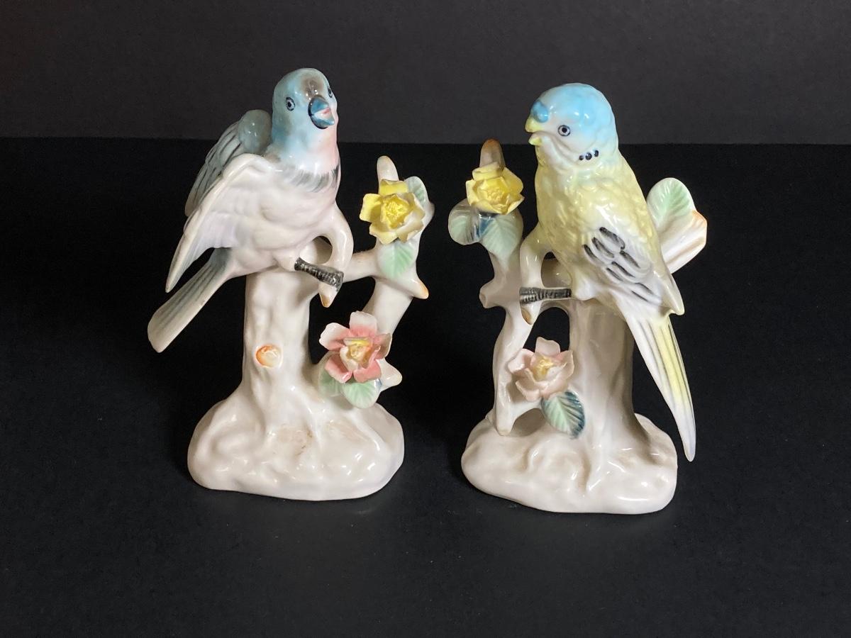 LOT 201: Lefton Floral Serving Plate, Vintage Blue Bird / Parakeet Bird Figurines, Art Vannes France Bowl, Rosella Pink Double Bowl and Miniature Floral Trinket Boxes