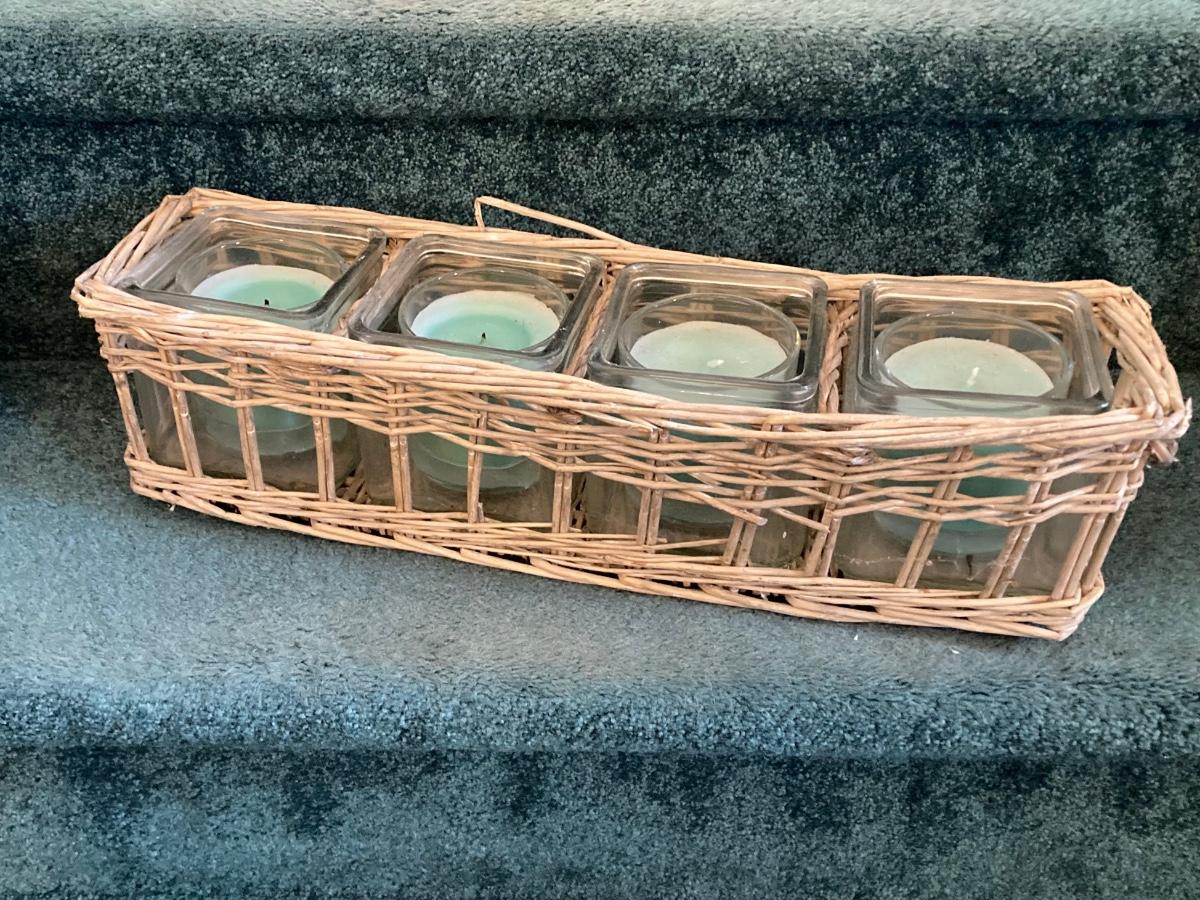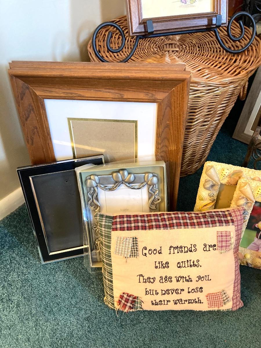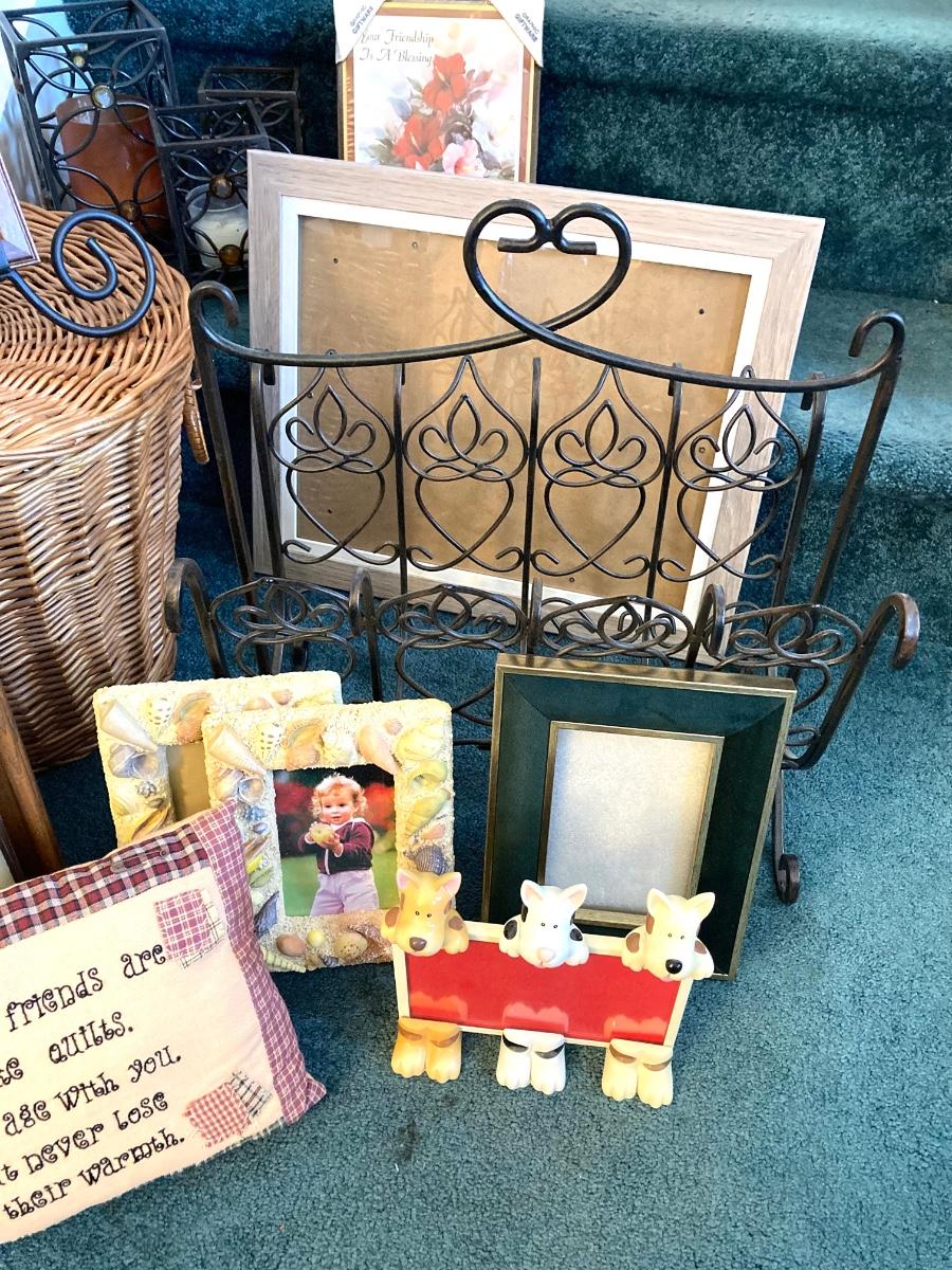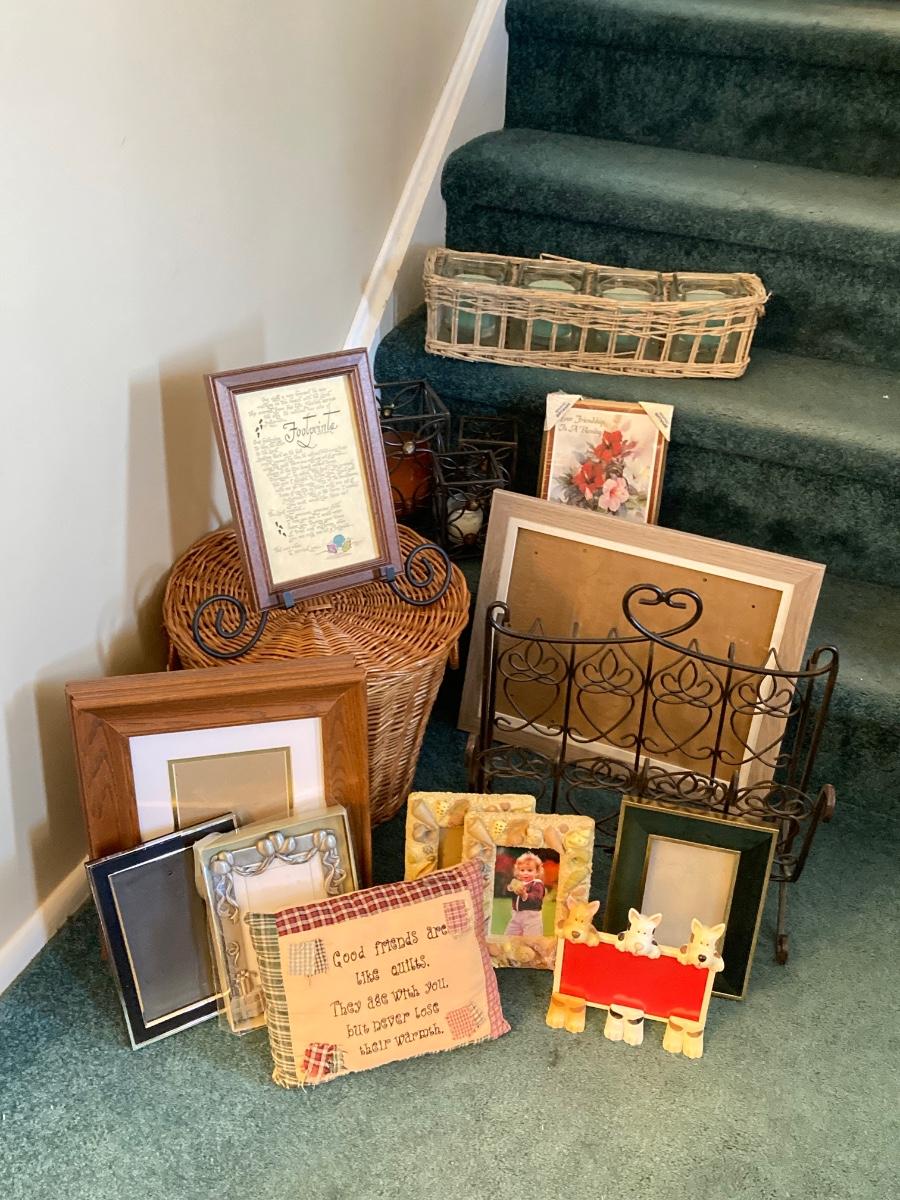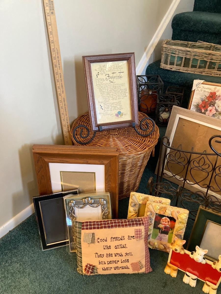 LOT 202: Large Home Decor Collection - Wicker Basket, Frames, Easel, Prints, Candles, Candle Holders and More
