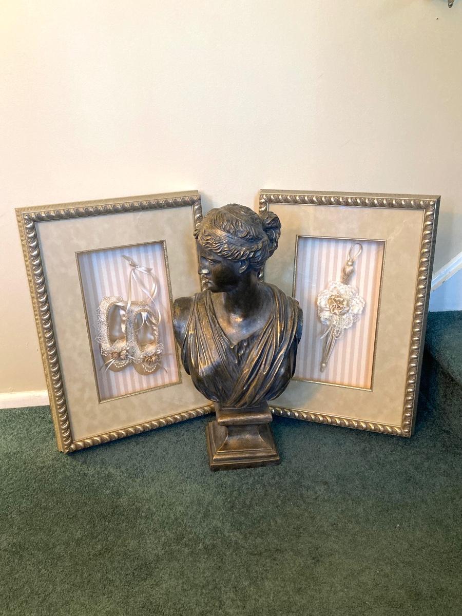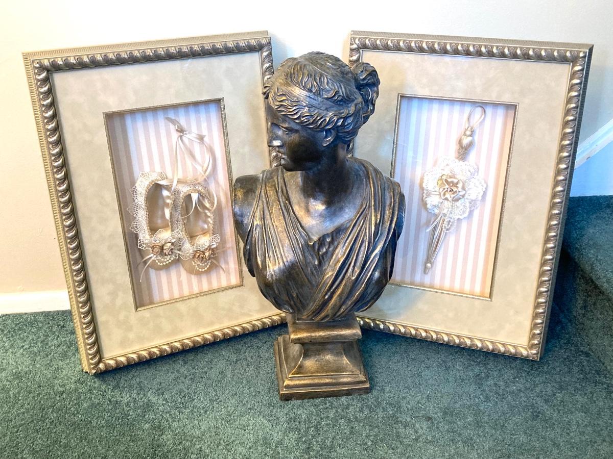 LOT 203: Decorative Resin Bust / Statue and Pair of Artex Inc. Shadow Boxes
