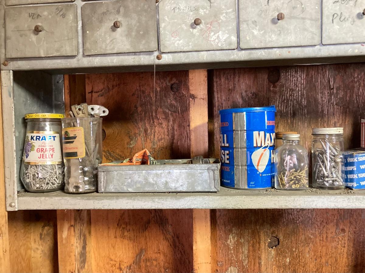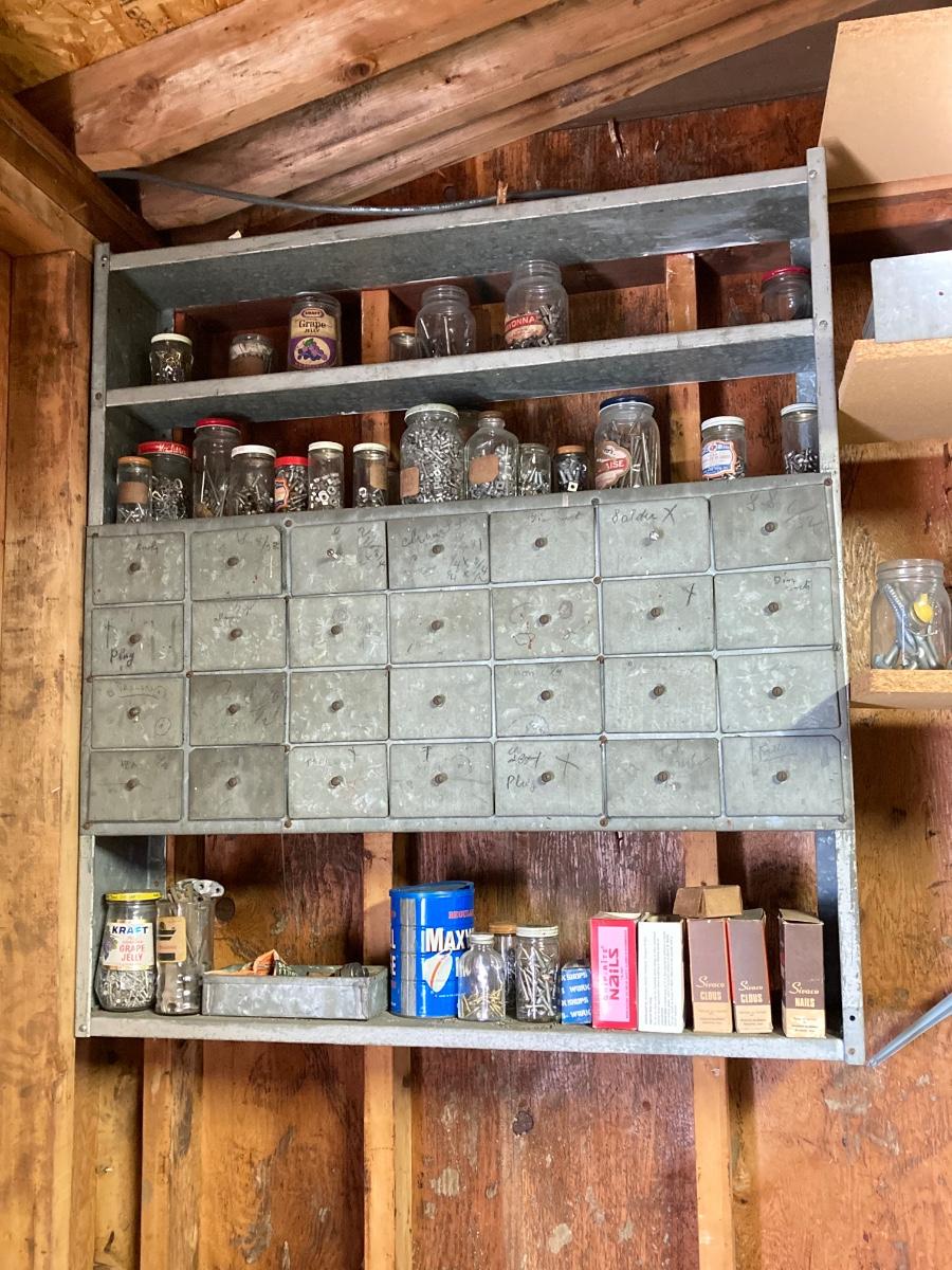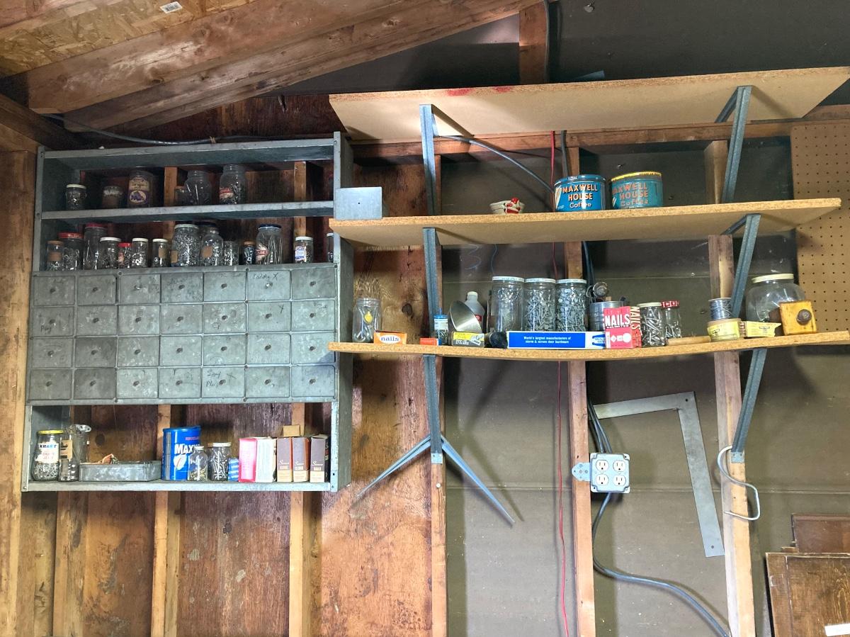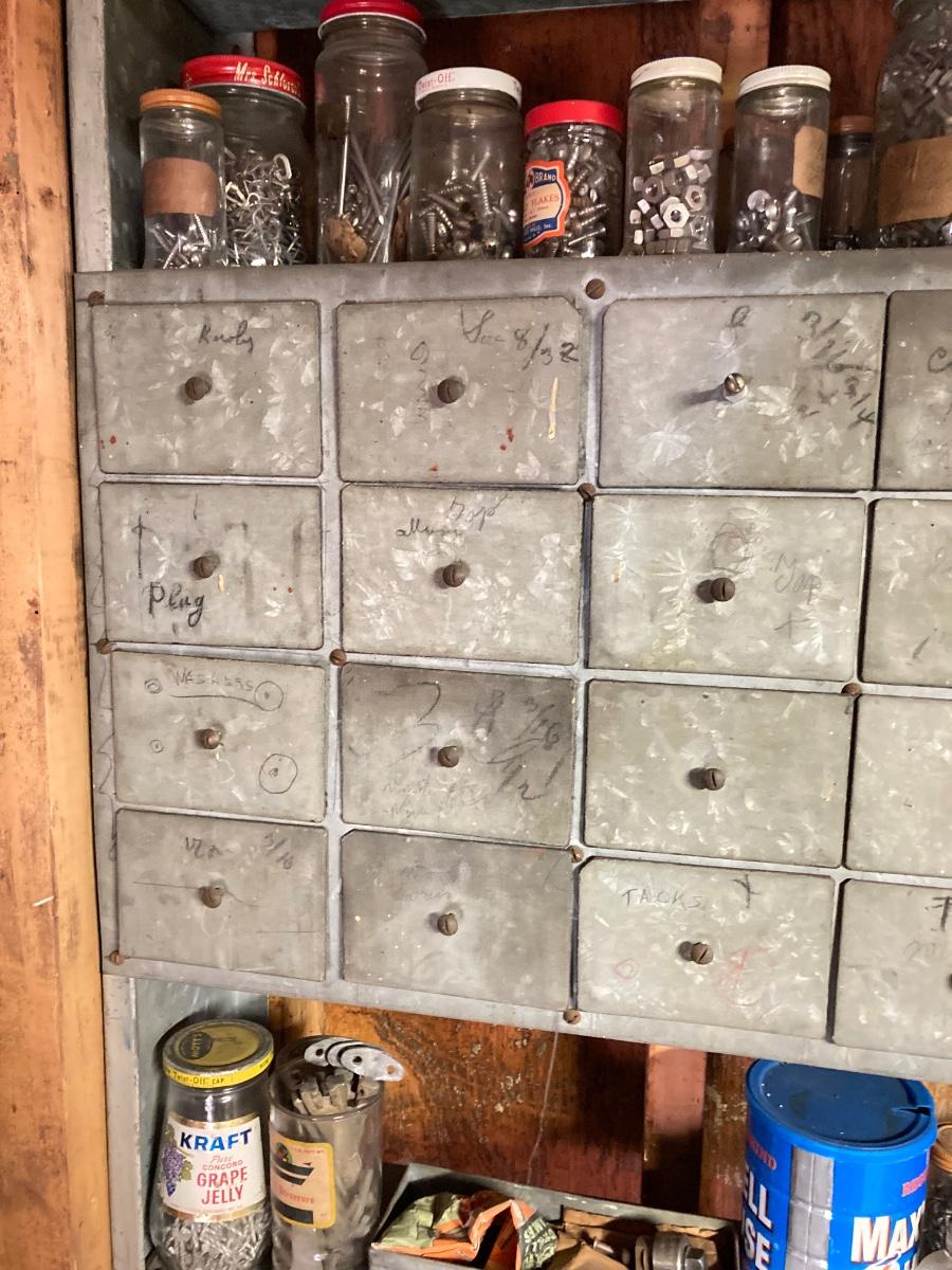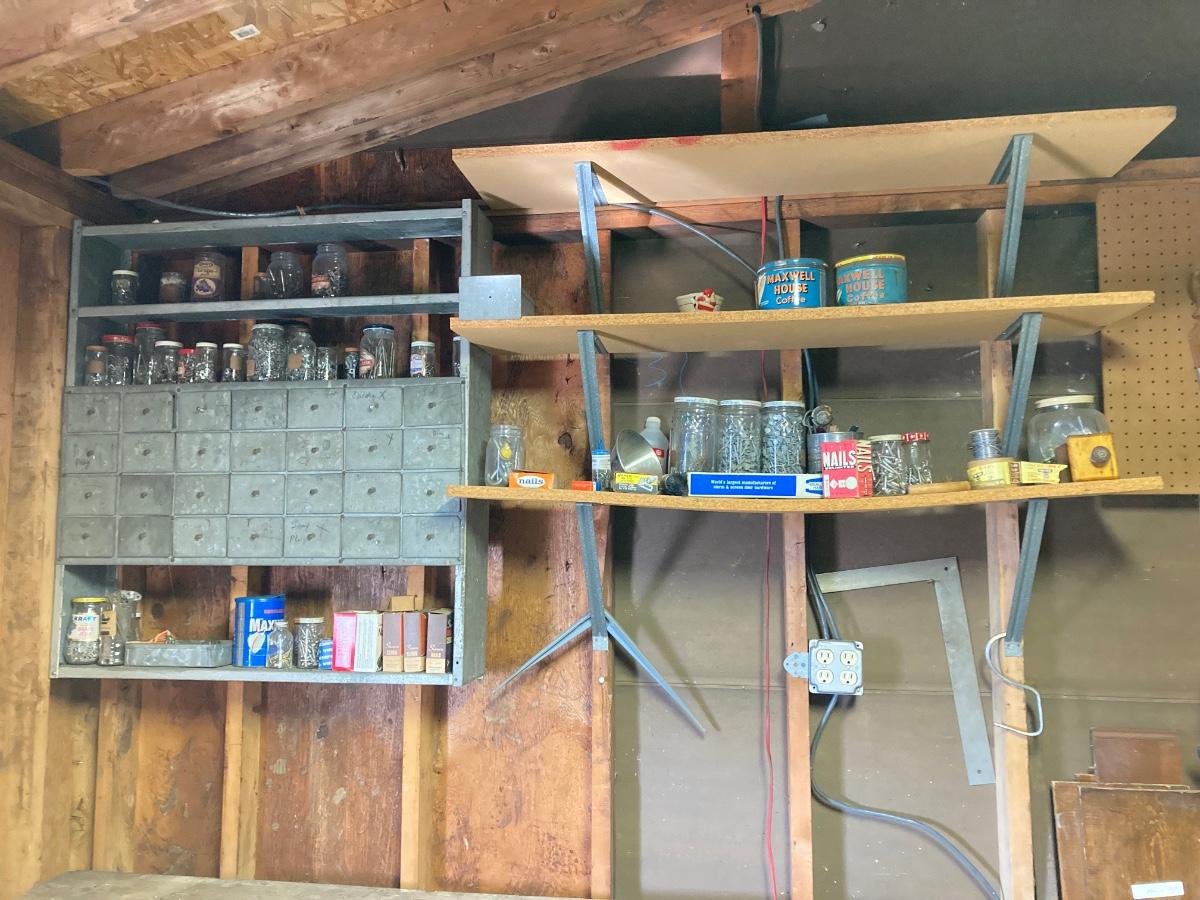 LOT 204: Large Galvanized Hardware Storage / Organizer with Contents, Including Items on Two Shelves