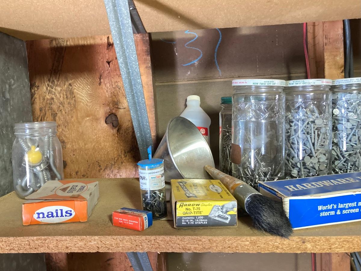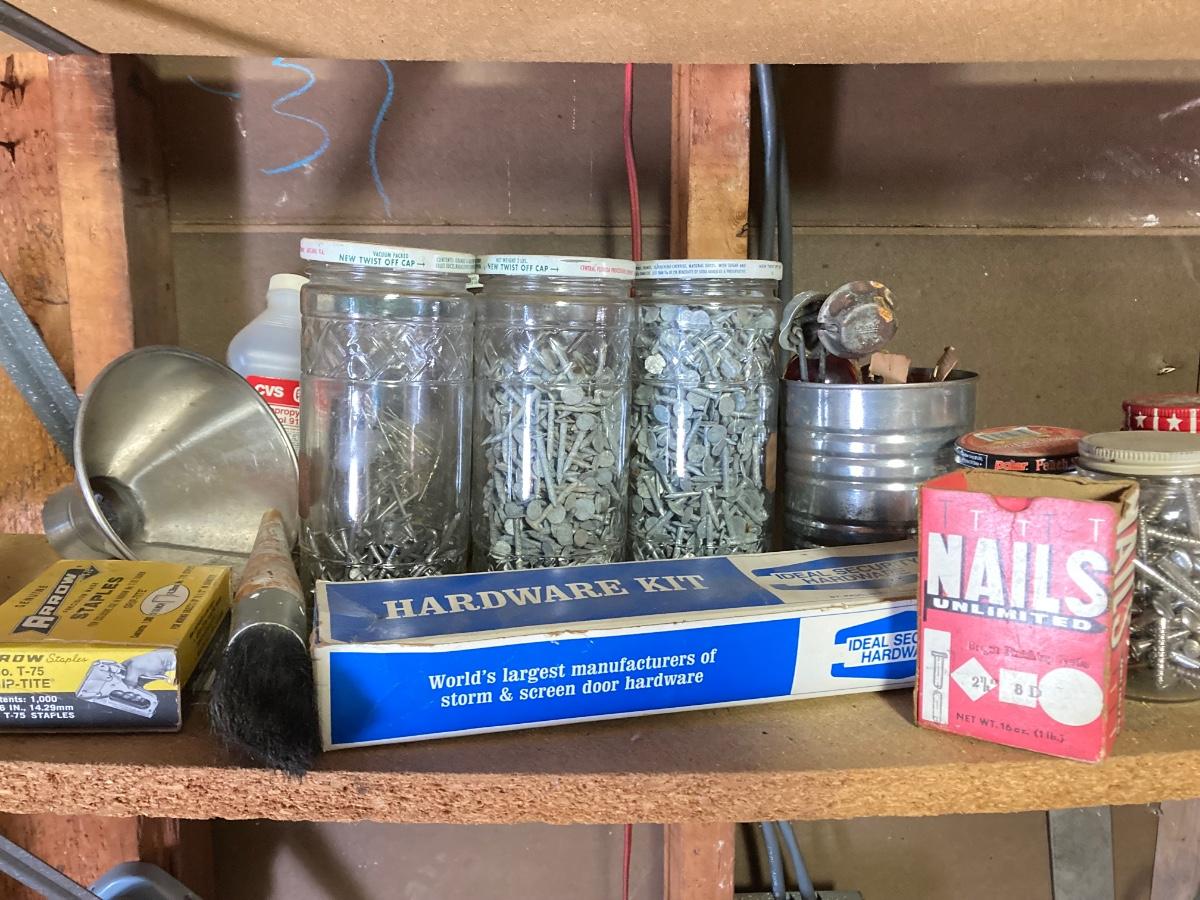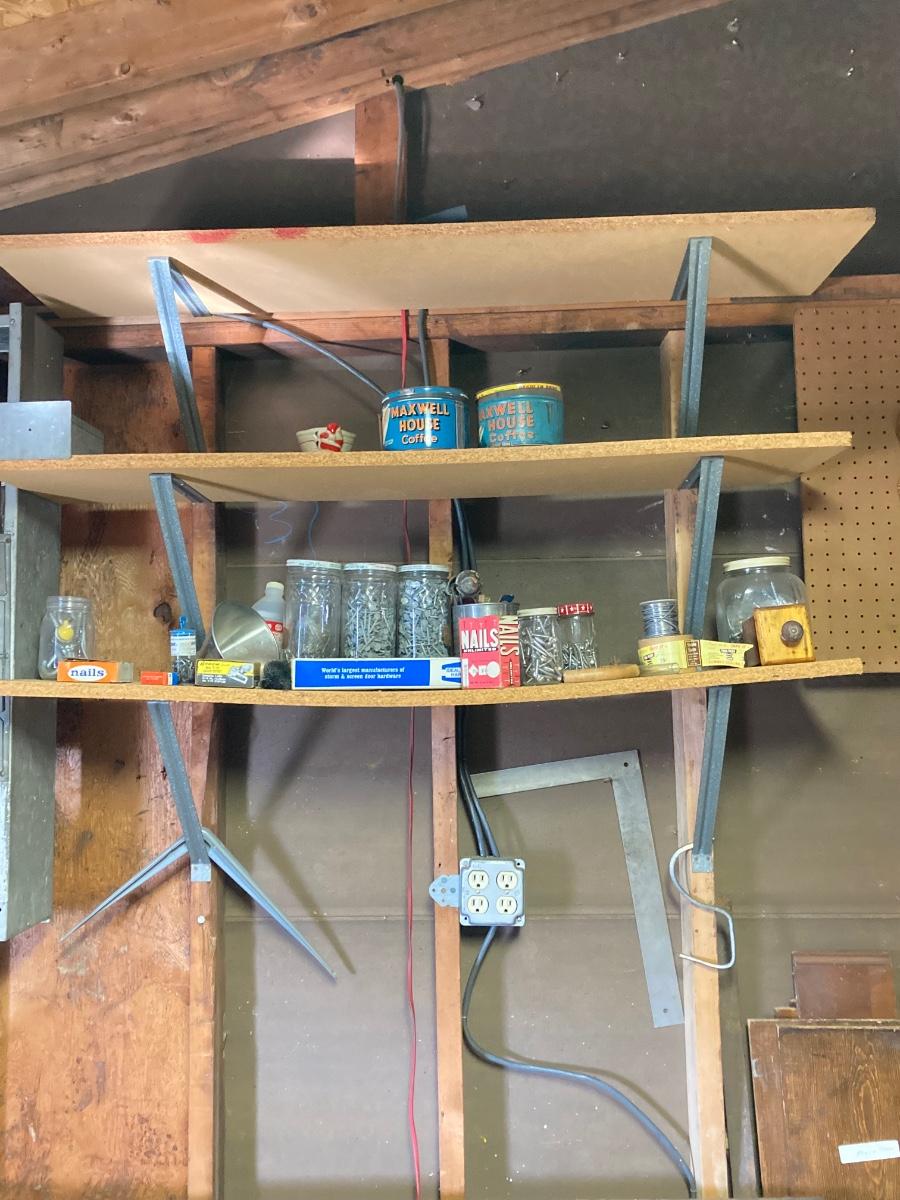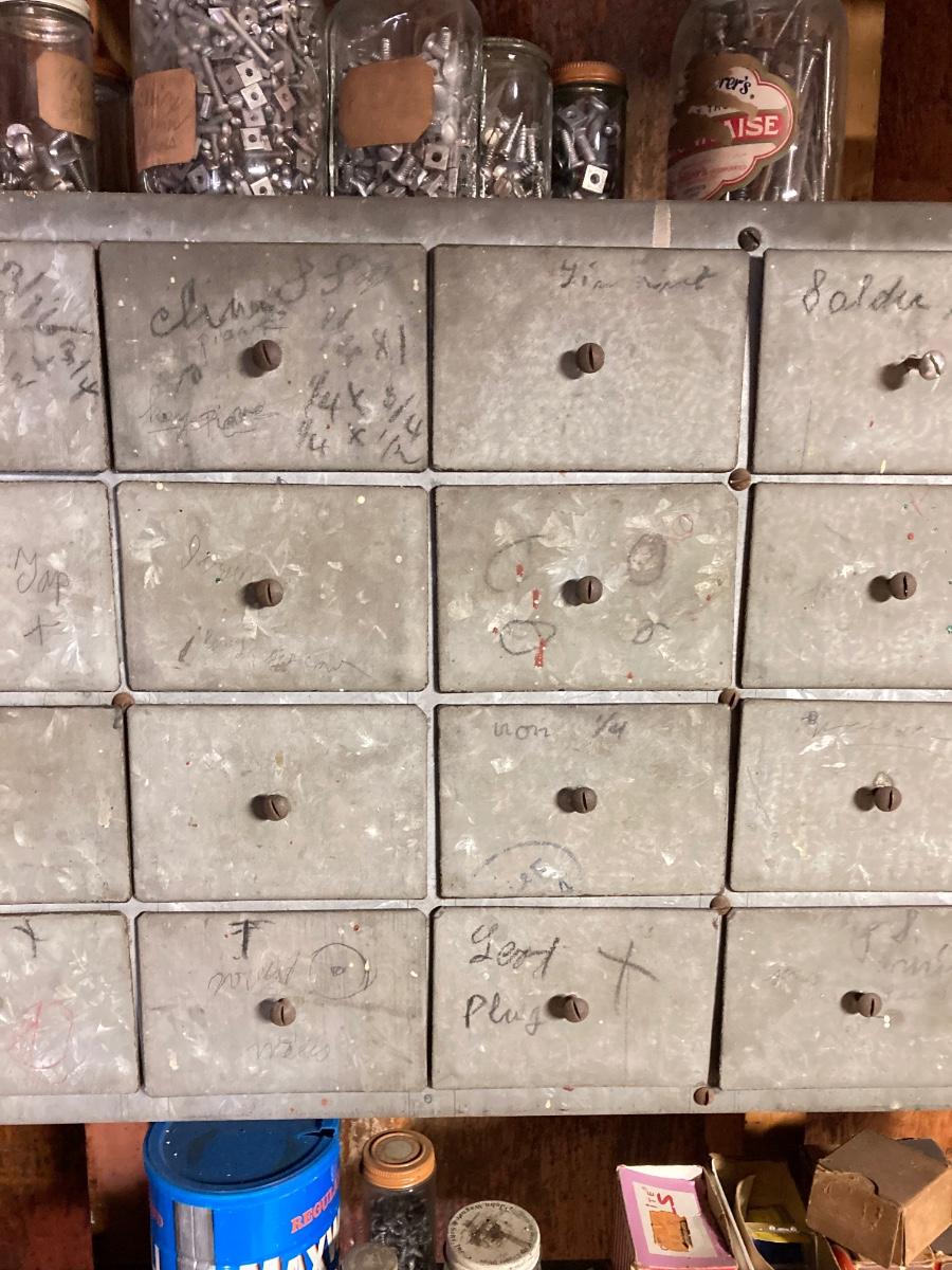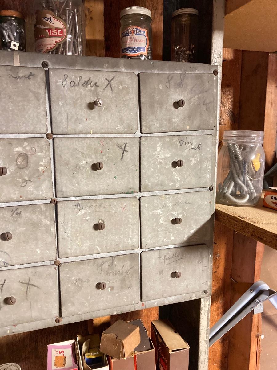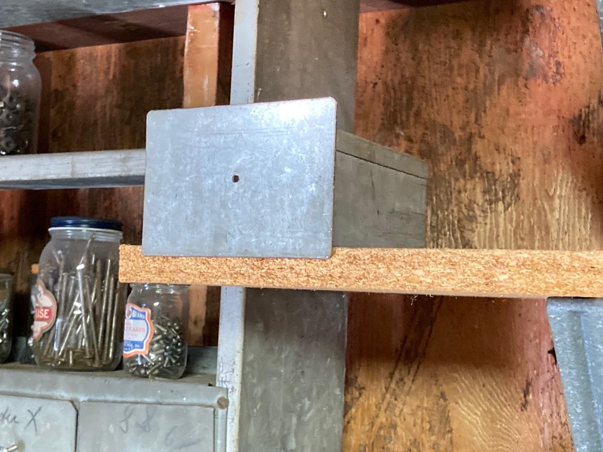 LOT 204: Large Galvanized Hardware Storage / Organizer with Contents, Including Items on Two Shelves