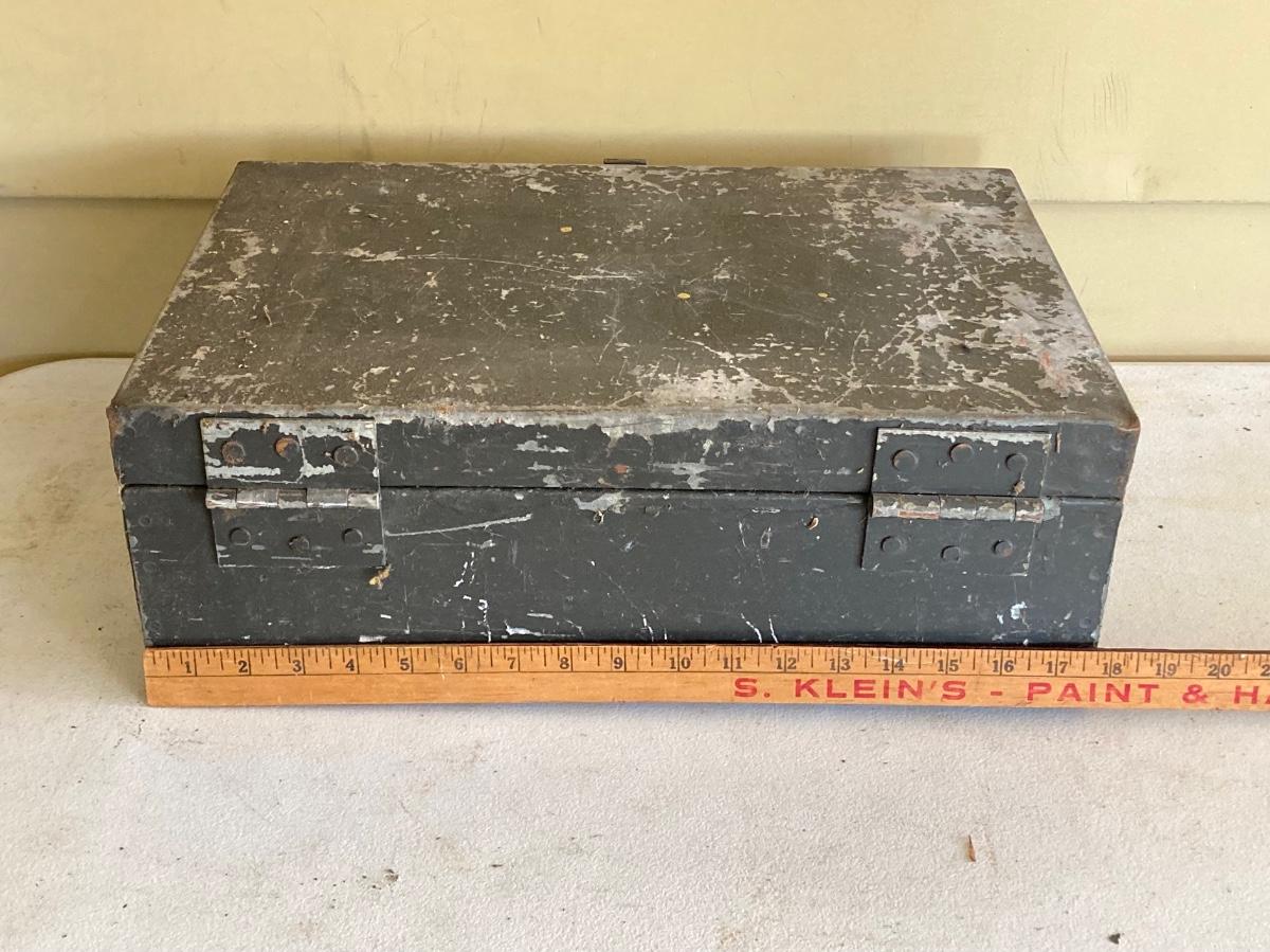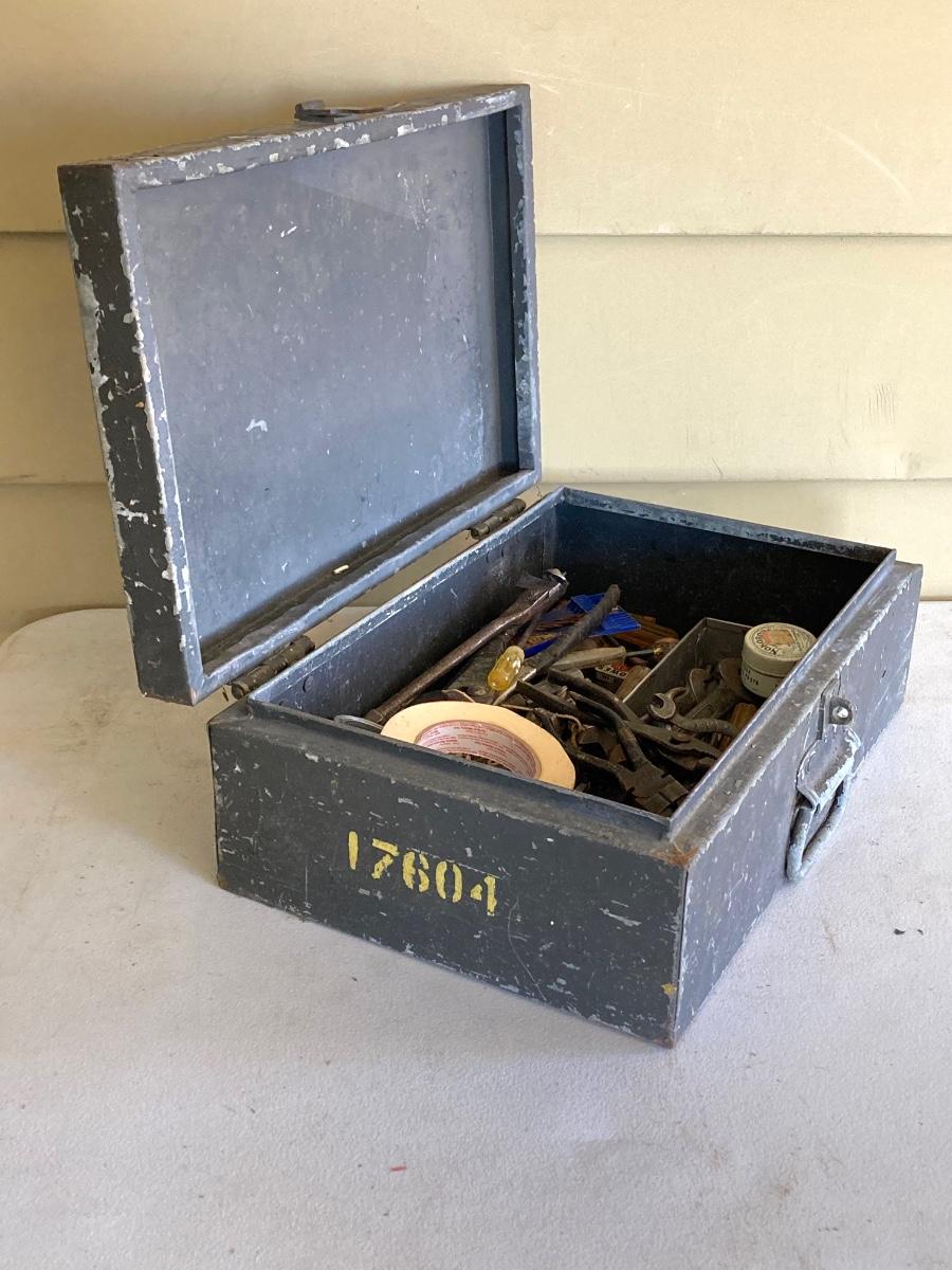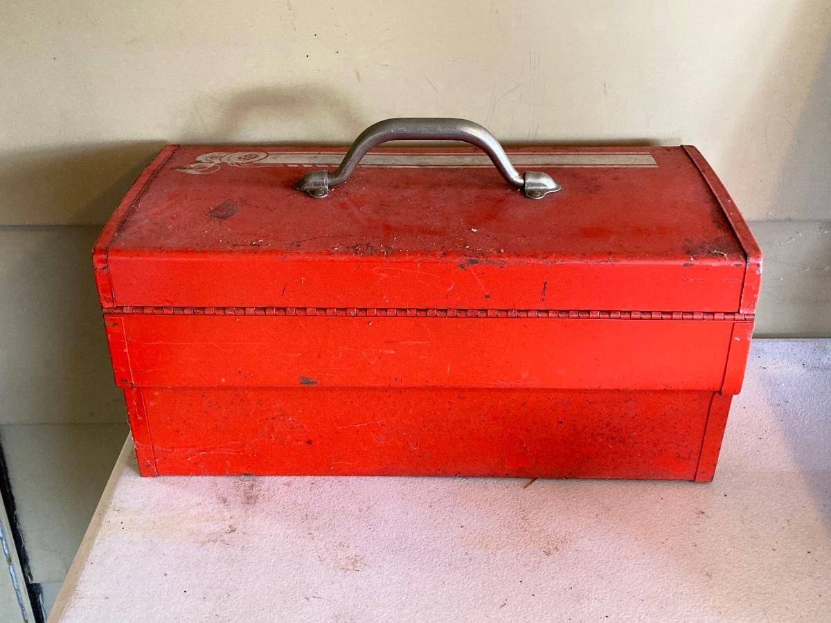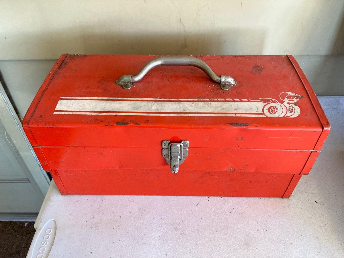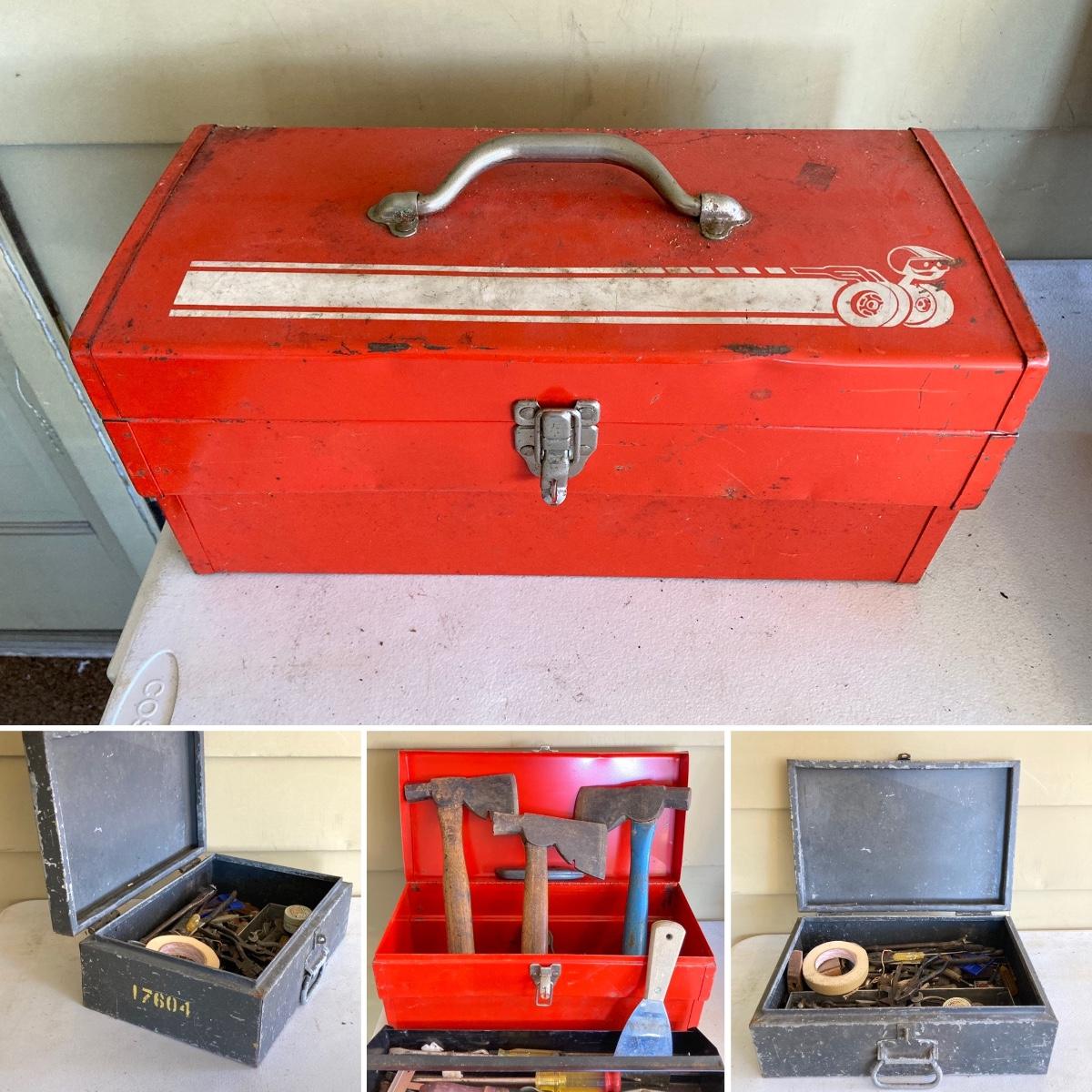 LOT 208: Two Vintage Metal Toolboxes with Contents - Red Mopar Dodge and Olive Drab