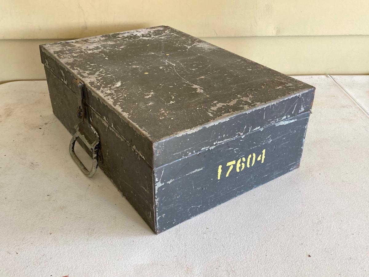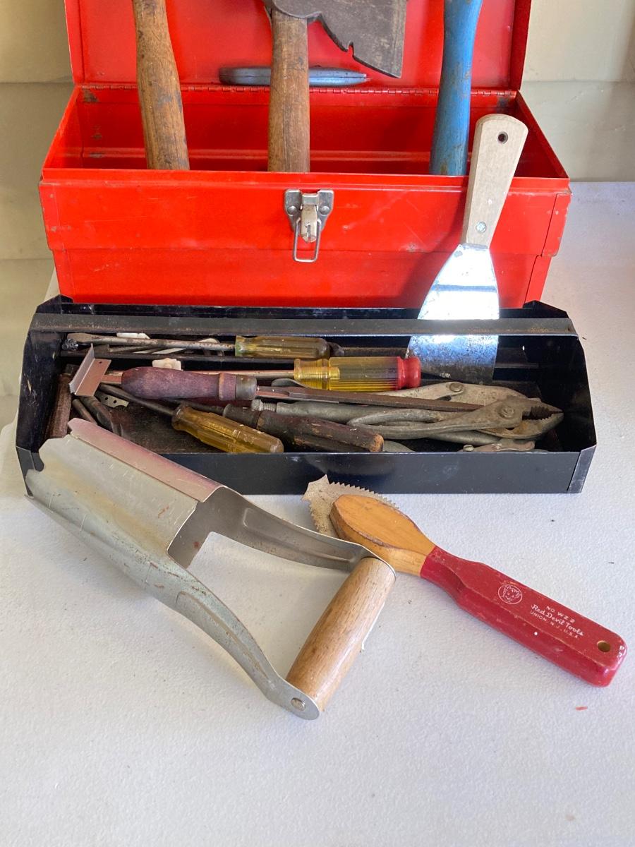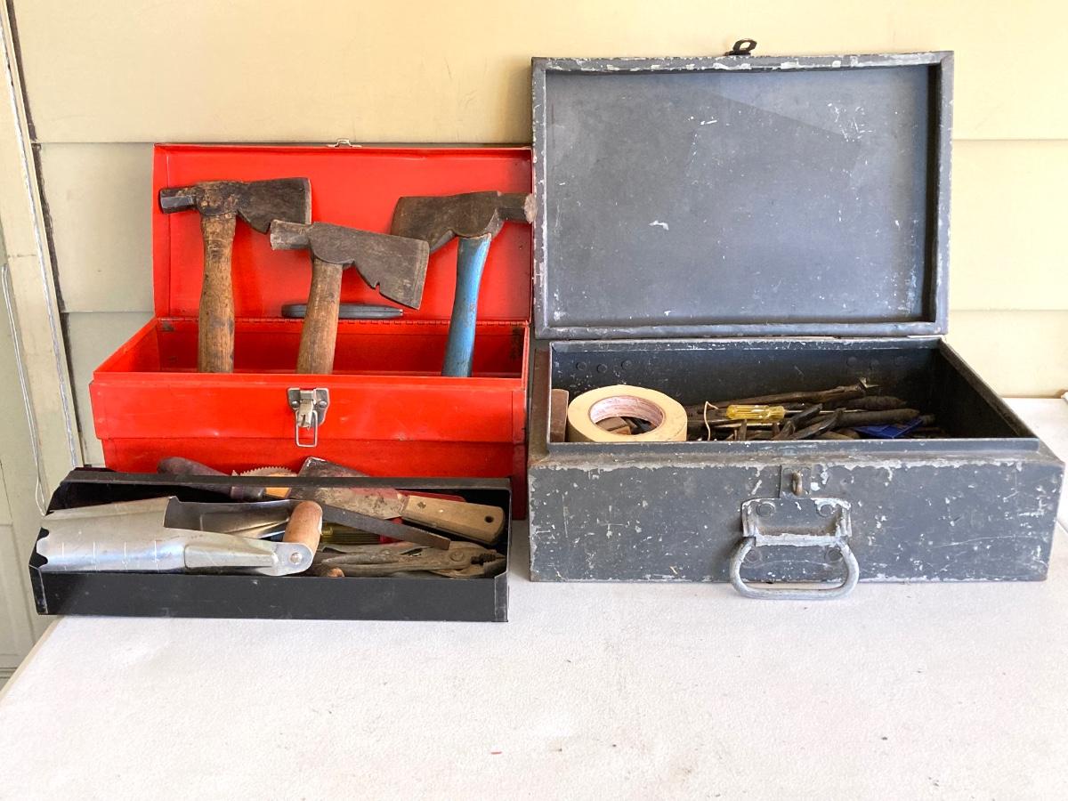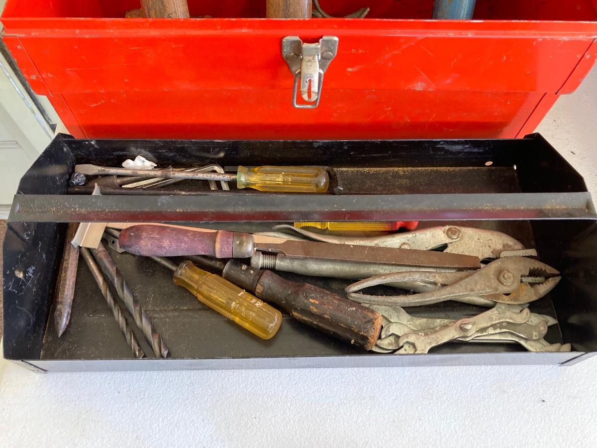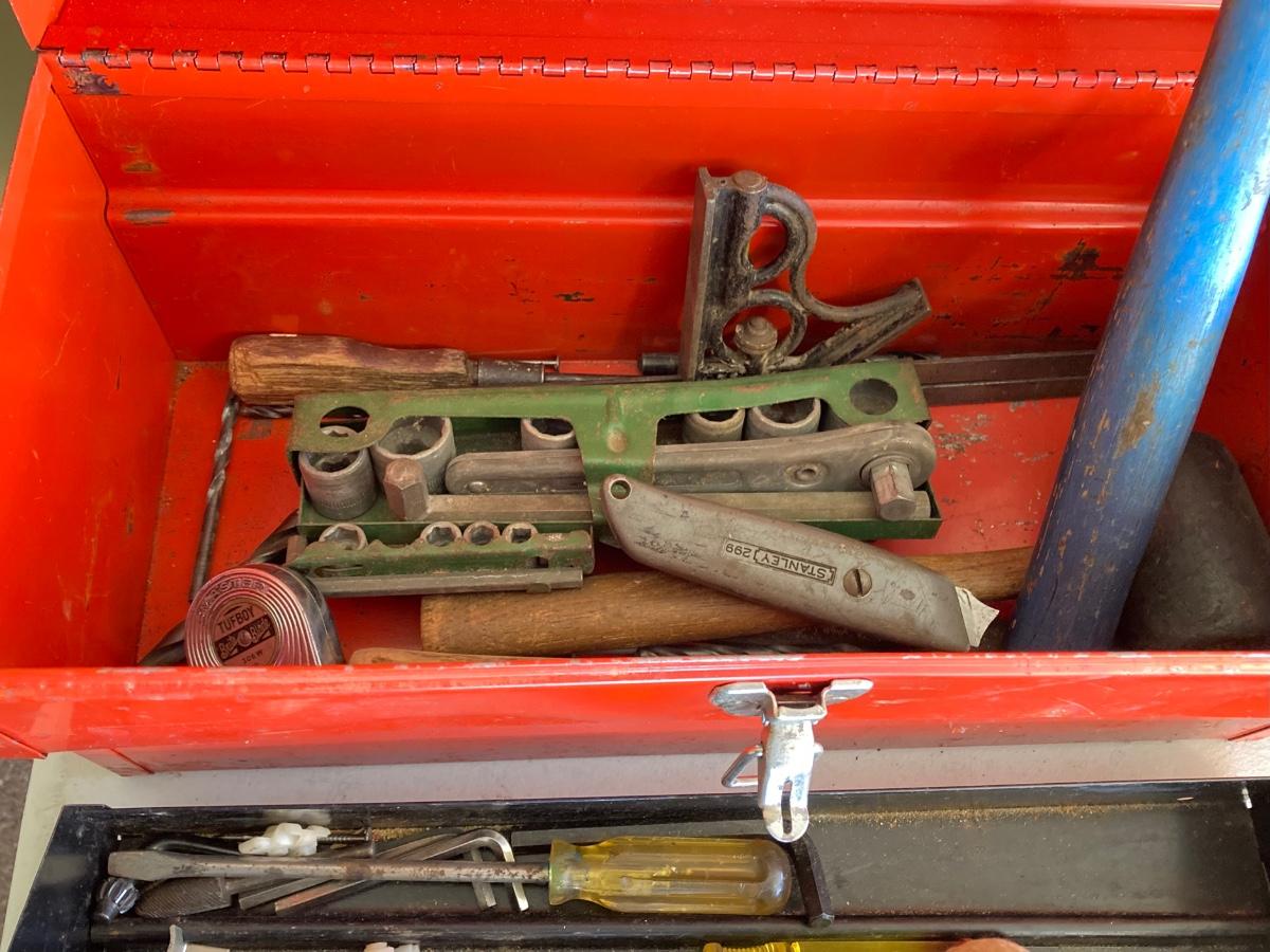 LOT 208: Two Vintage Metal Toolboxes with Contents - Red Mopar Dodge and Olive Drab