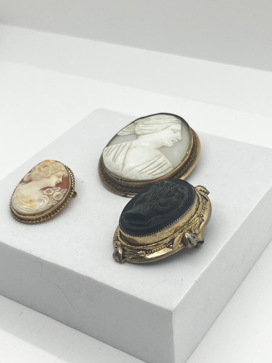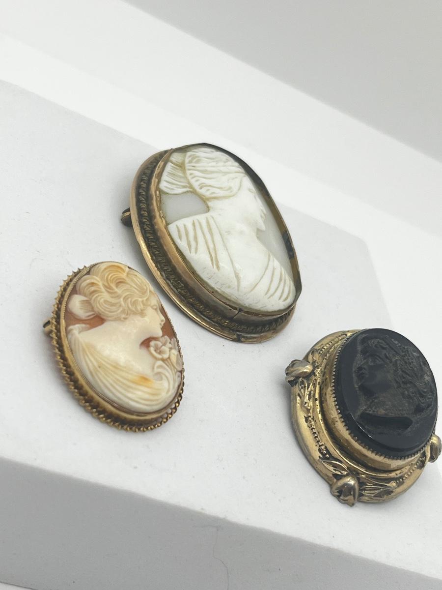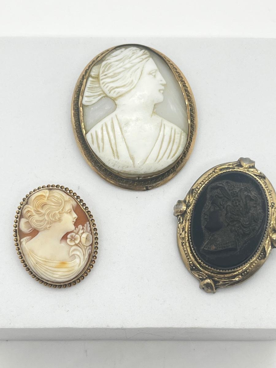 LOT 191J: Three Antique/Vintage Cameo Brooches - One Marked 10K Gold -White Mother of pearl is a Pendant/Brooch