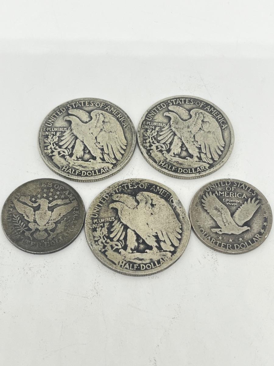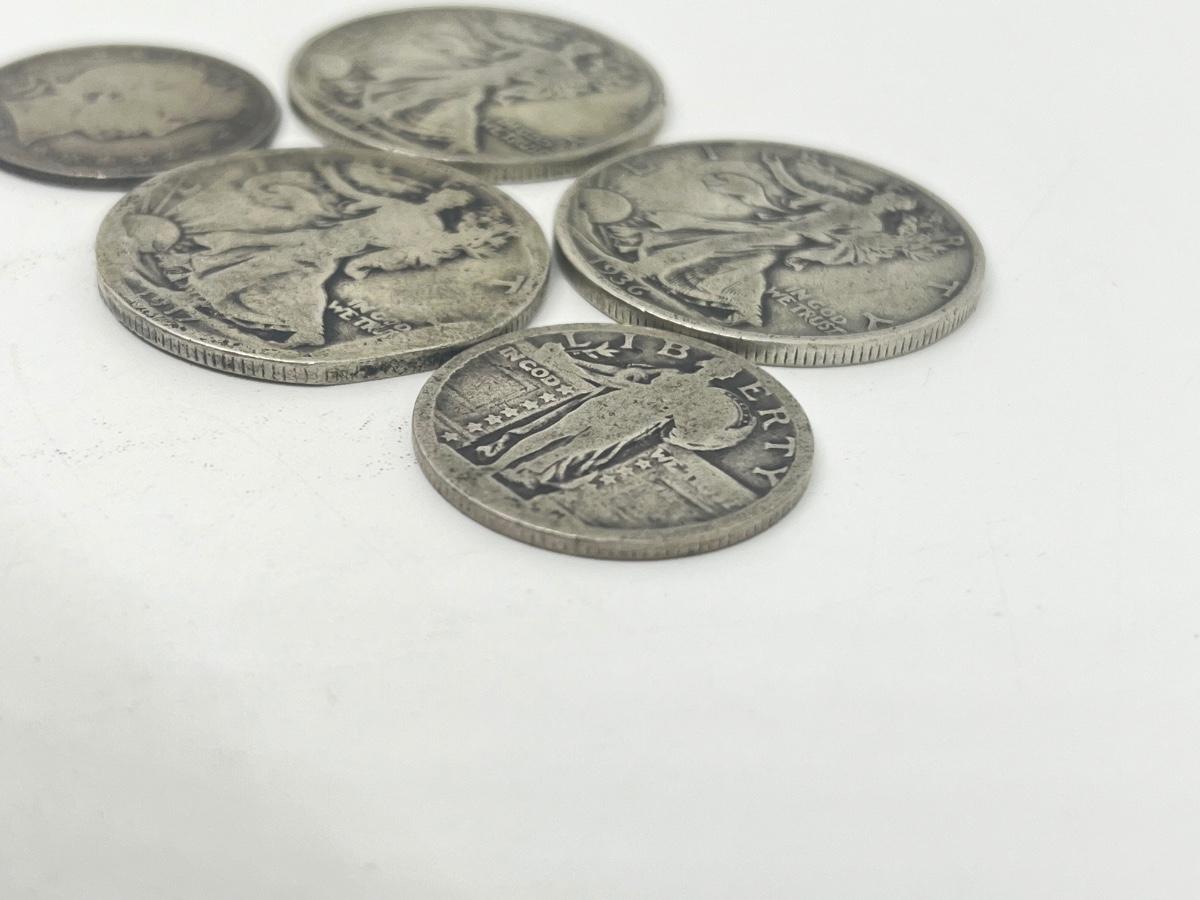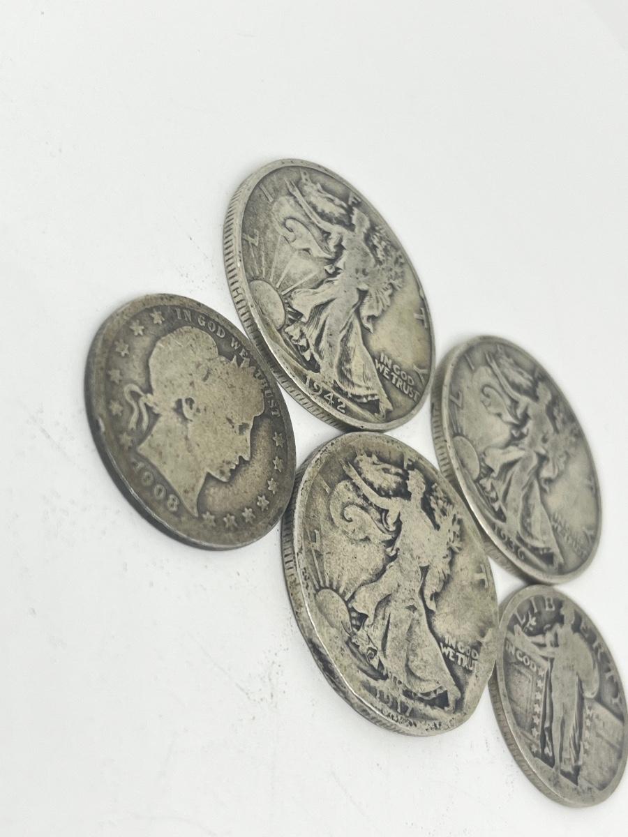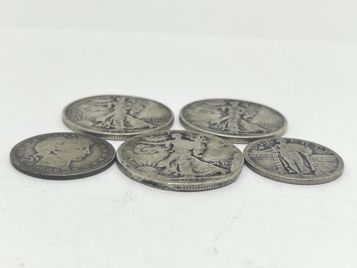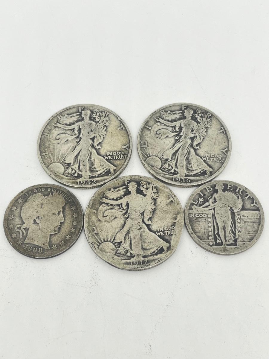 LOT 232J: Antique / Vintage Silver US Coins - 1917, 1936-D, 1942 Walking Liberty Half Dollars, 1908-O Barber Quarter, Standing Liberty Quarter - No Visible Date