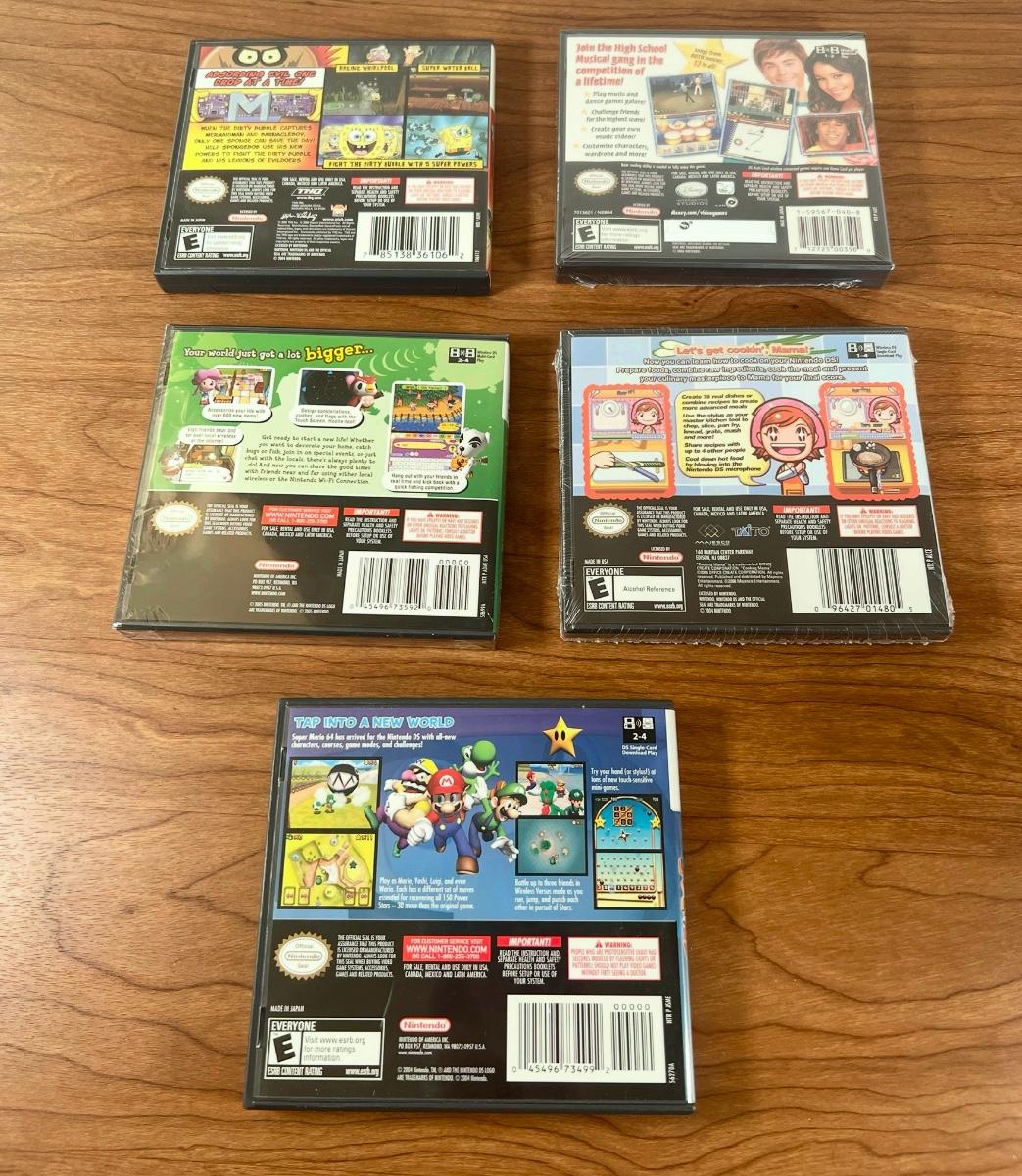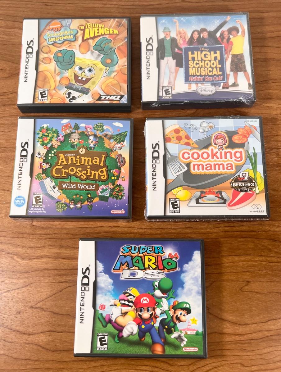 LOT 99B: Nintendo DS Games, (NIB) Animal Crossing Wild World, (NIB) Cooking Mama, Super Mario 64 for the DS, (NIB) Highschool Musical “Makin’ the Cut!”, SpongeBob SquarePants “The Yellow Avenger”
