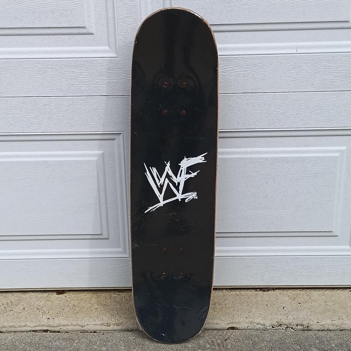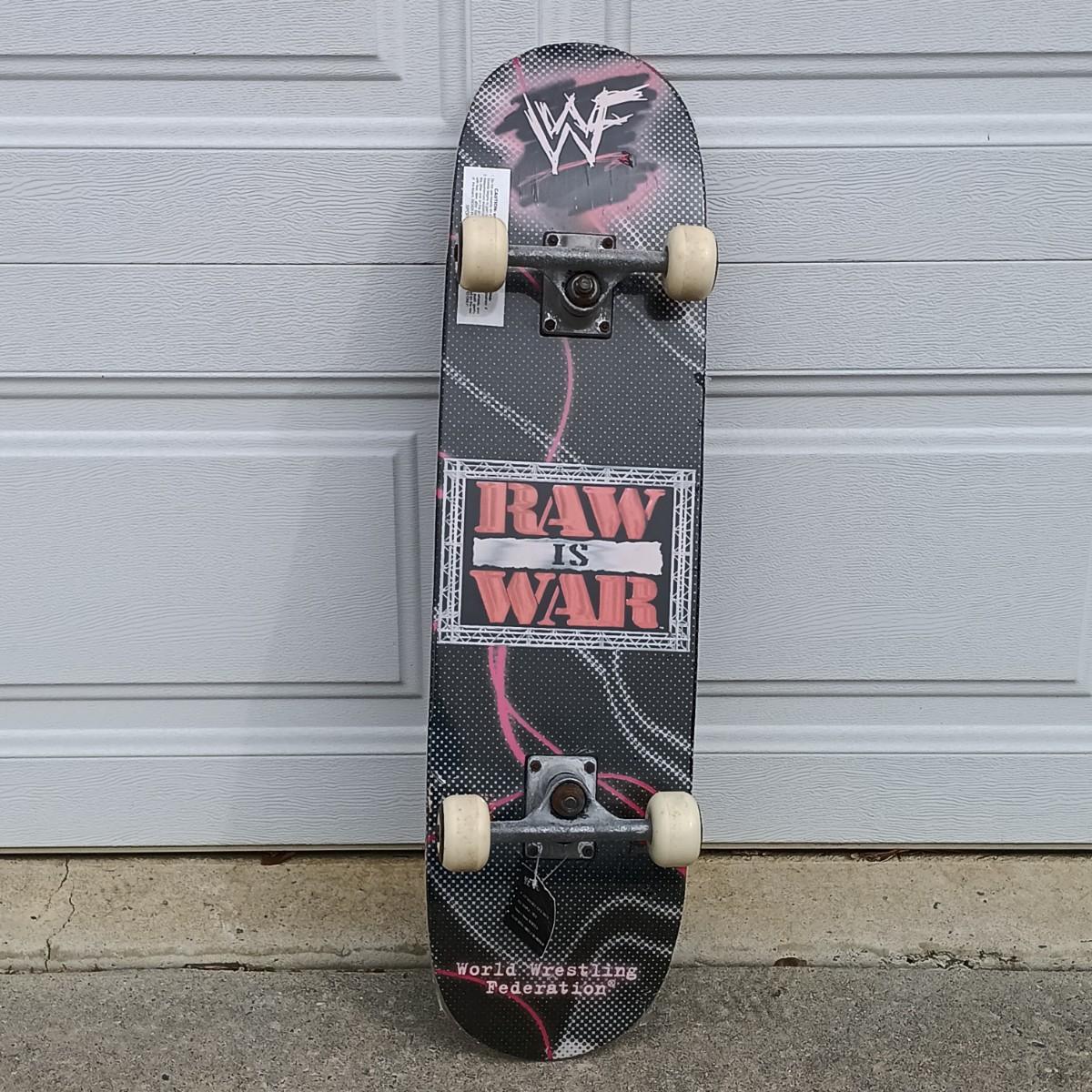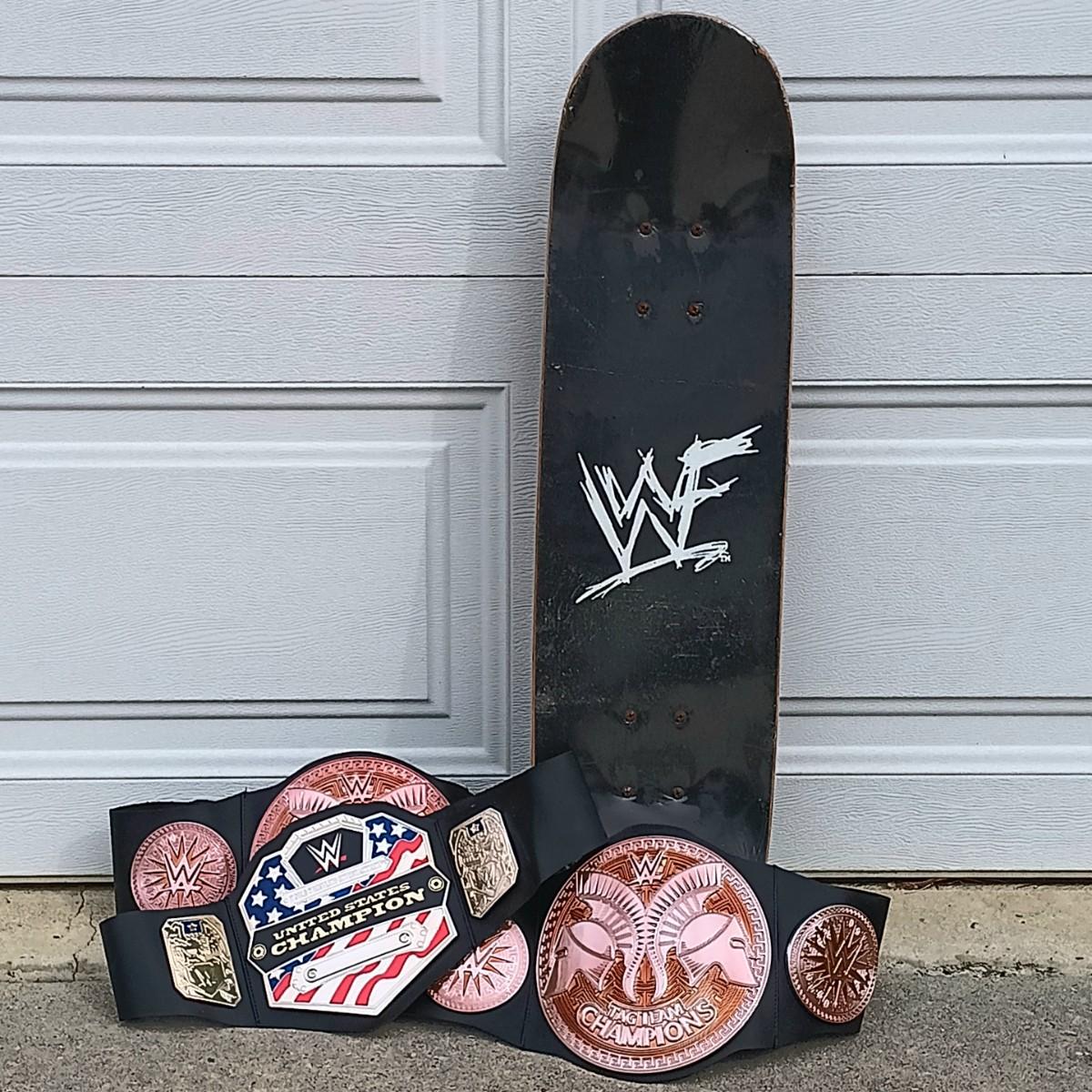 LOT 118A: WWE 2014 Tag Team Championship Kids Belts w/ 90s WWF 'Raw is War' Skateboard