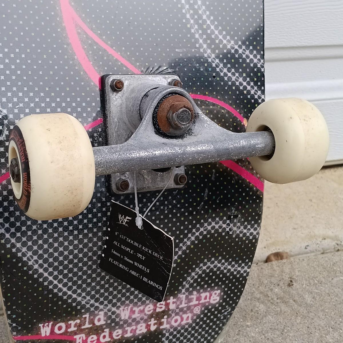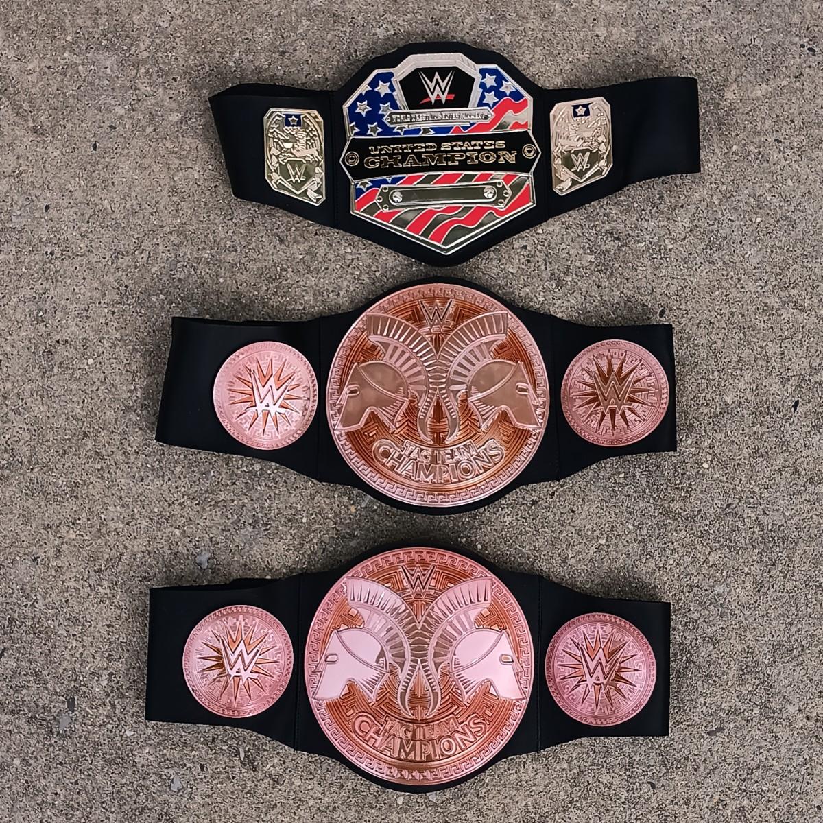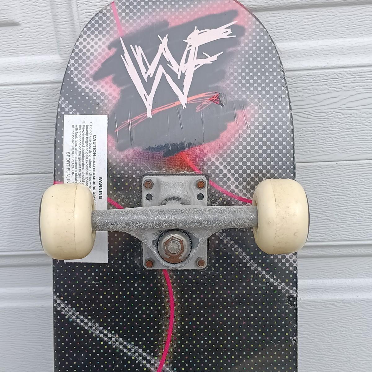LOT 118A: WWE 2014 Tag Team Championship Kids Belts w/ 90s WWF 'Raw is War' Skateboard