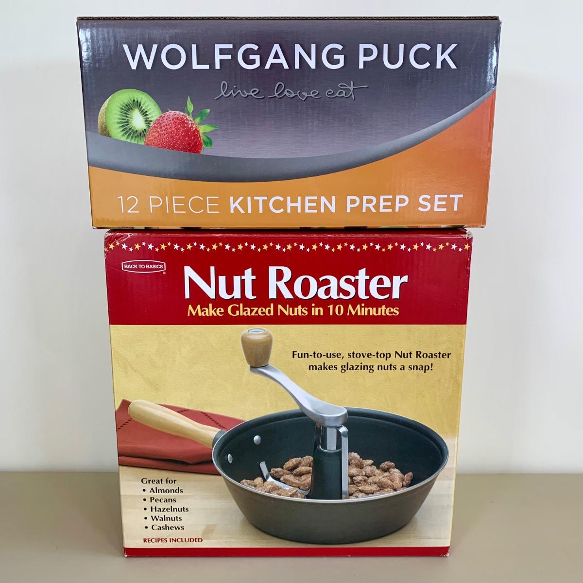LOT 129 A: NIP Back To Basics Nut Roaster & Wolfgang Puck 12 Piece Kitchen Prep Set
