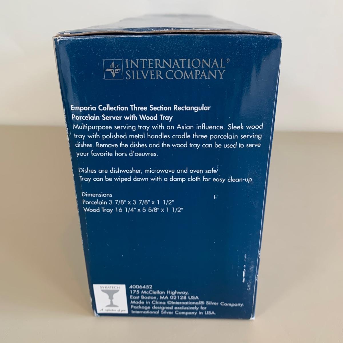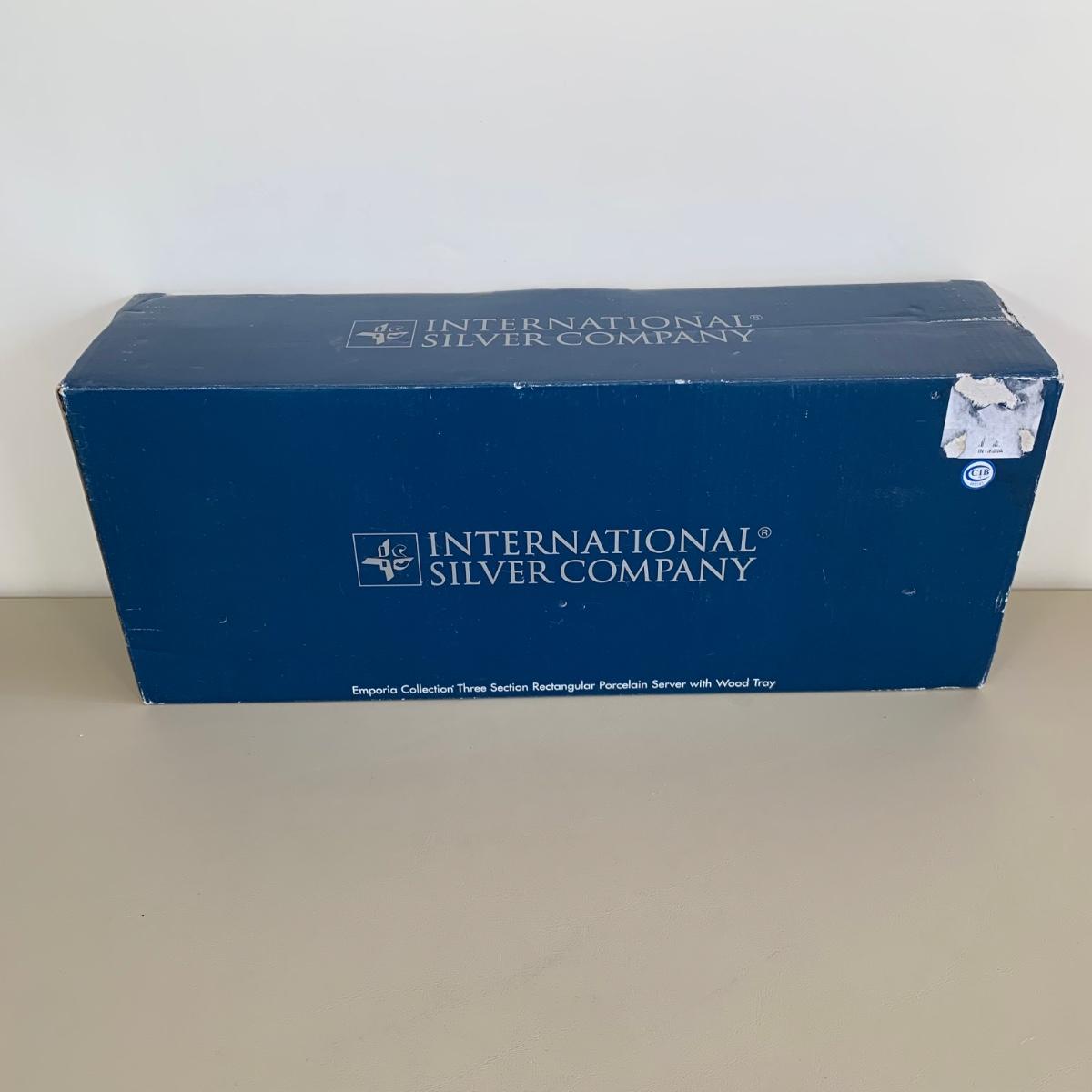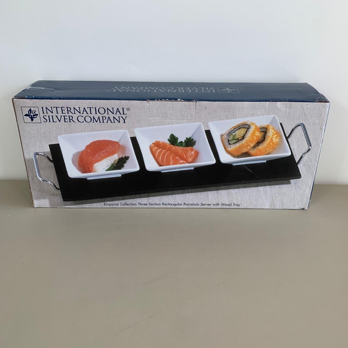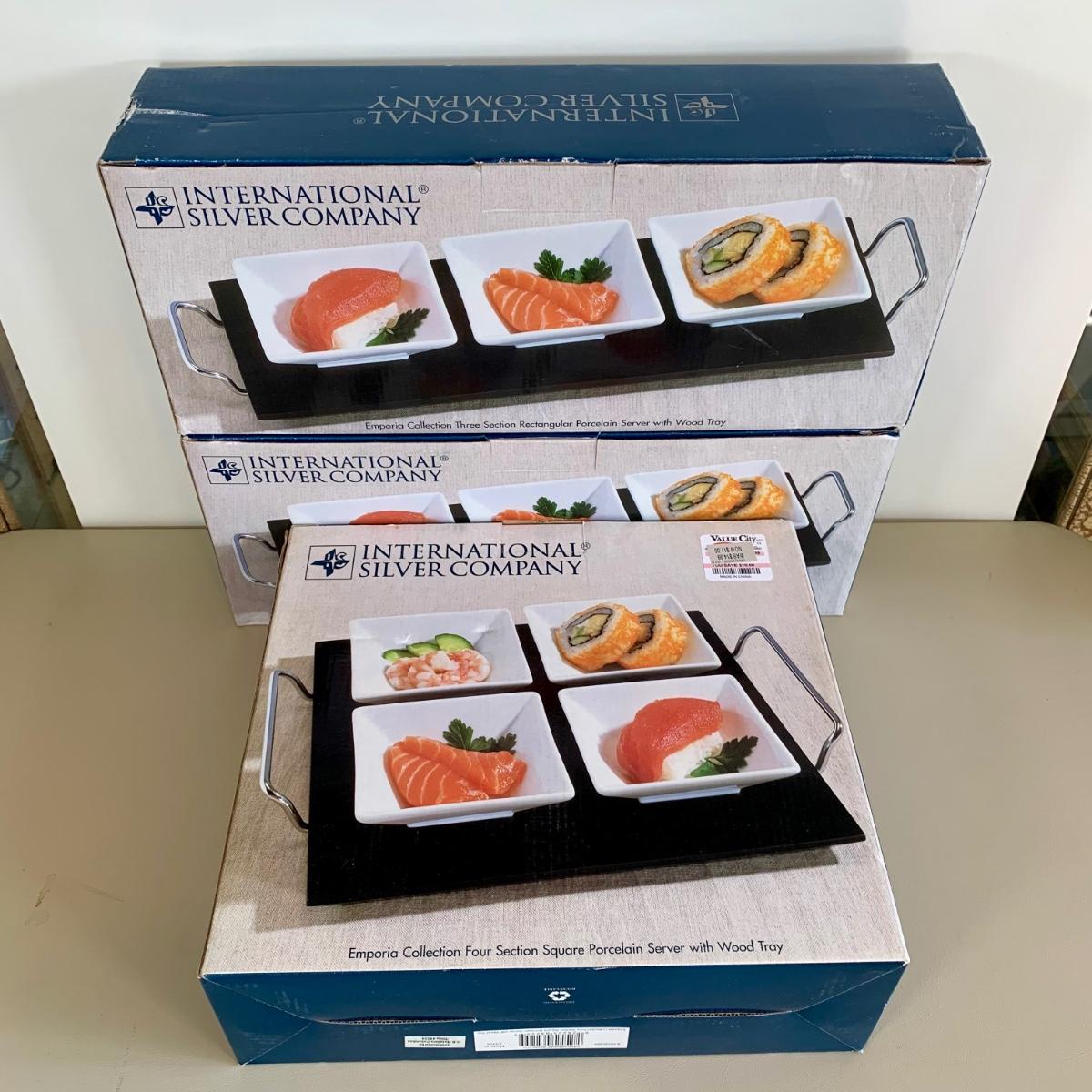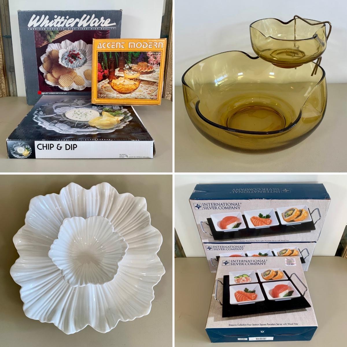 LOT 130 L: International Silver Co. Emporia Collection 4 & 3 Section Porcelain Servers w/ Wooden Trays, Anchor Hocking Accent Modern Honey Gold 3 Piece Chip & Dip Set & More