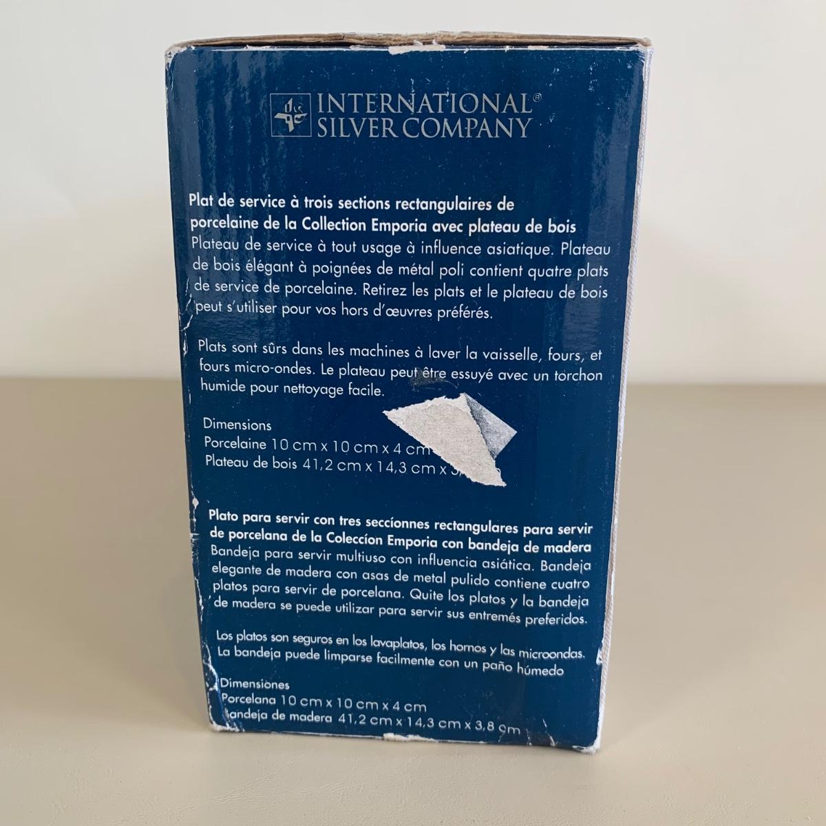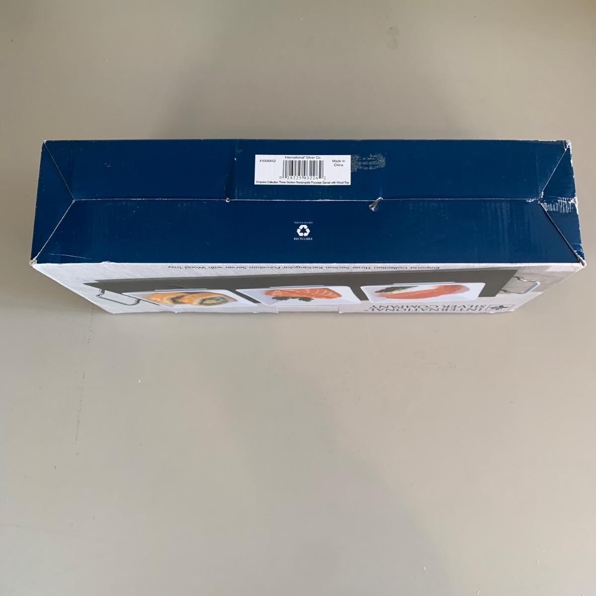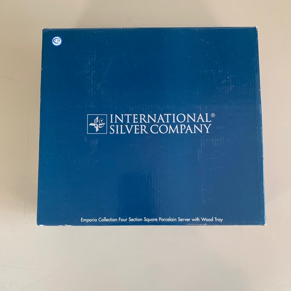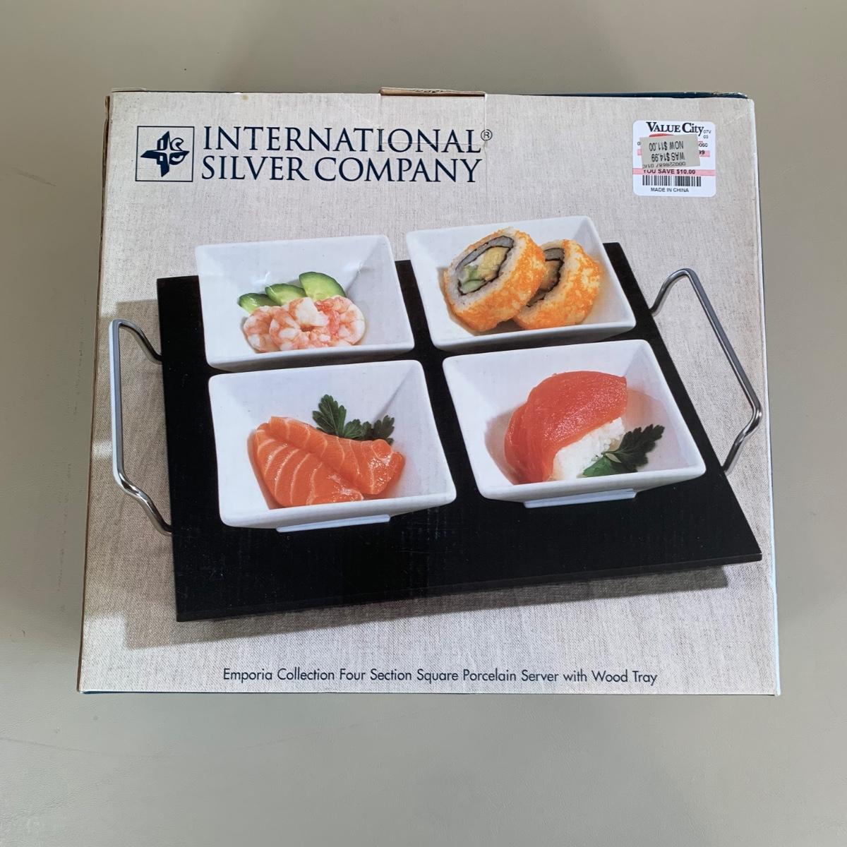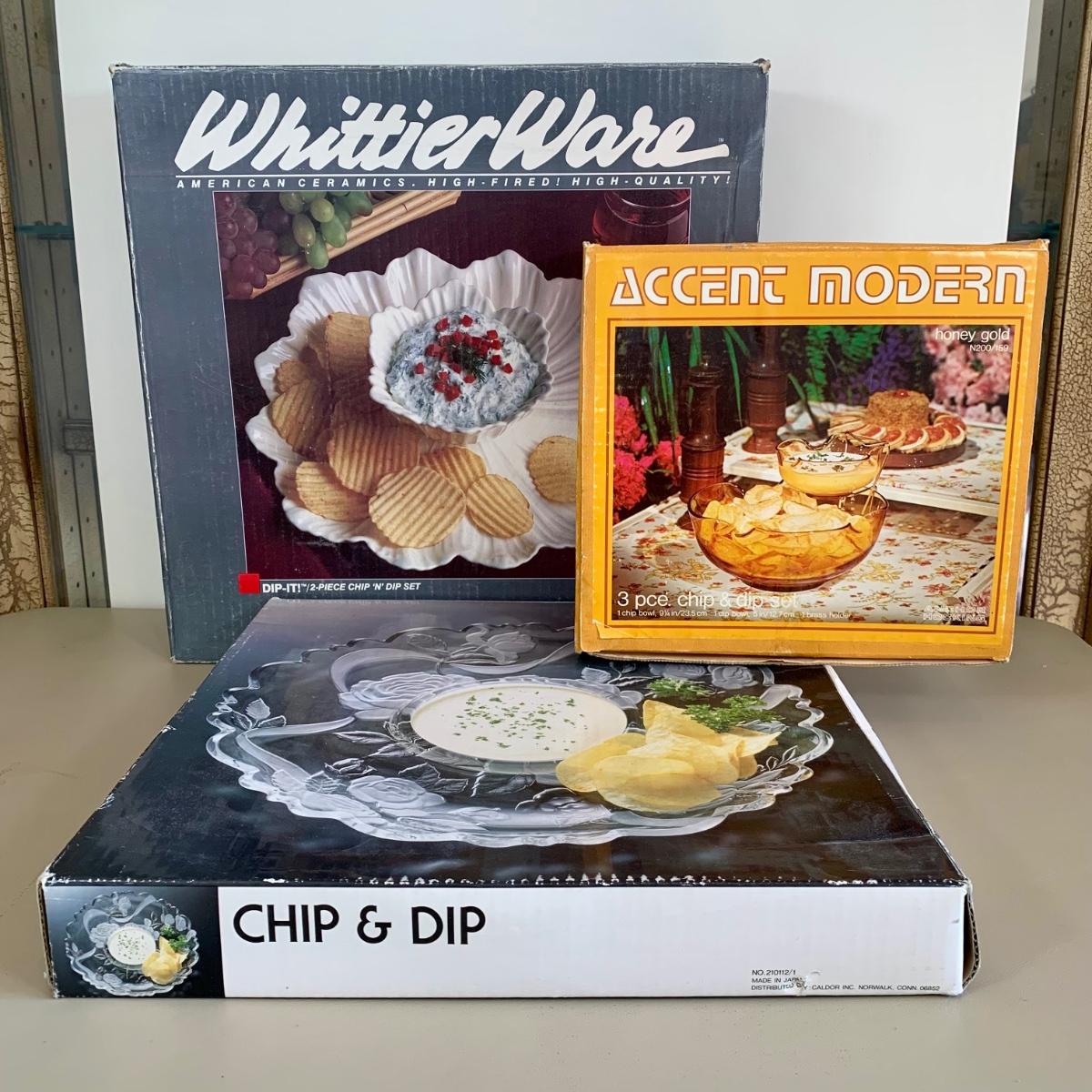 LOT 130 L: International Silver Co. Emporia Collection 4 & 3 Section Porcelain Servers w/ Wooden Trays, Anchor Hocking Accent Modern Honey Gold 3 Piece Chip & Dip Set & More