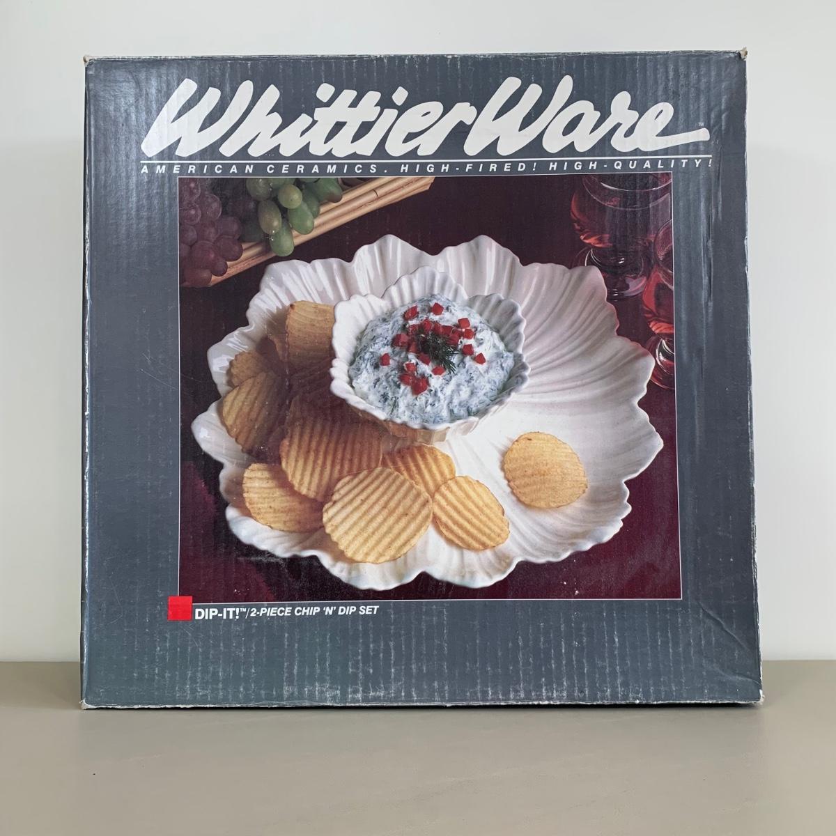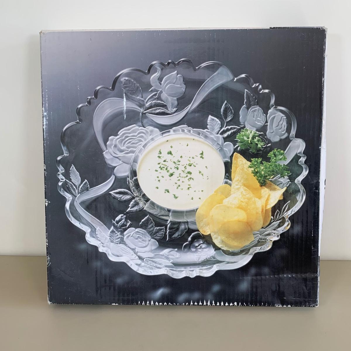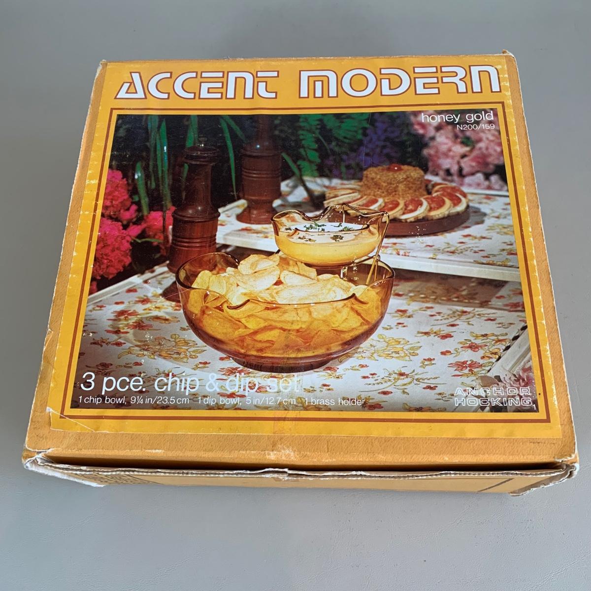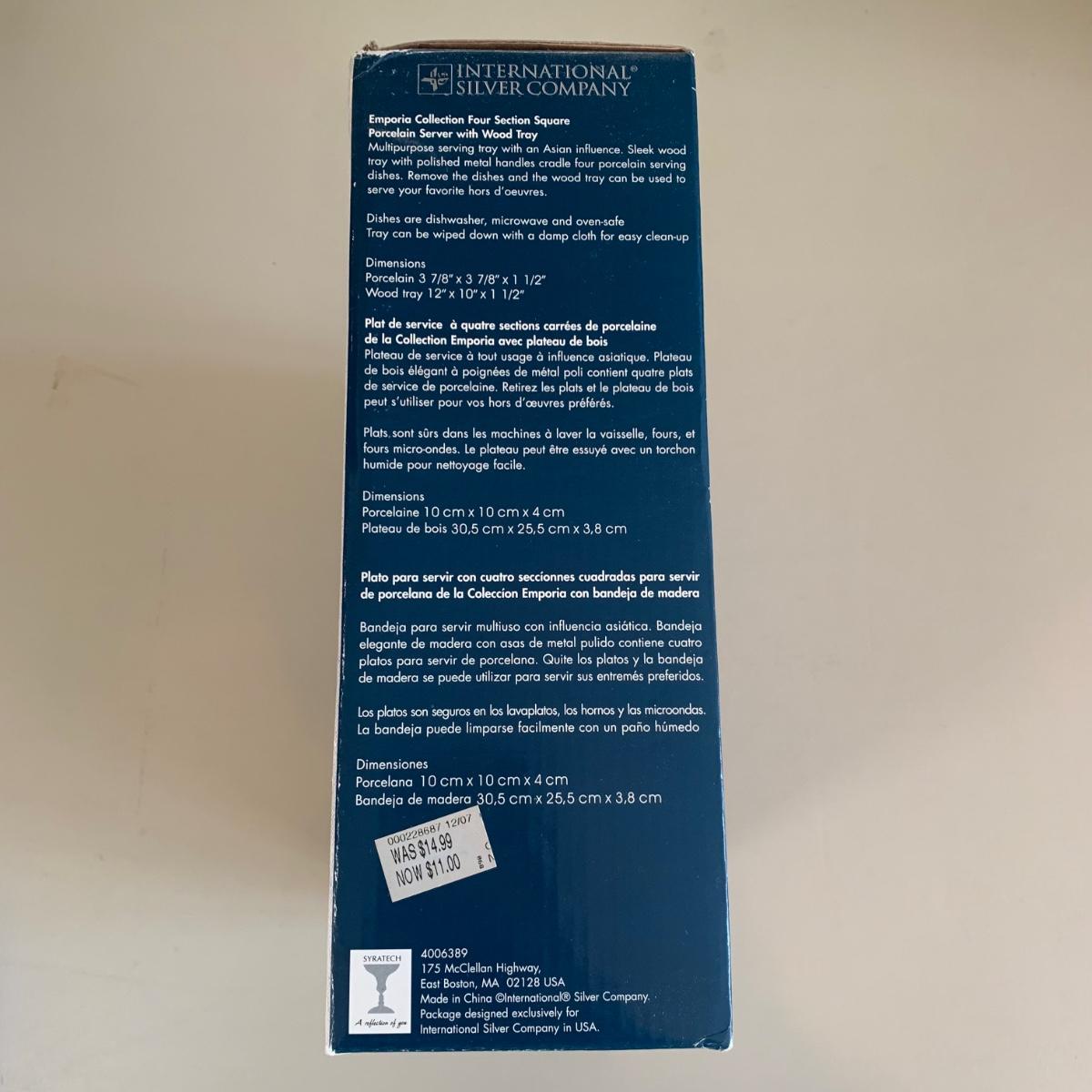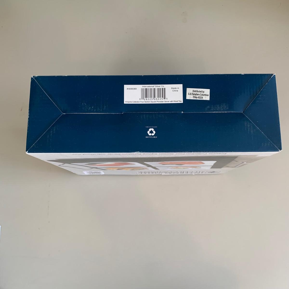 LOT 130 L: International Silver Co. Emporia Collection 4 & 3 Section Porcelain Servers w/ Wooden Trays, Anchor Hocking Accent Modern Honey Gold 3 Piece Chip & Dip Set & More