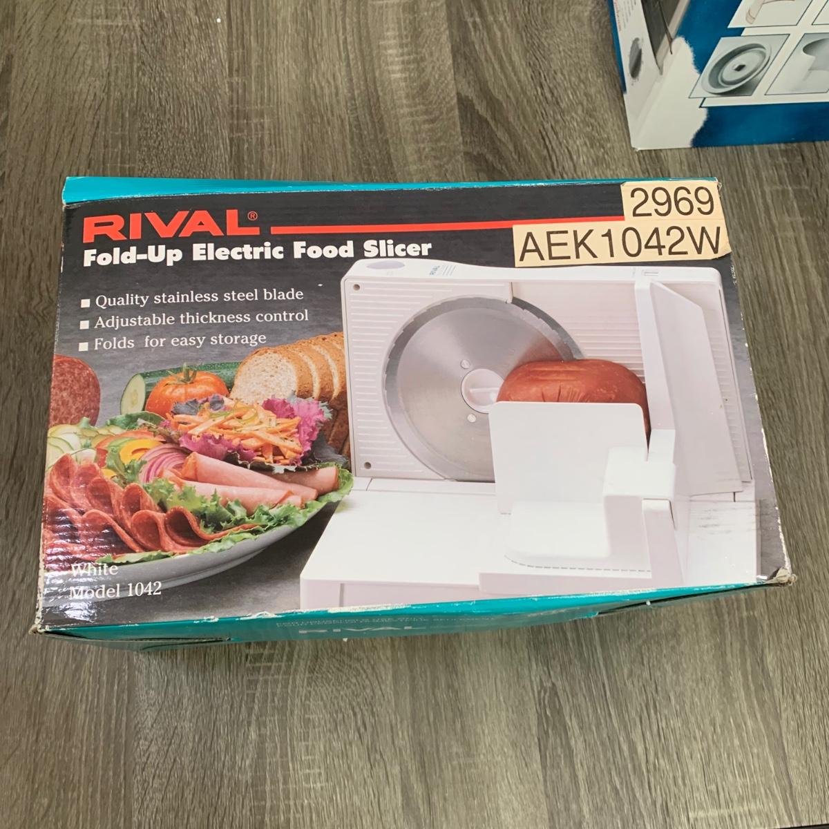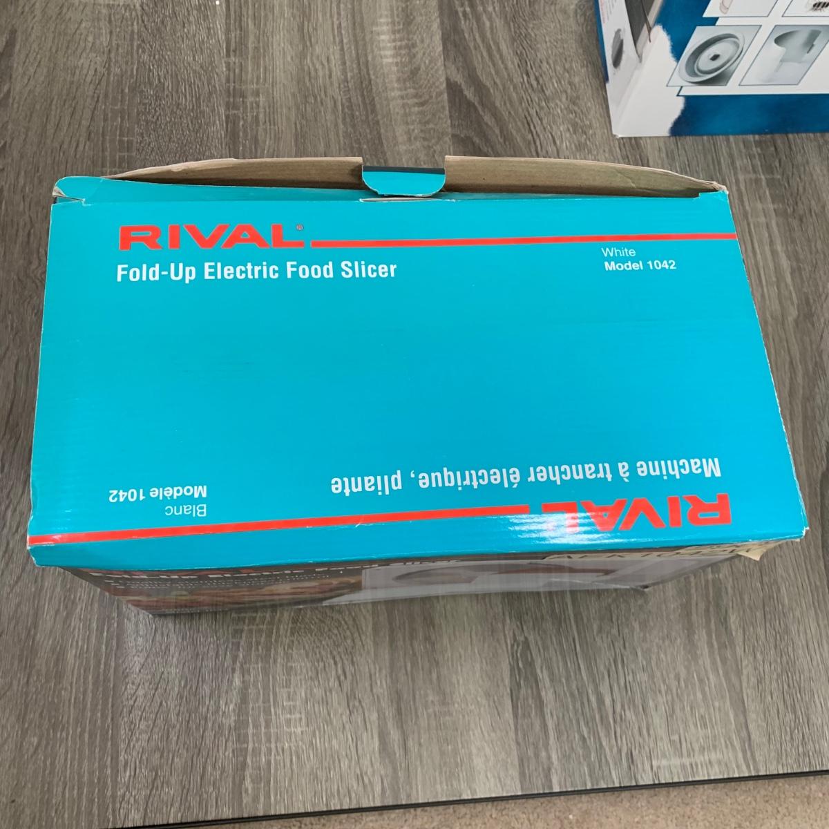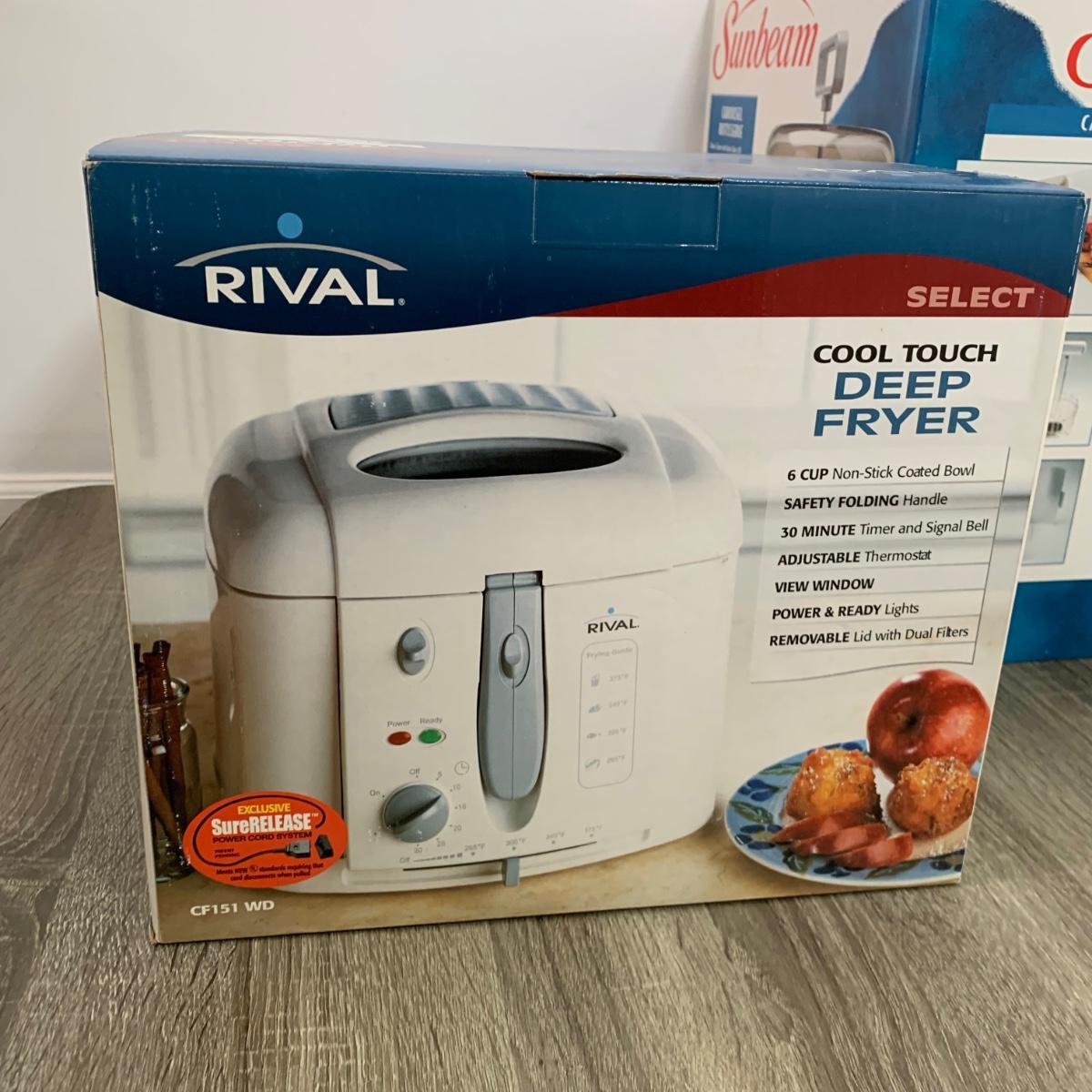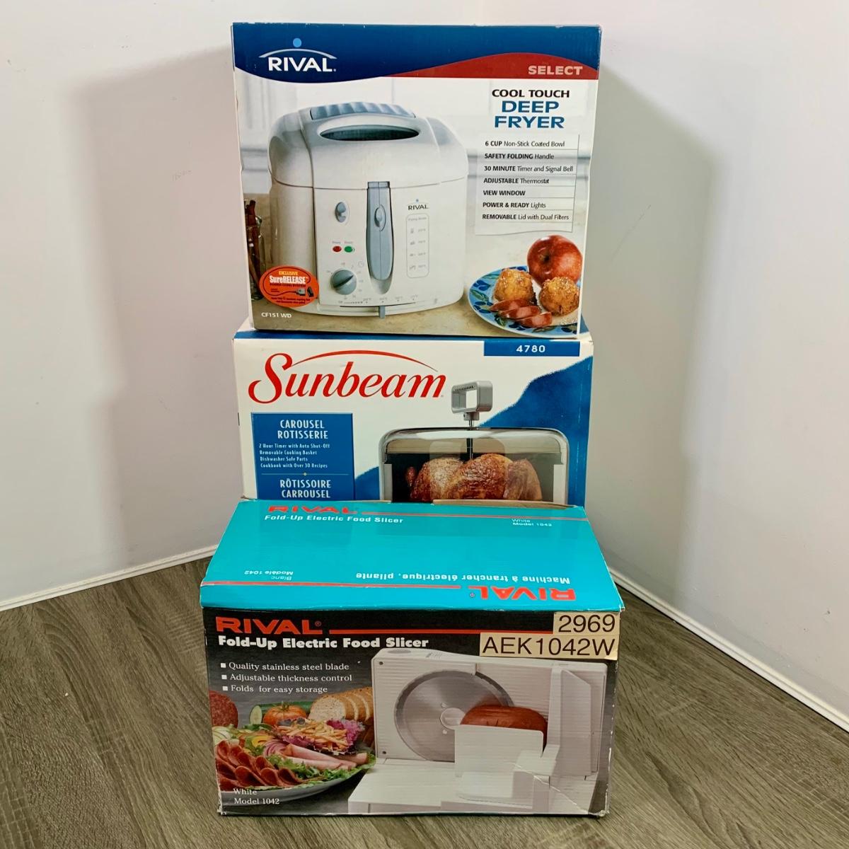 LOT 133 W: NIP Sunbeam Carousel Rotisserie, Rival Select Cool Touch Deep Fryer, & Rival Fold-Up Electric Food Slicer