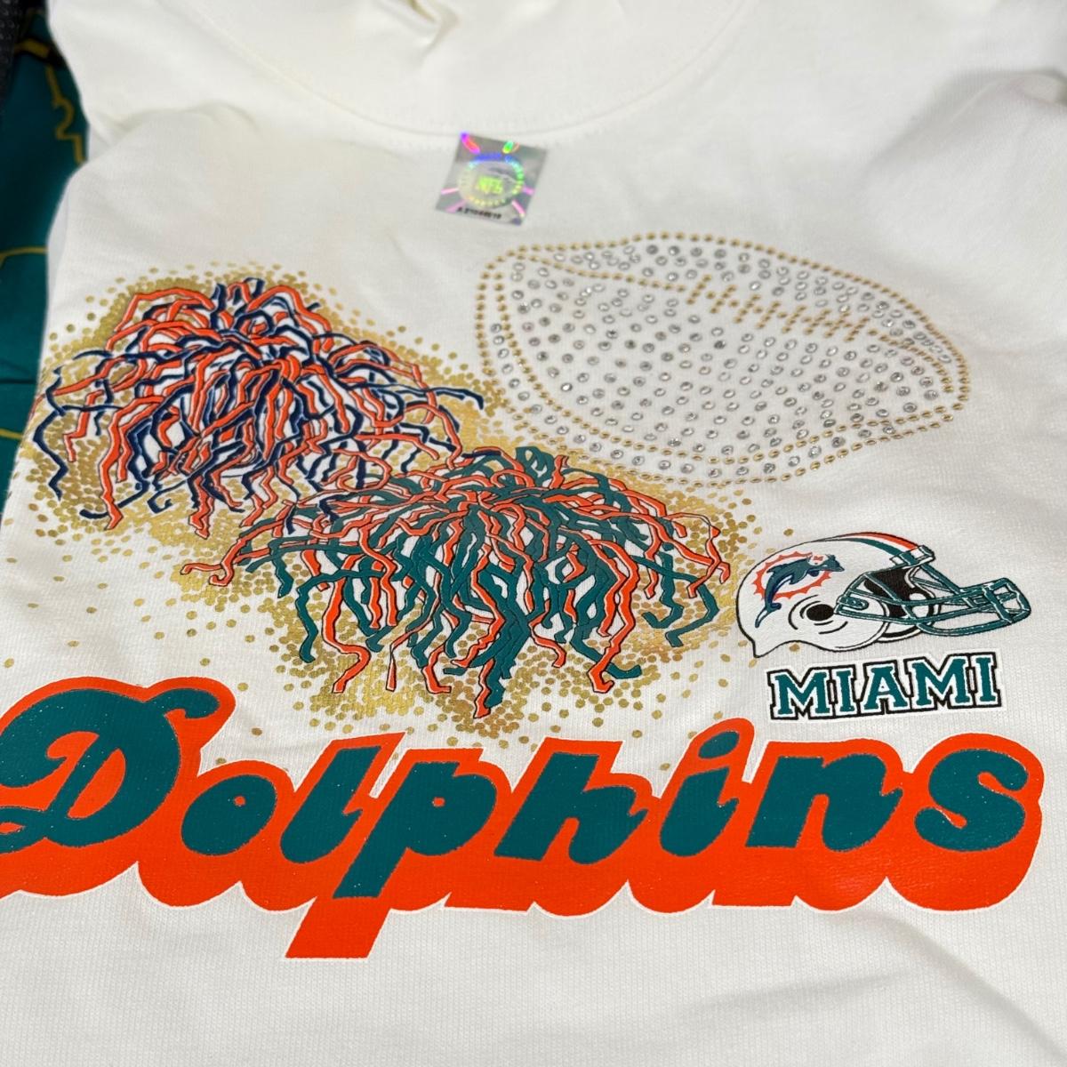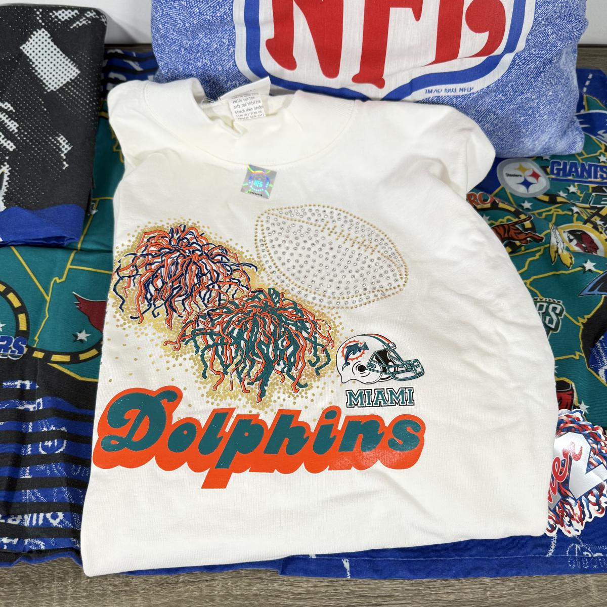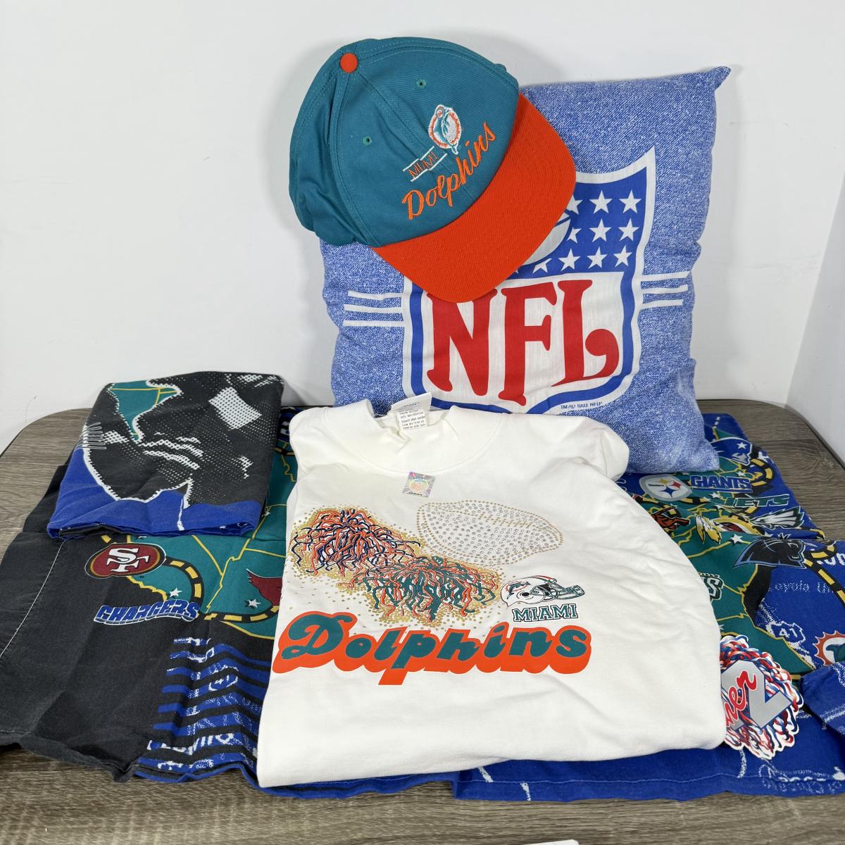 LOT 227A: Bedazzled NFL Miami Dolphins Turtleneck, Baseball Cap, NFL Throw Pillow & Football Pillow Cases