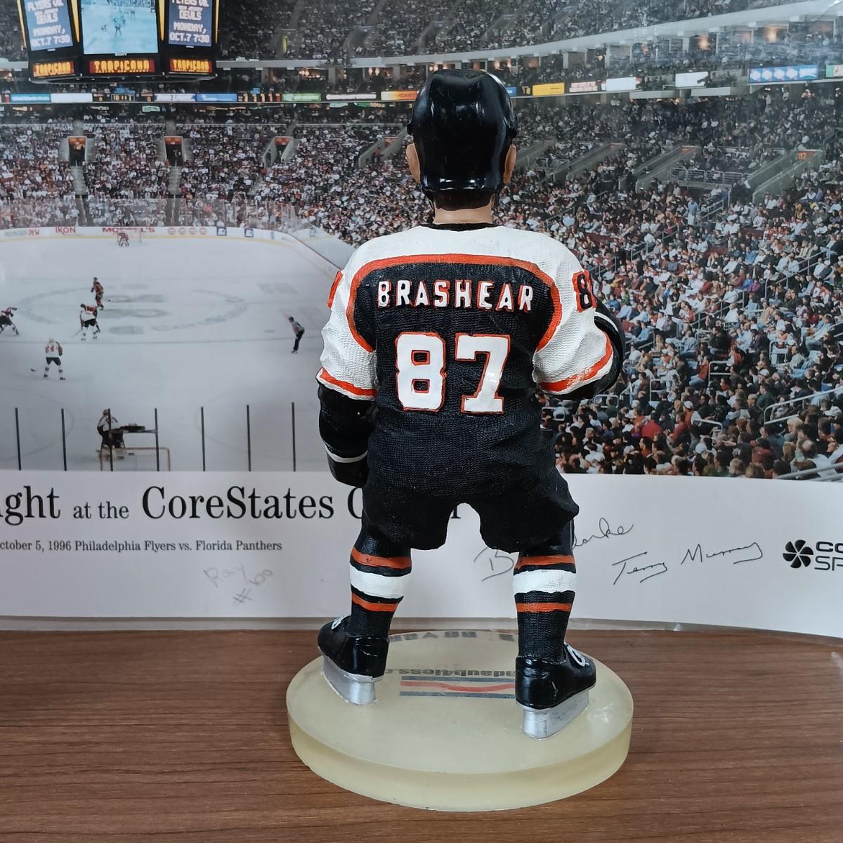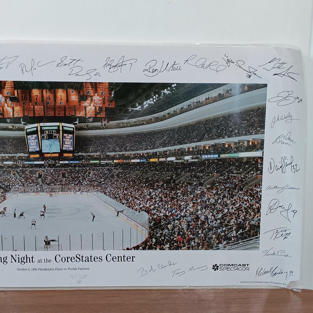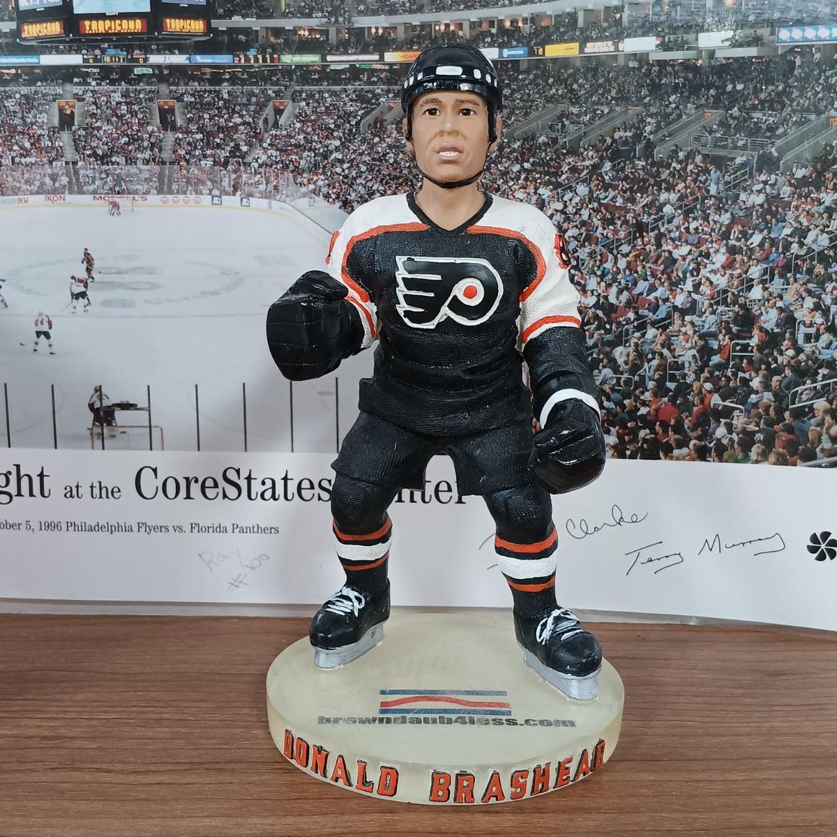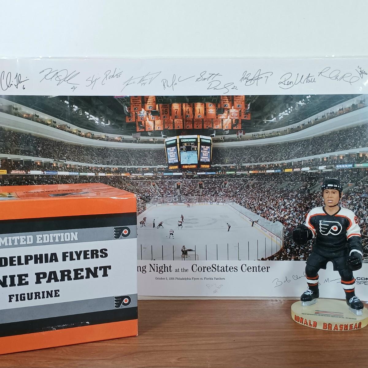 LOT 246B: Philadelphia Flyers 1996 'Opening Night at the CoreStates Center' Signed Photo Print, Bernie Parent Signed Statue & Donald Brashear Bobble Gloves