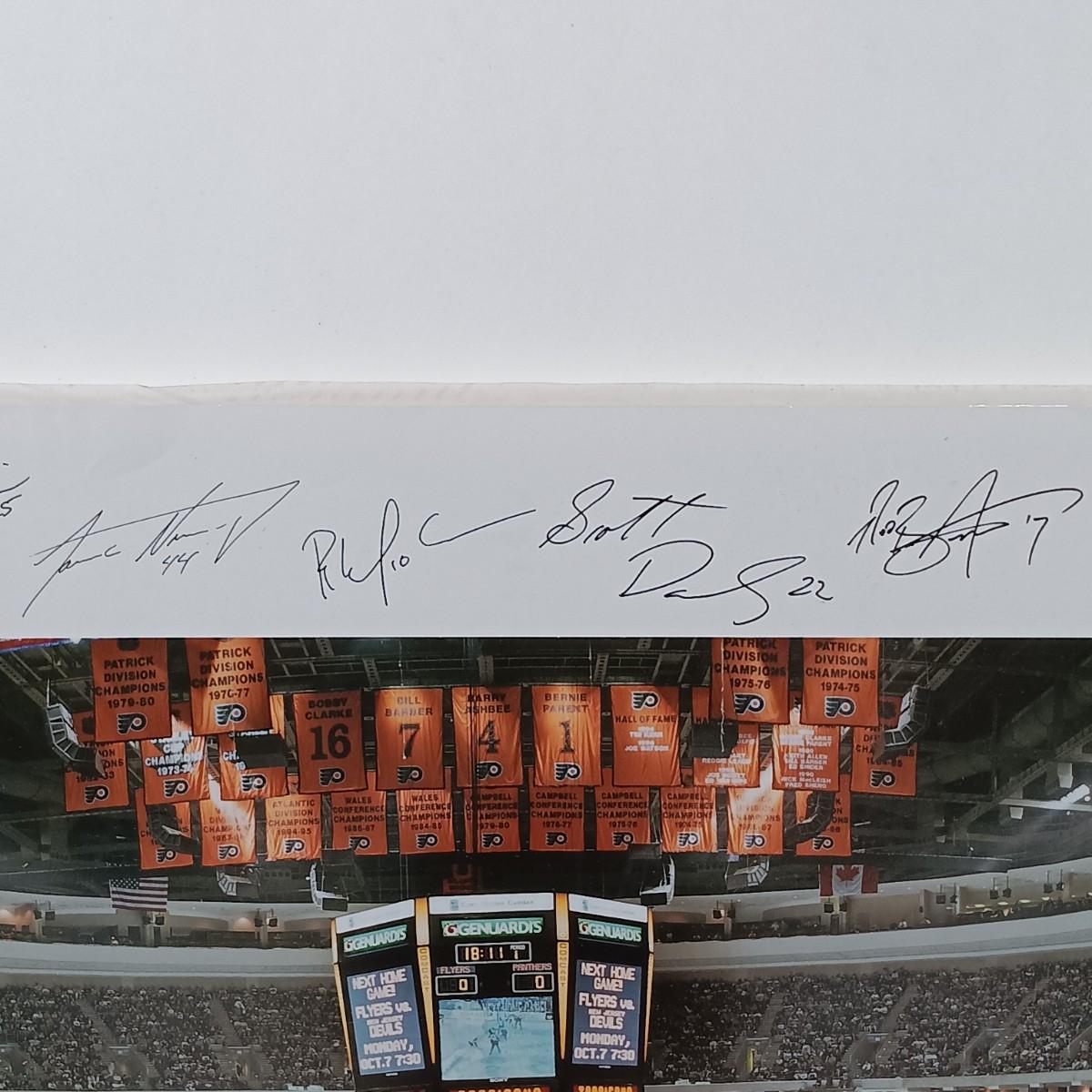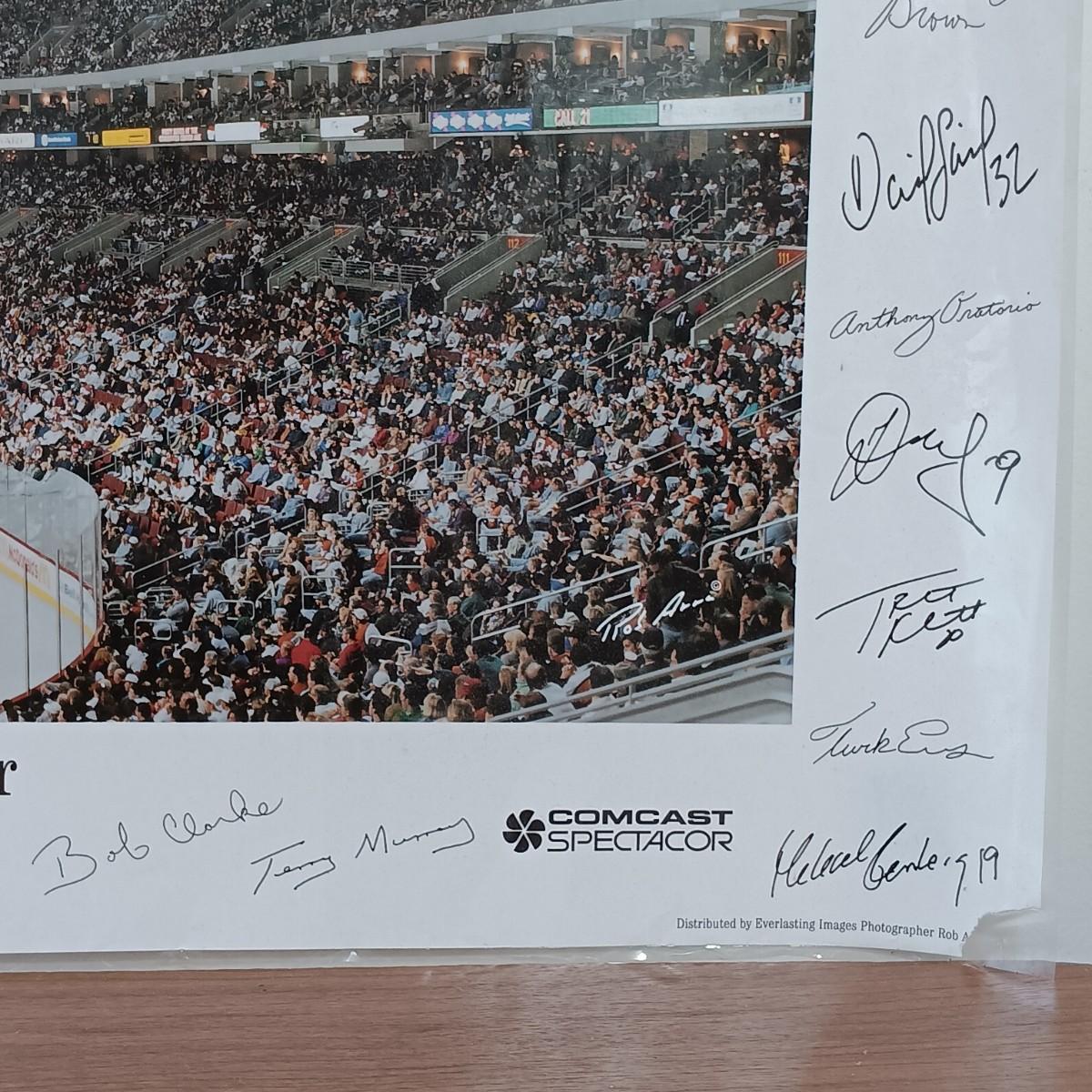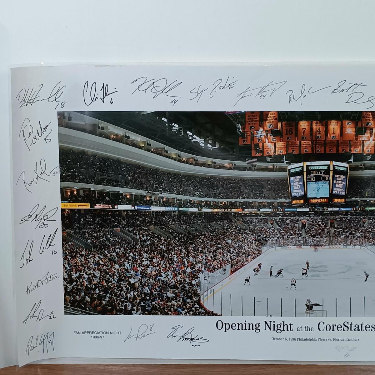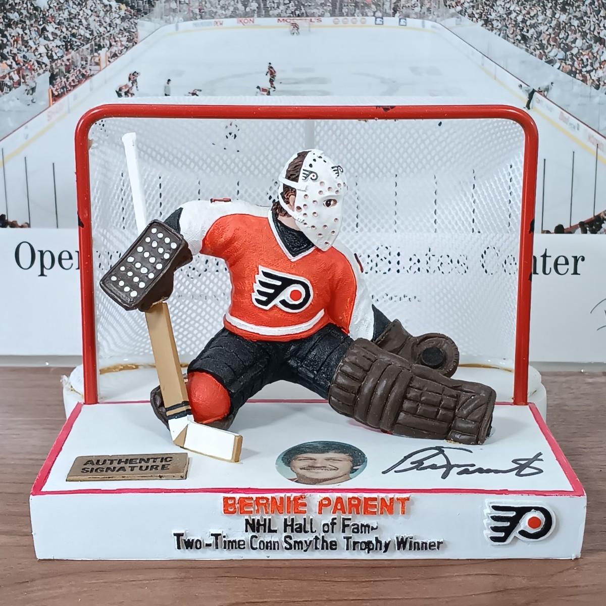 LOT 246B: Philadelphia Flyers 1996 'Opening Night at the CoreStates Center' Signed Photo Print, Bernie Parent Signed Statue & Donald Brashear Bobble Gloves