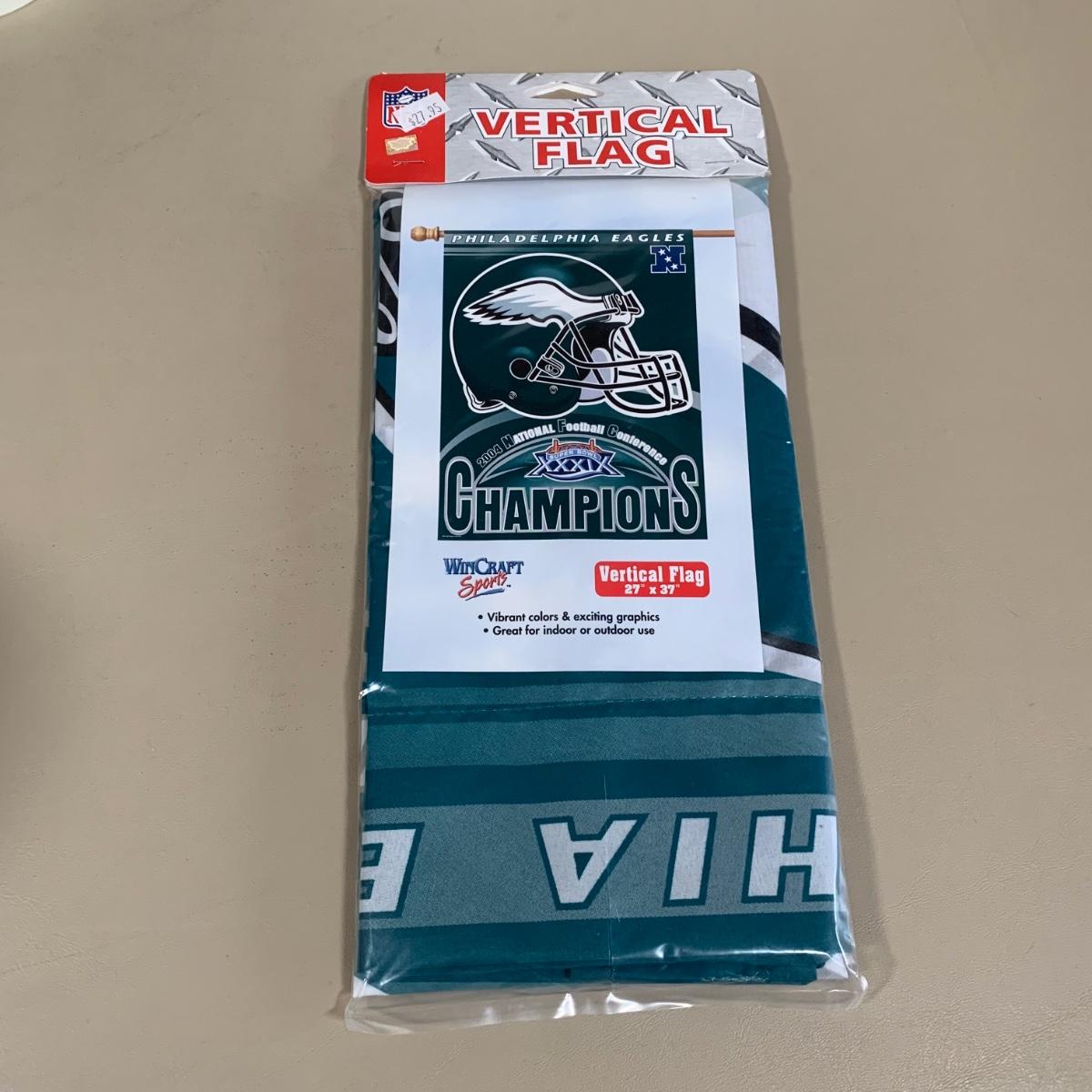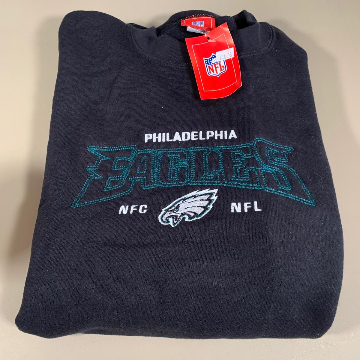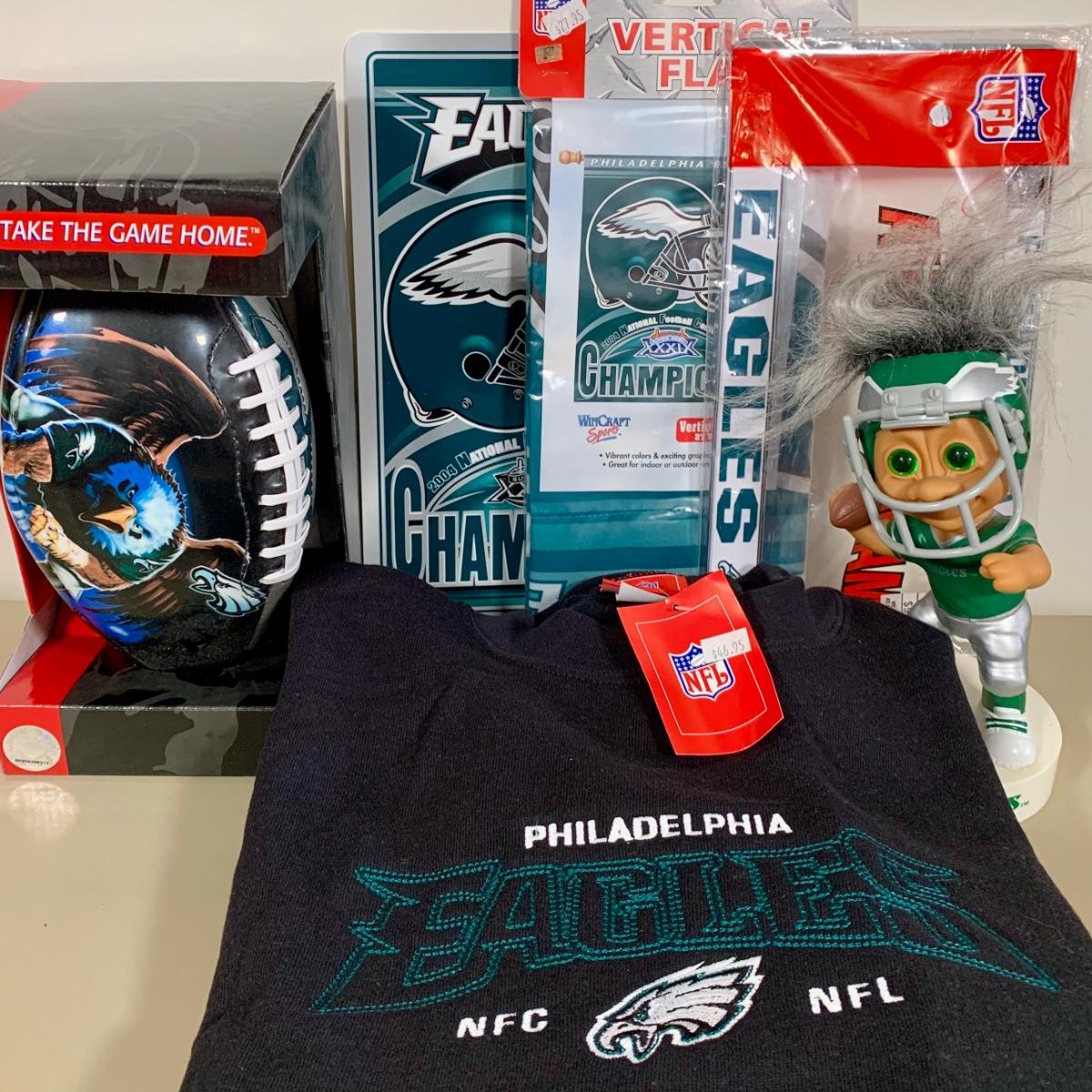 LOT 284 B: NIP & NWT NFL Philadelphia Eagles Fandom Collection; Embroidered 2XL Sweatshirt, Wincraft Sports 2004 NFC Champions Vertical Flag, & More