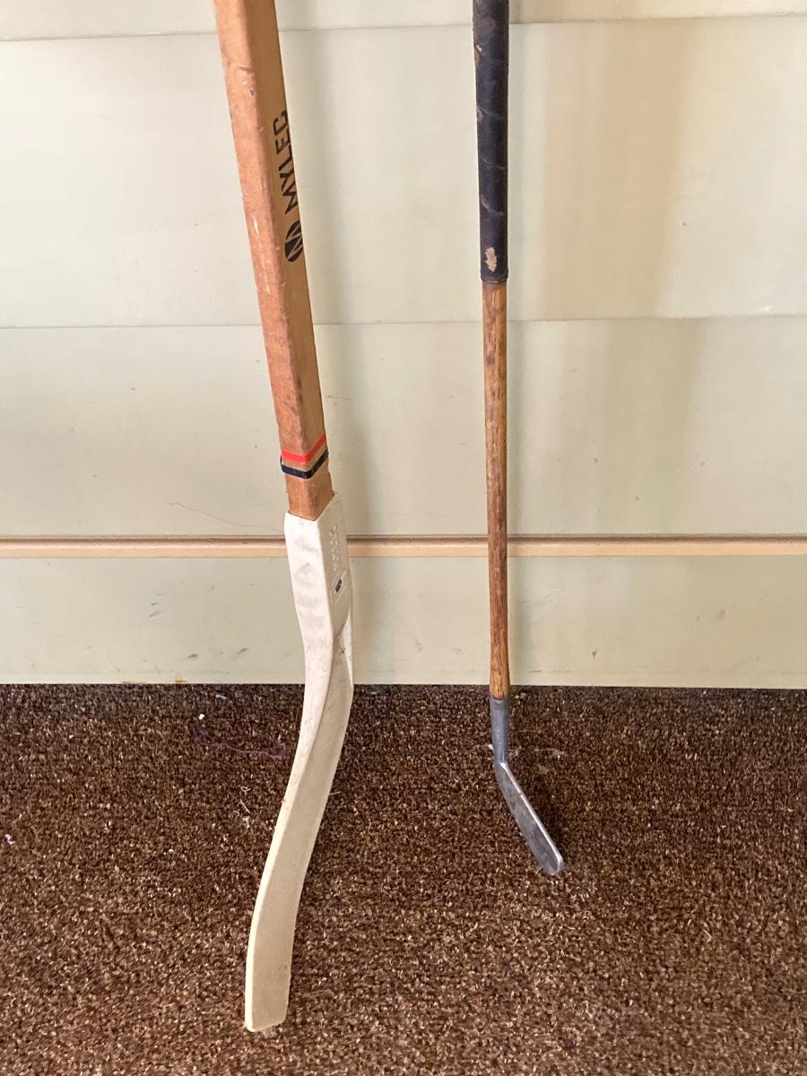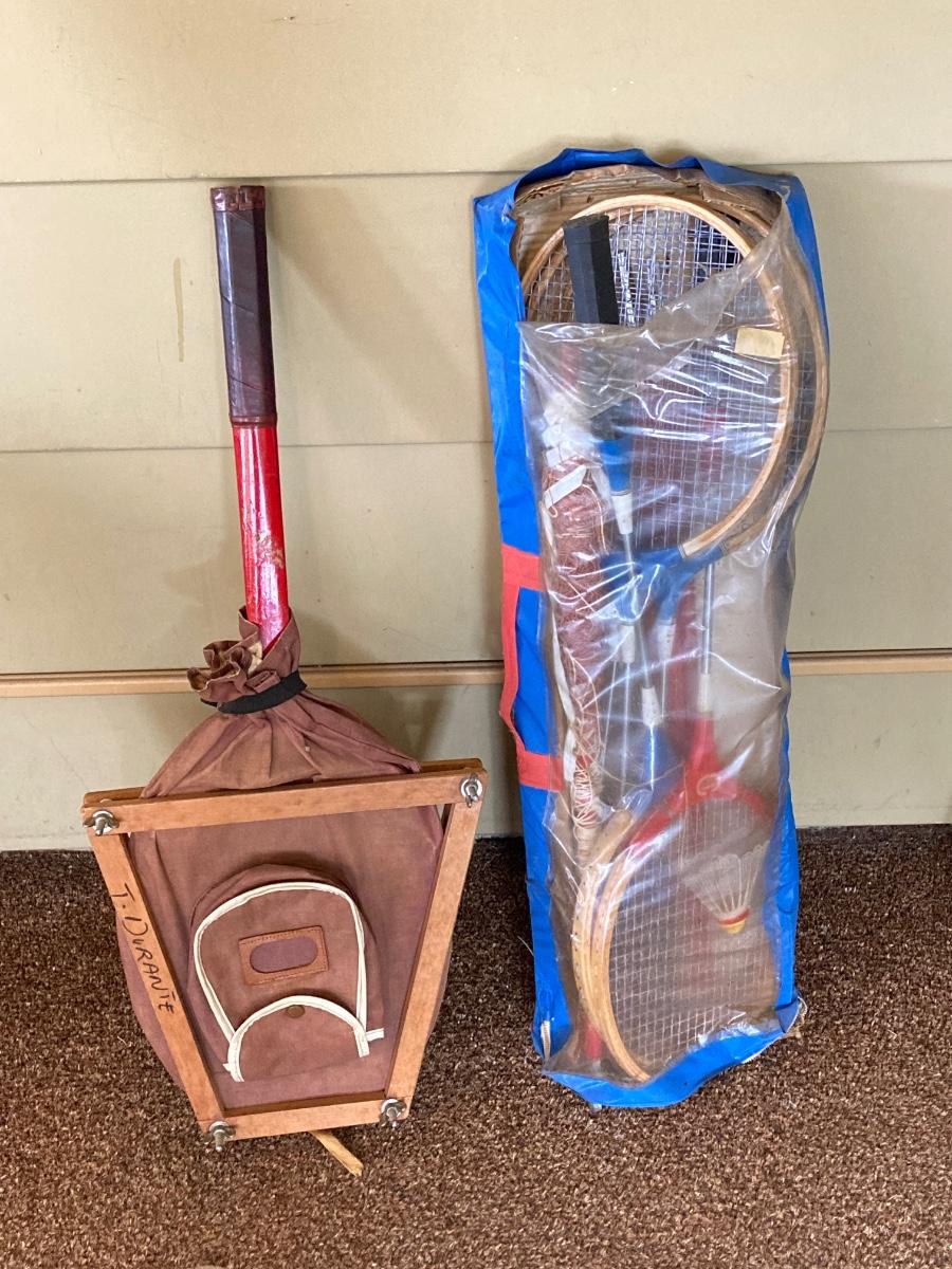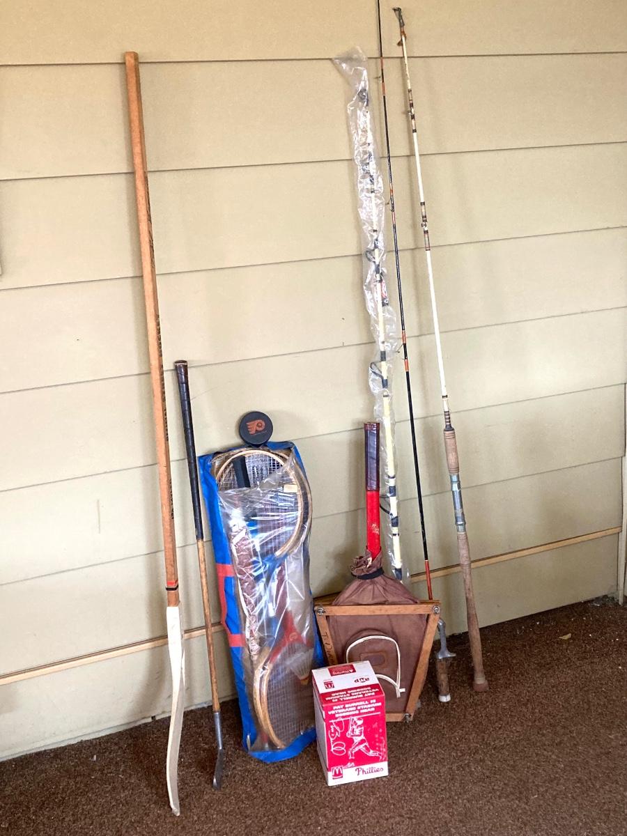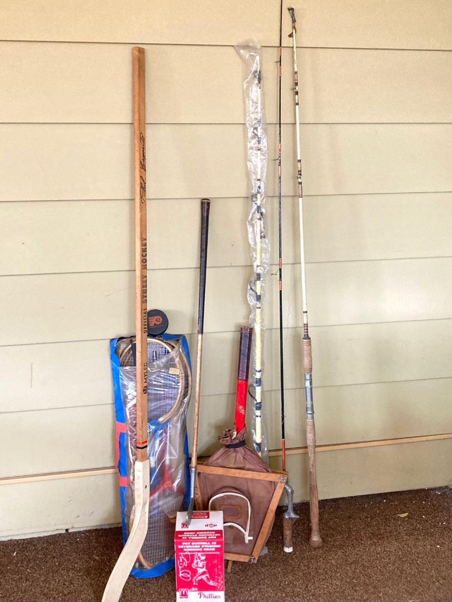 LOT 229: Vintage Sporting Goods Collection - Phil Esposito Street Hockey Stick, Burke Golf Putter, Fishing Rods, Spalding Tennis Racket, Badminton, Flyers Hockey Puck and More