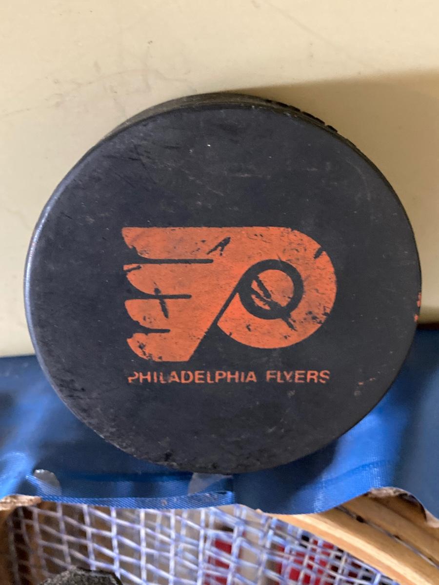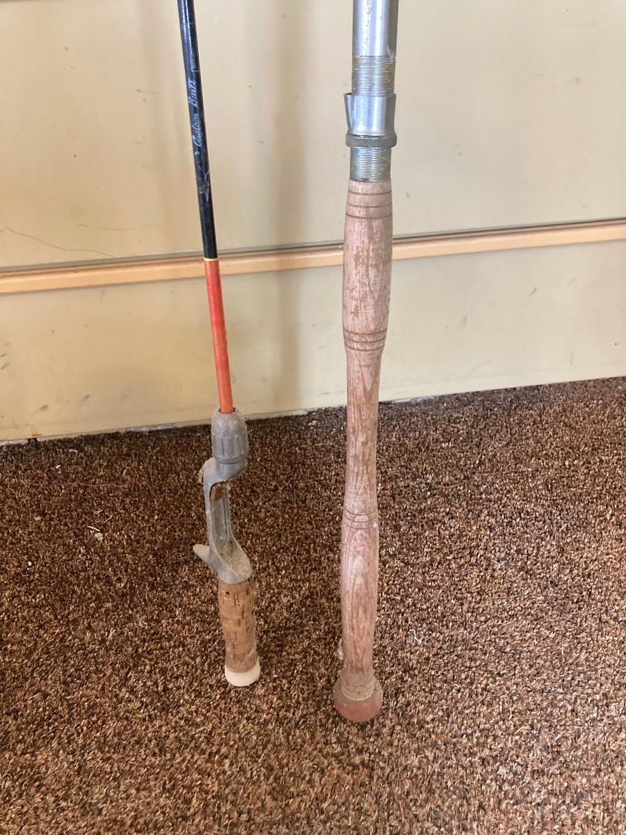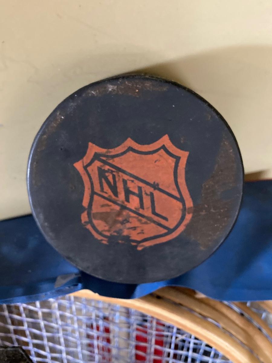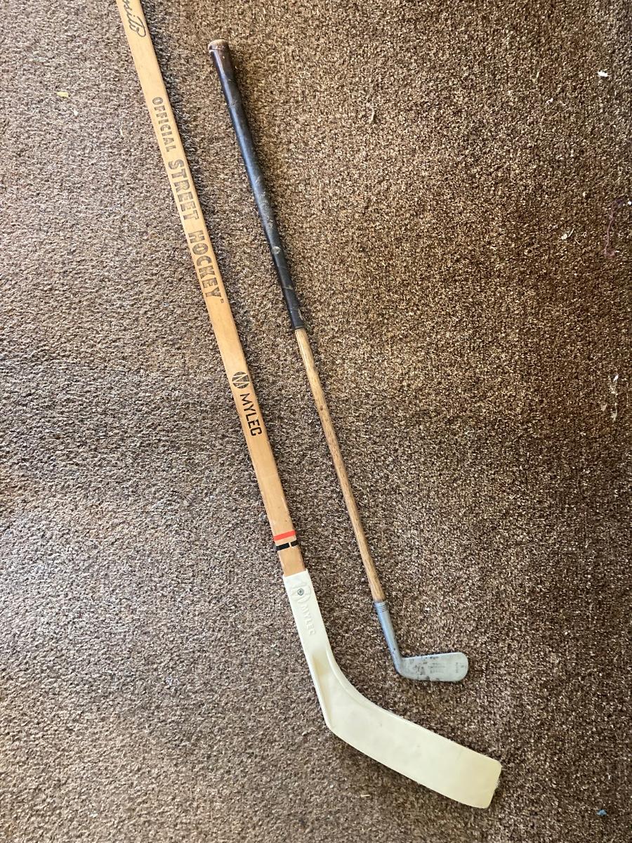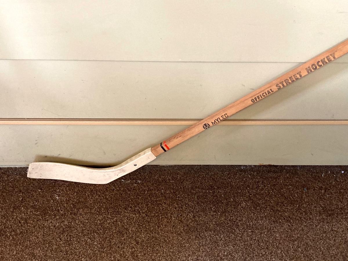 LOT 229: Vintage Sporting Goods Collection - Phil Esposito Street Hockey Stick, Burke Golf Putter, Fishing Rods, Spalding Tennis Racket, Badminton, Flyers Hockey Puck and More