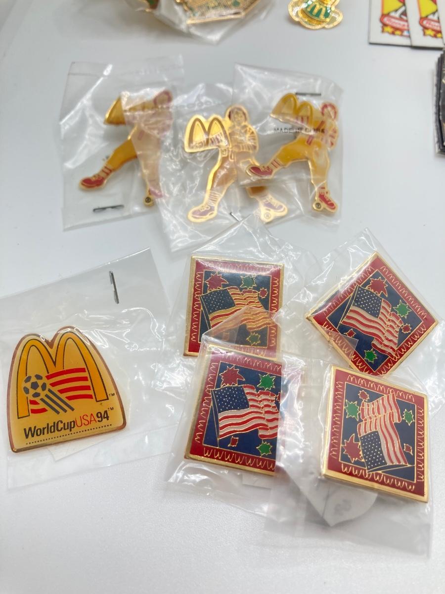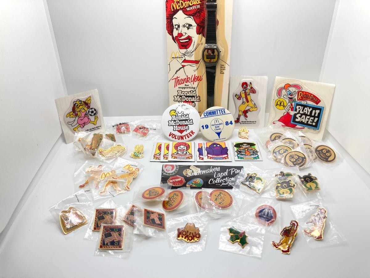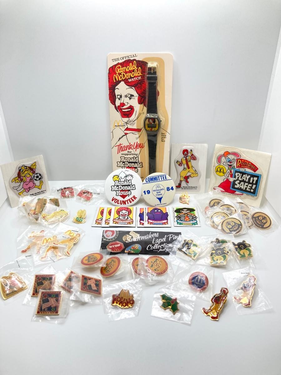 LOT 242: Large Vintage McDonald's Memorabilia Collection - Ronald McDonald Watch in Package, Pins, Stickers, Magnetics,