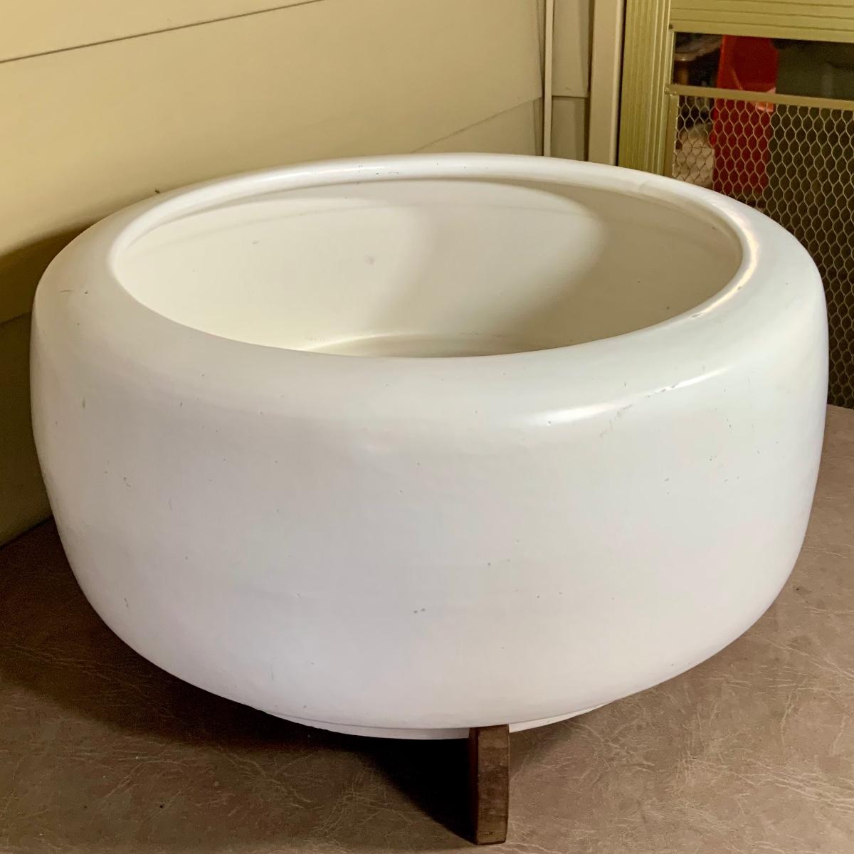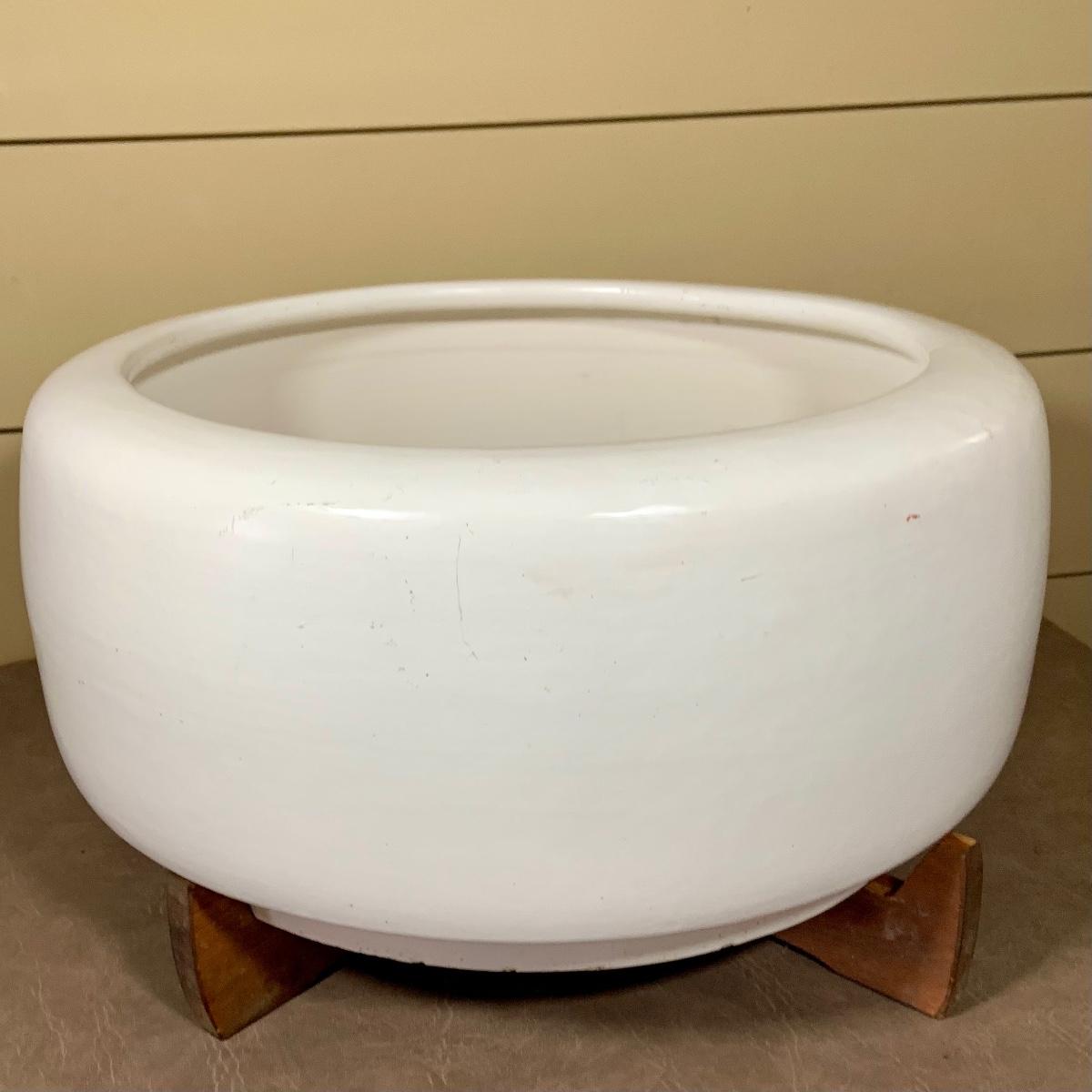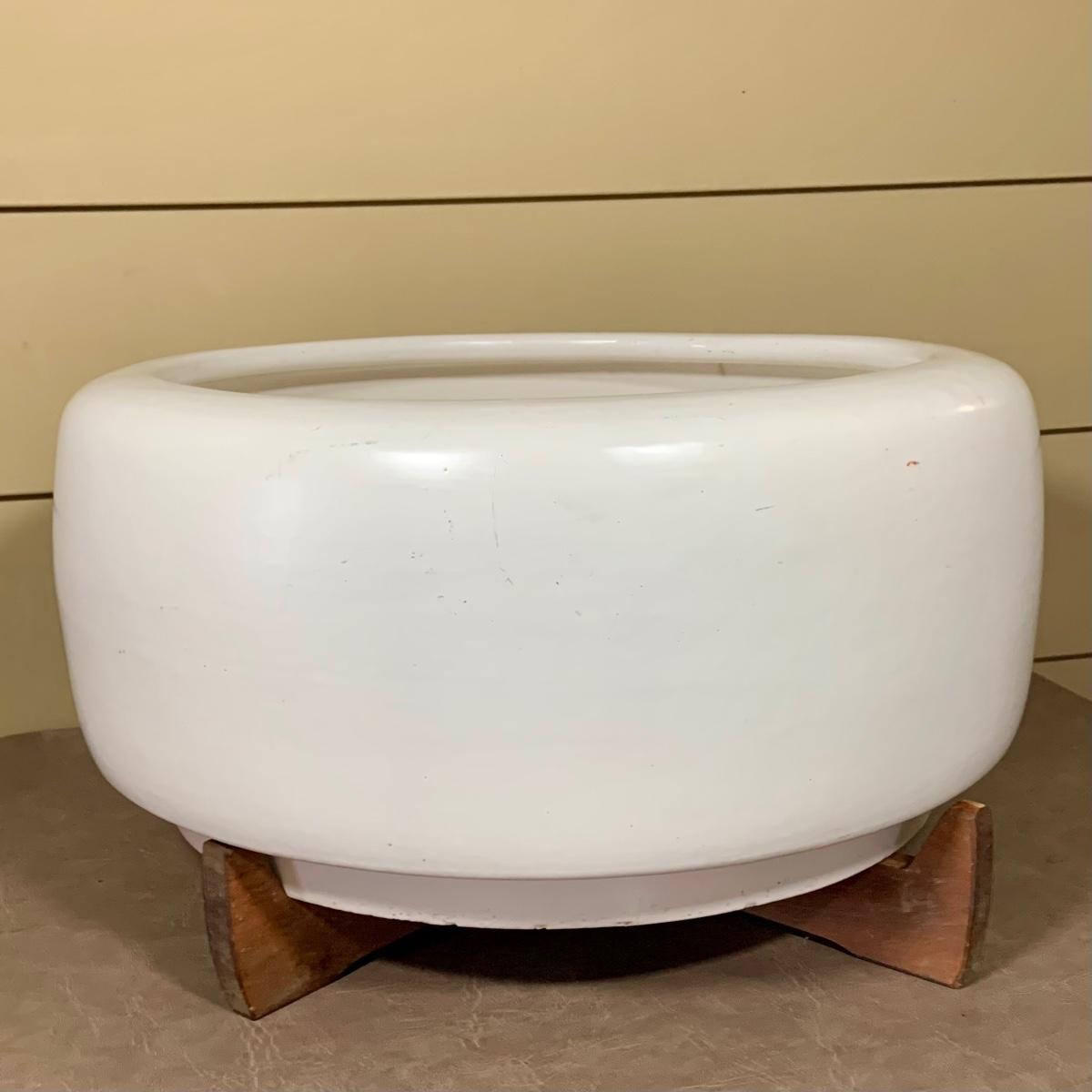 LOT 258: MCM Architectural Pottery Large Cream Colored Planter with Wood Base