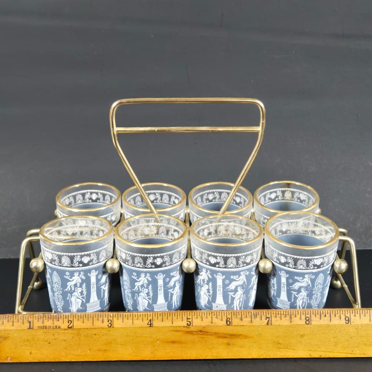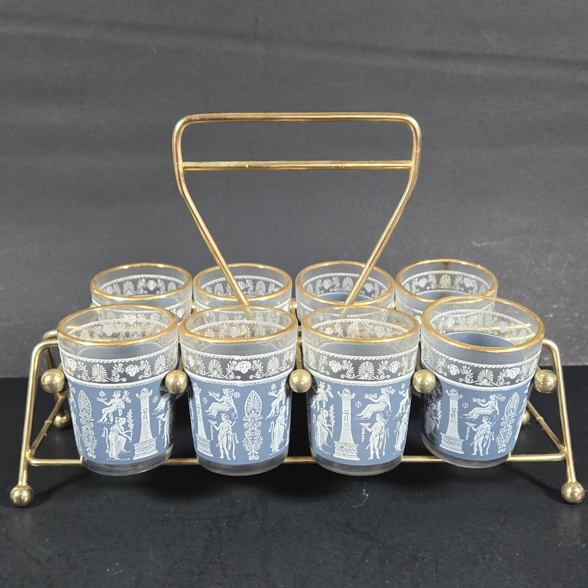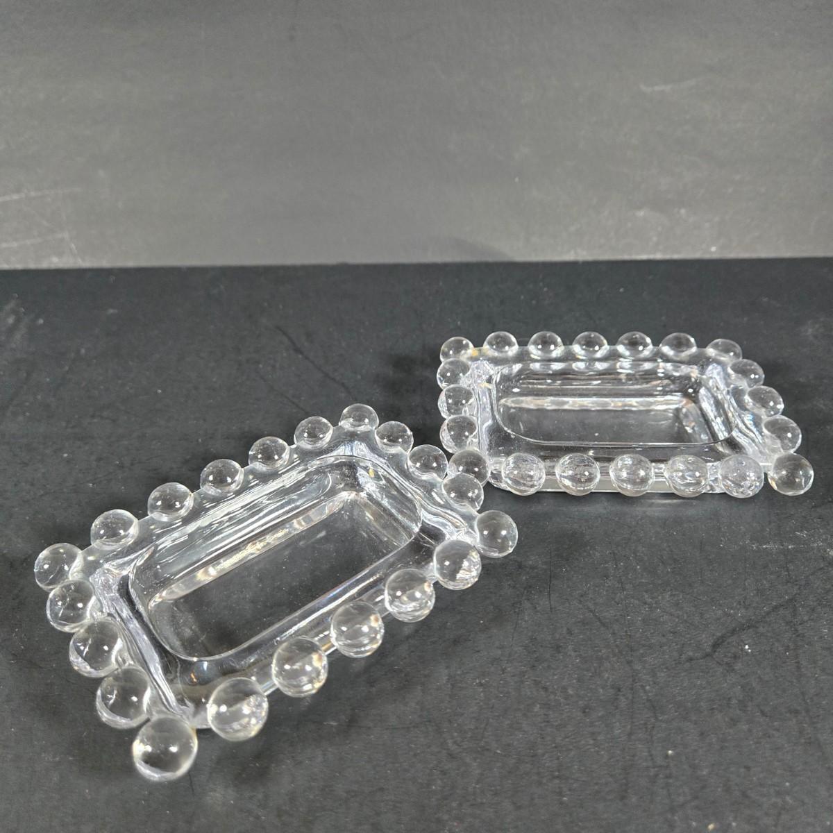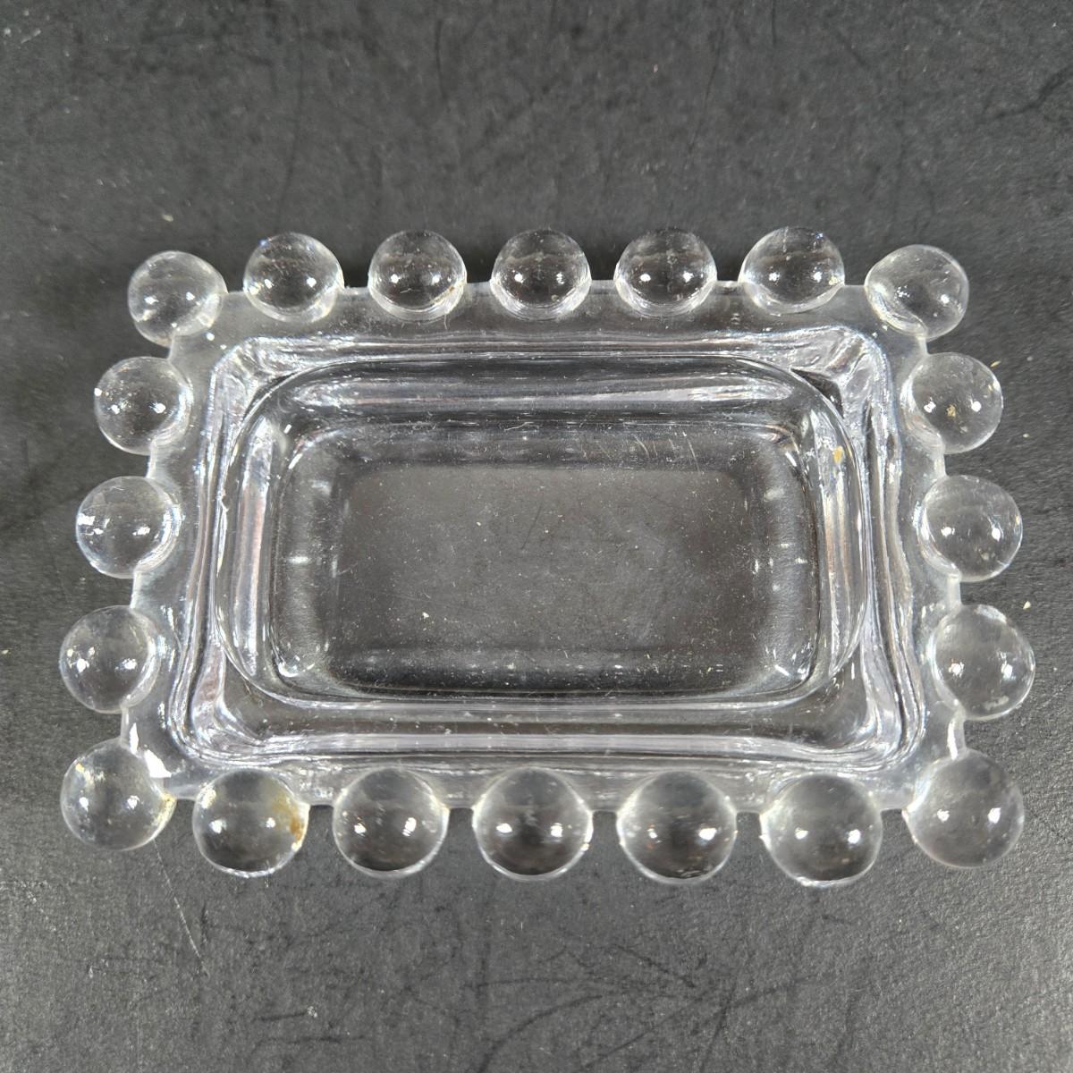 LOT 271: Vintage 1960s Jeanette Blue Corinthian Shot Glasses with Brass Caddy, "HOME SMORGASBORD KNIFE", Vintage Imperial Glass Candlewick Dishes, and MCM Fern Leaf Glass Pitcher