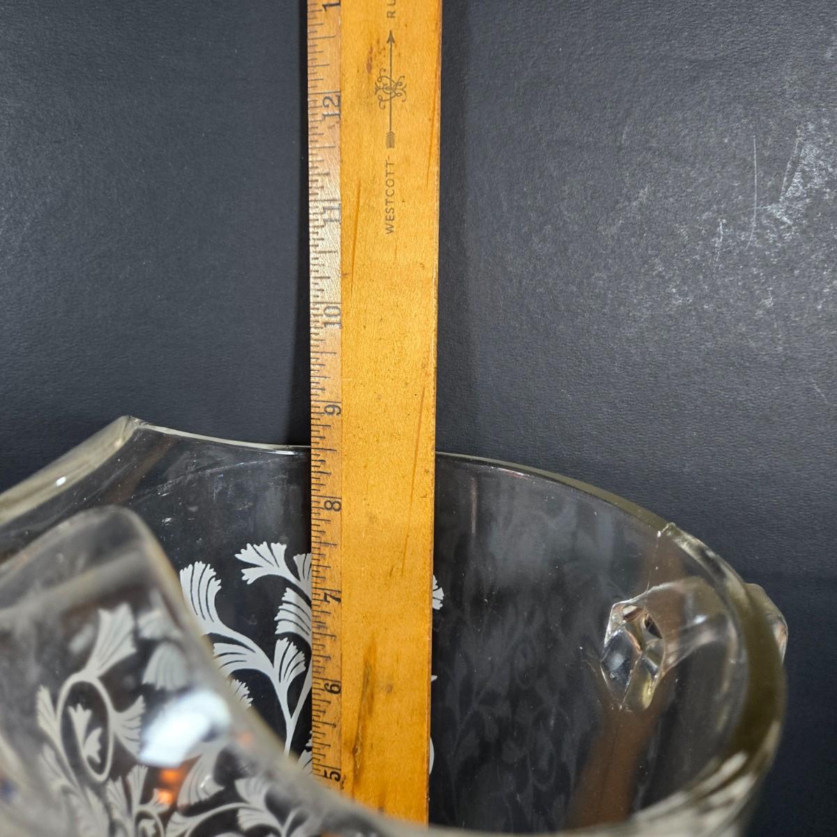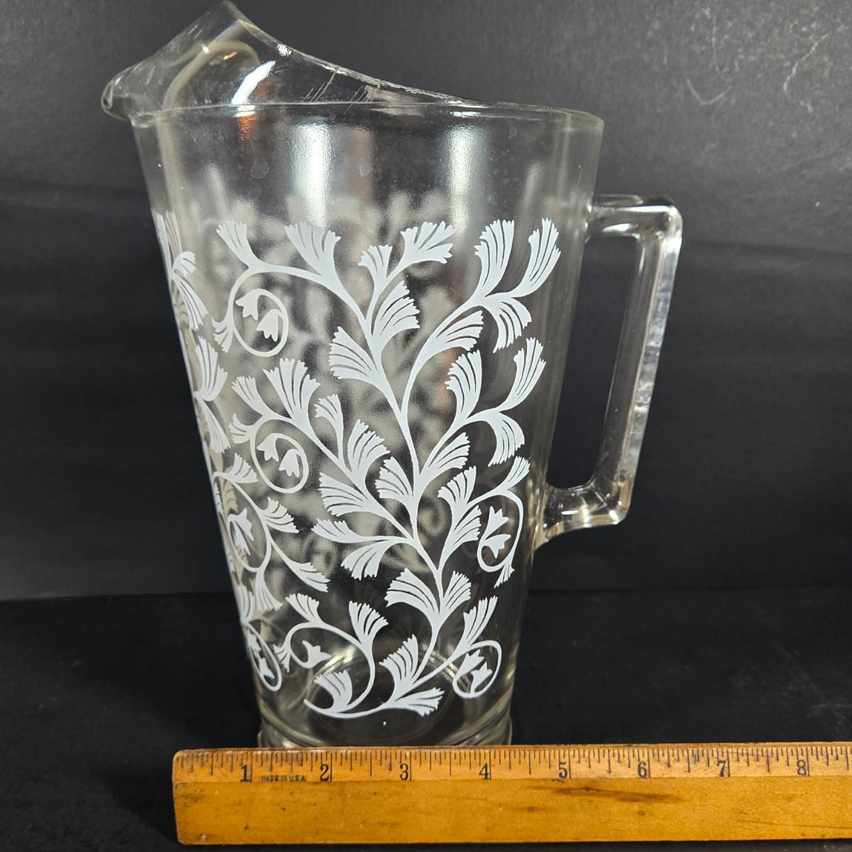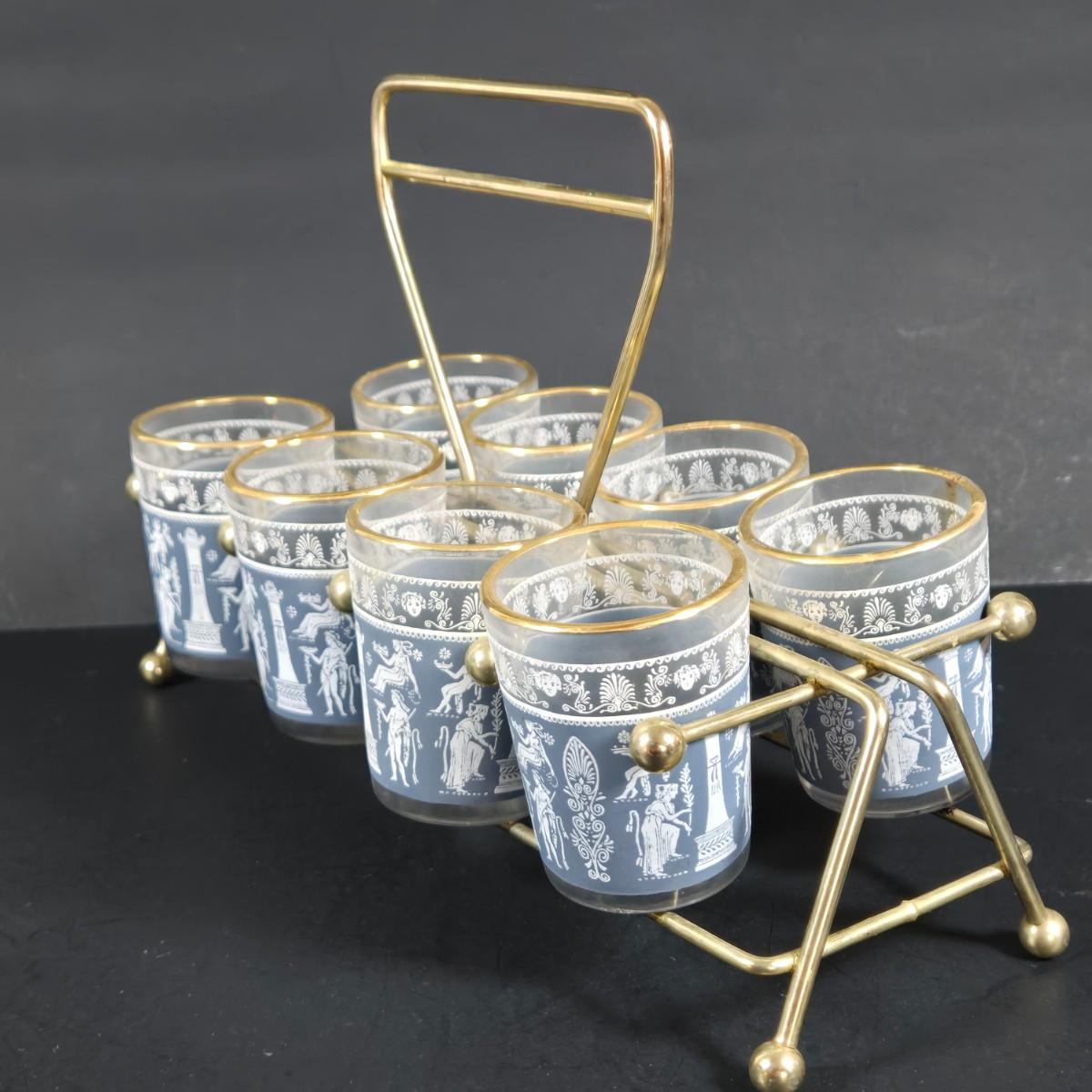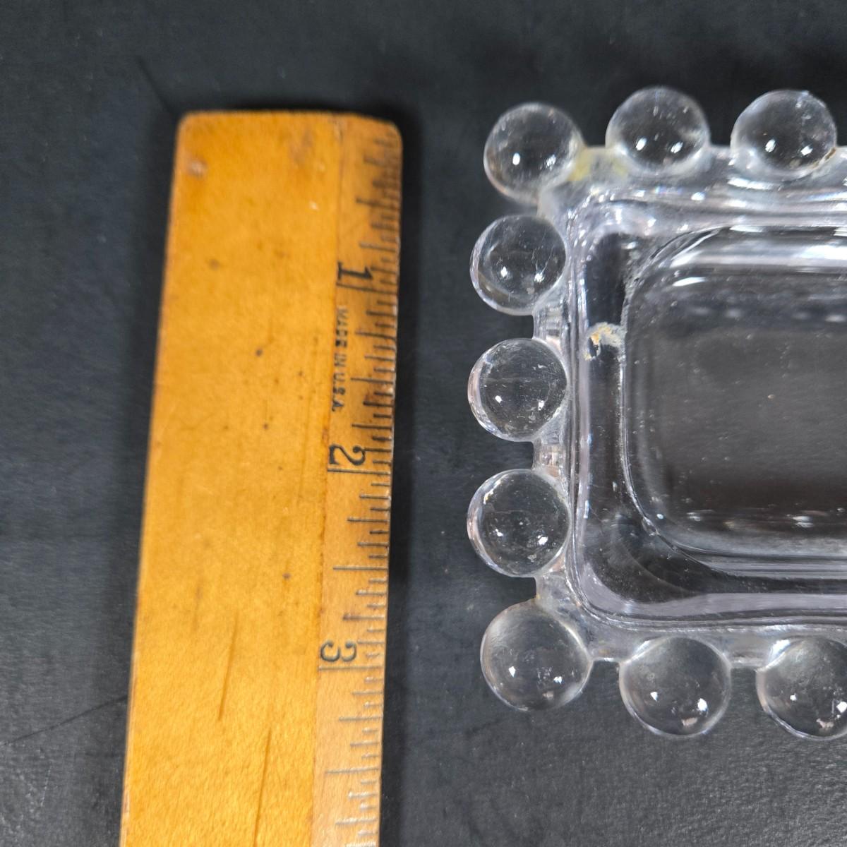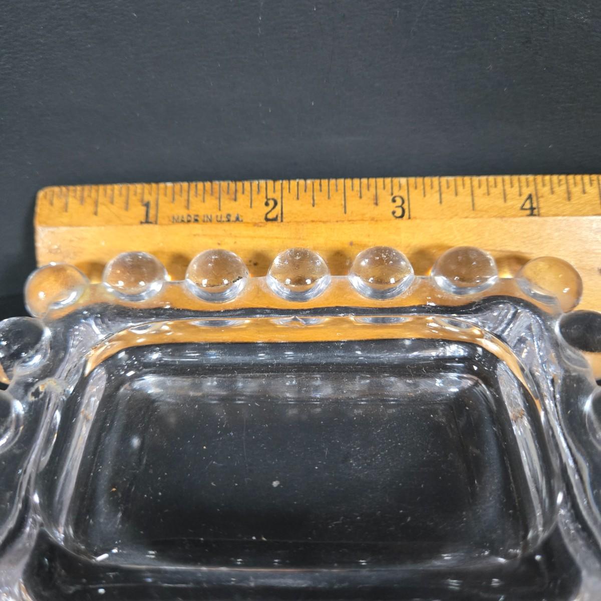 LOT 271: Vintage 1960s Jeanette Blue Corinthian Shot Glasses with Brass Caddy, "HOME SMORGASBORD KNIFE", Vintage Imperial Glass Candlewick Dishes, and MCM Fern Leaf Glass Pitcher