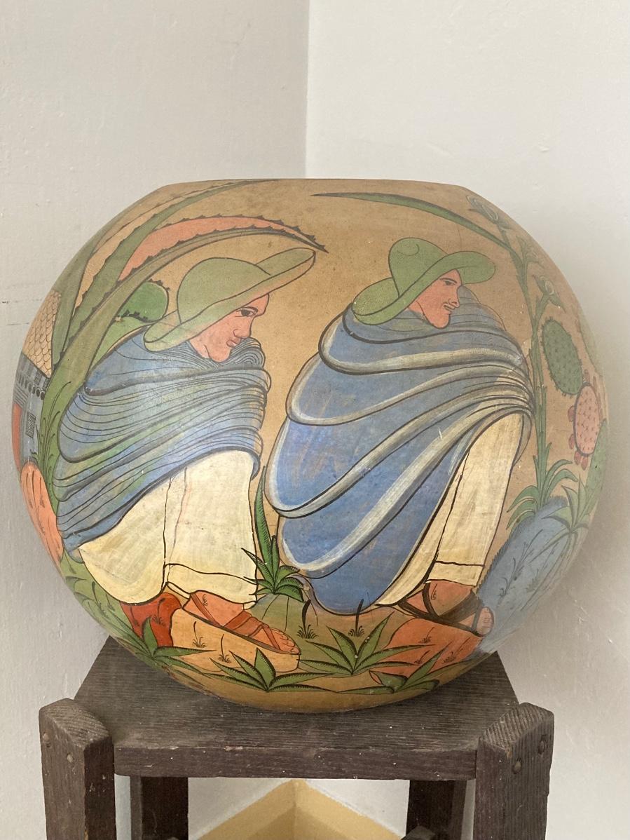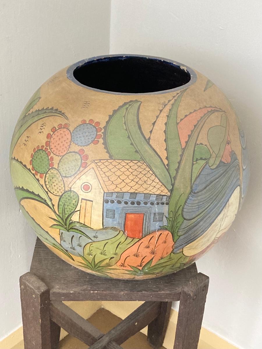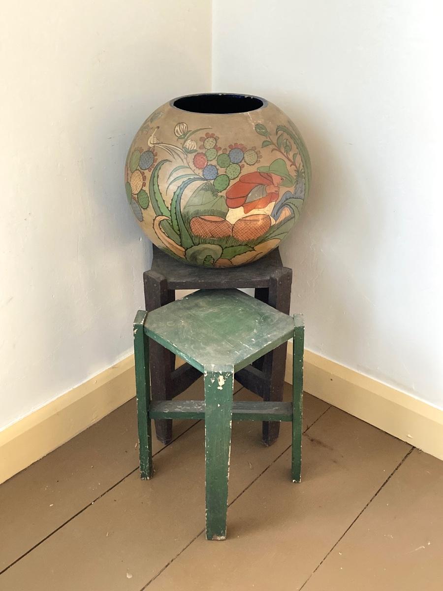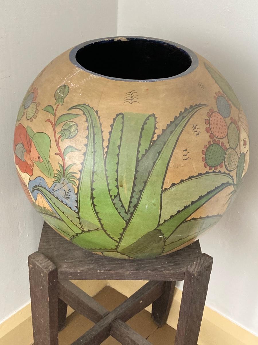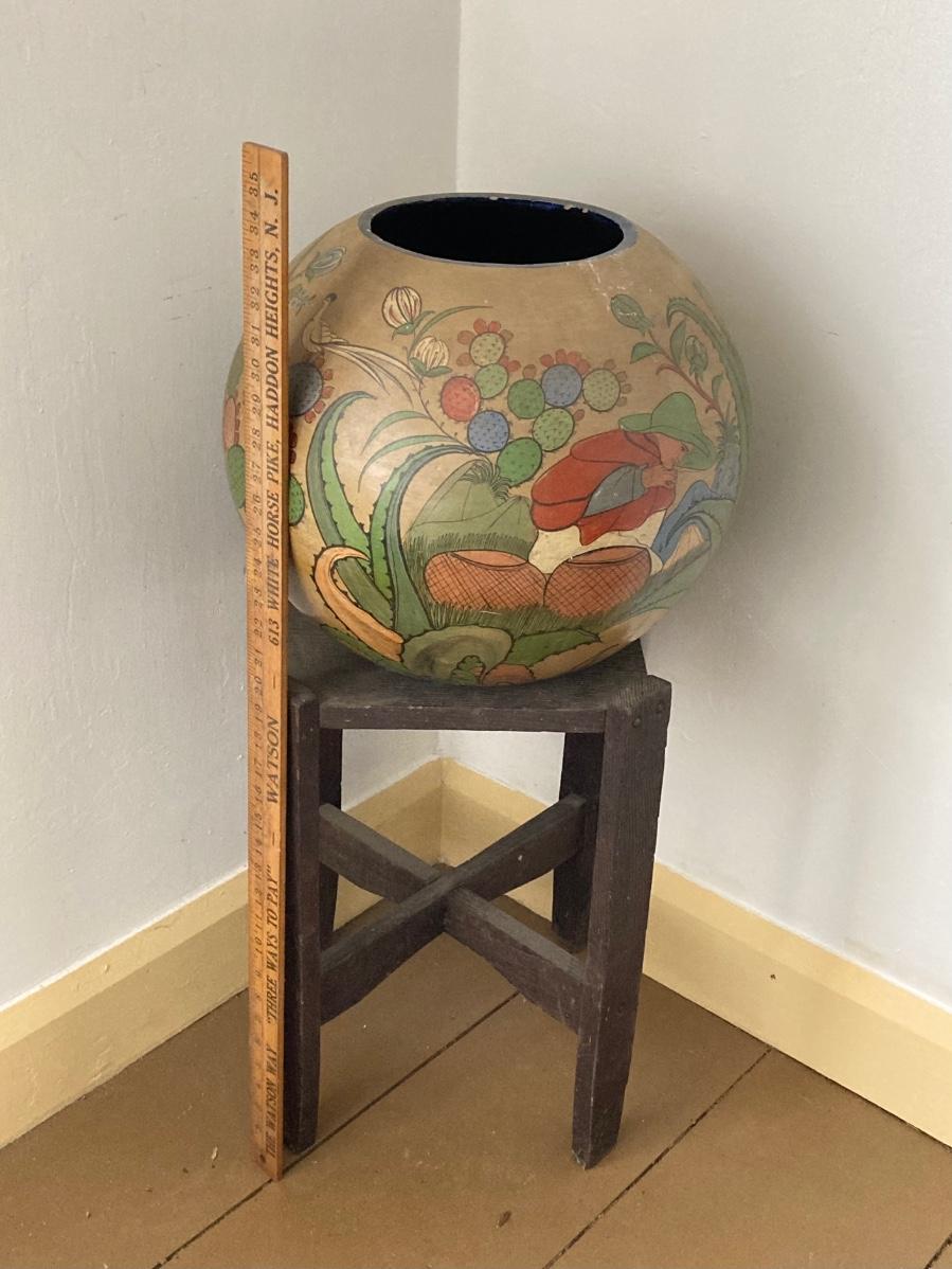 LOT 31: Vintage Mexican Tlaquepaque Pottery Vase/Planter with Pair of Primitive Wood Plant Stands