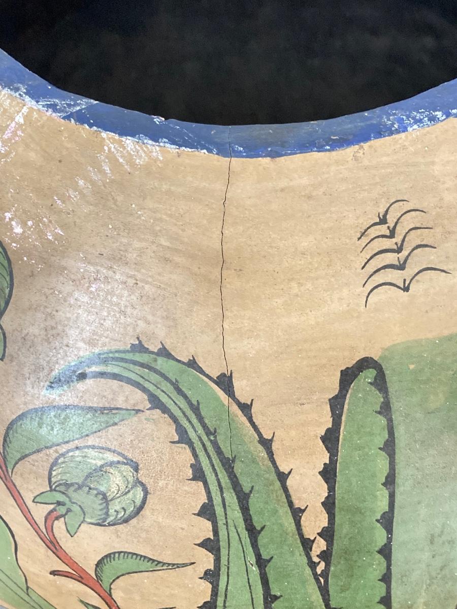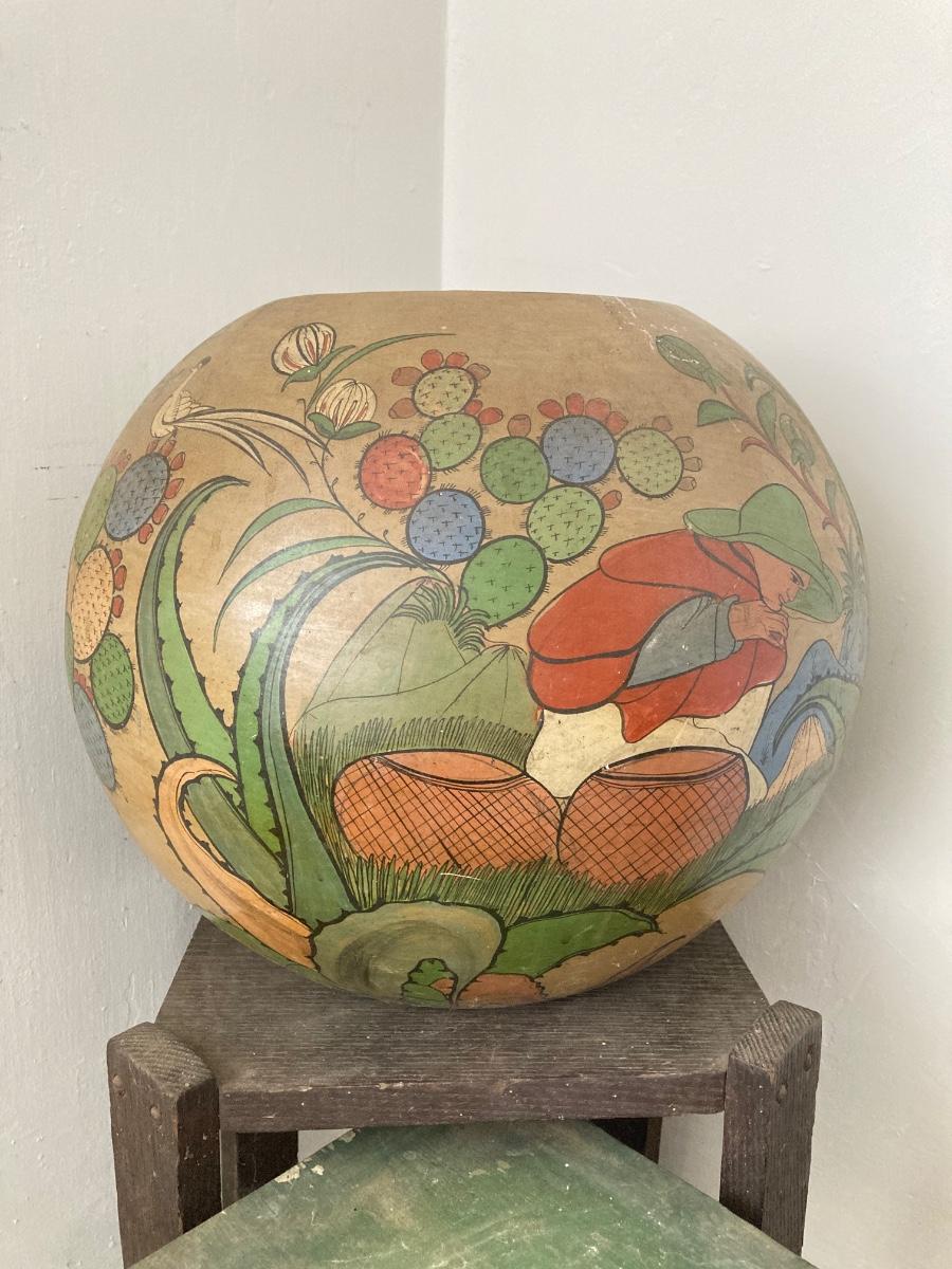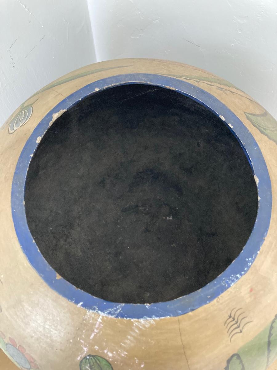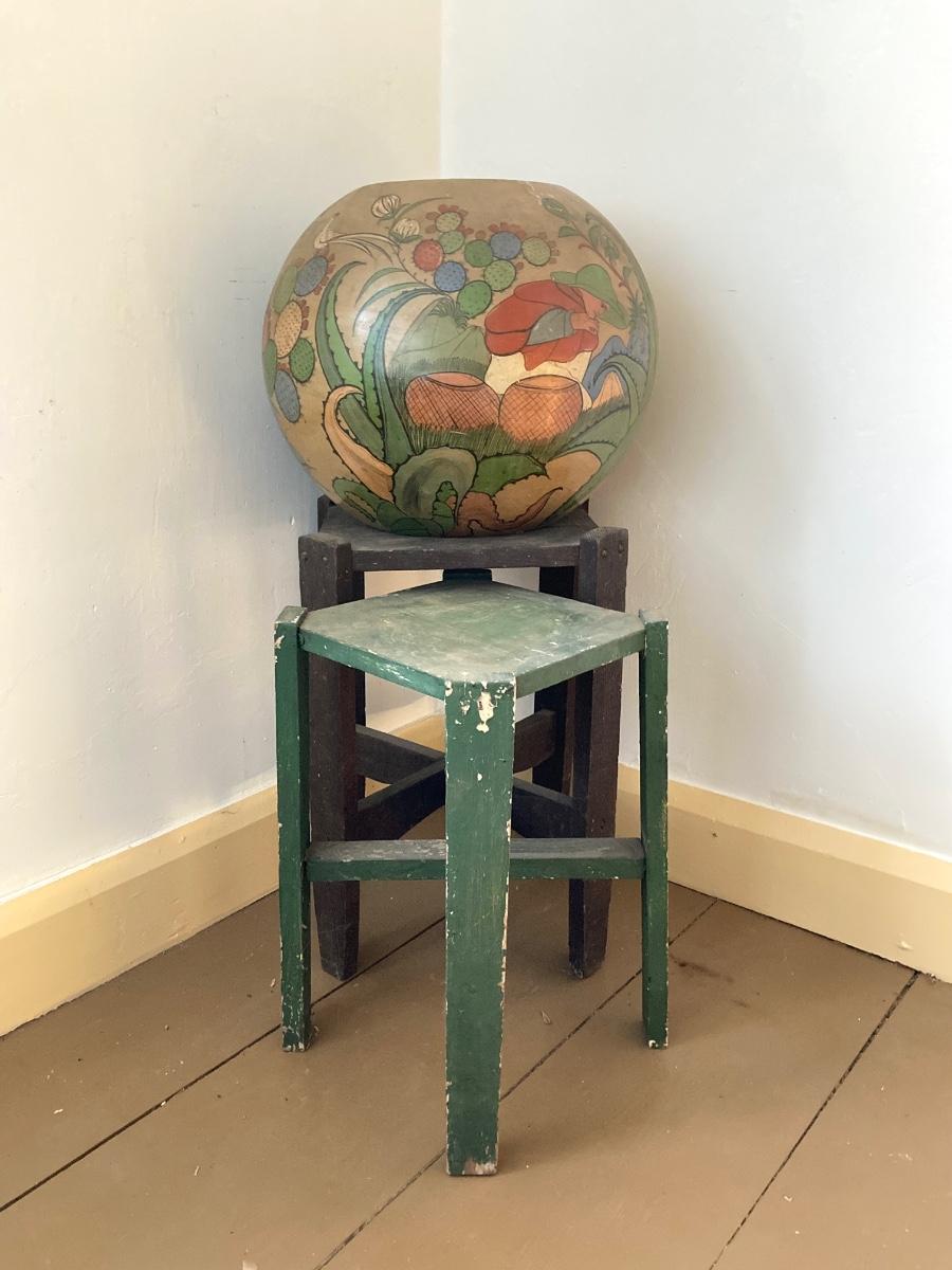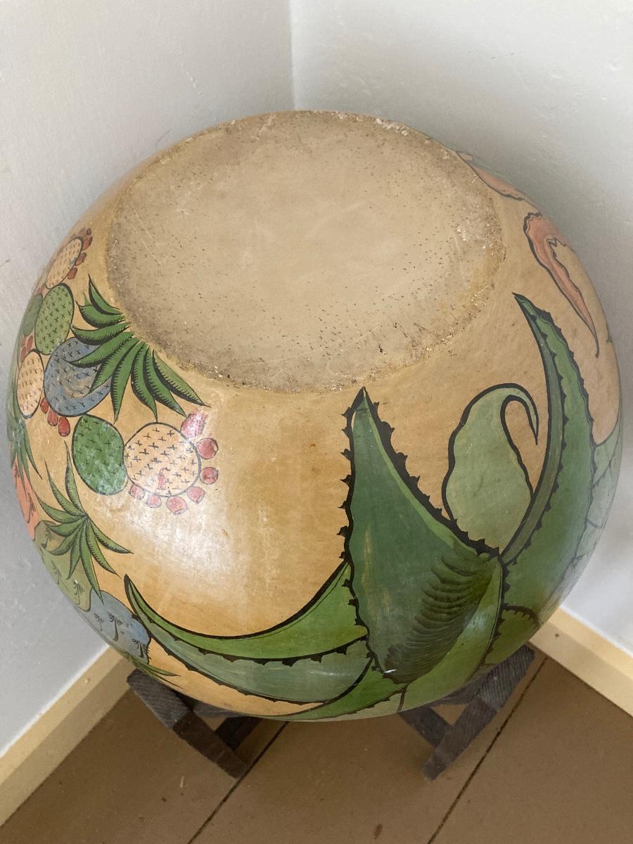 LOT 31: Vintage Mexican Tlaquepaque Pottery Vase/Planter with Pair of Primitive Wood Plant Stands