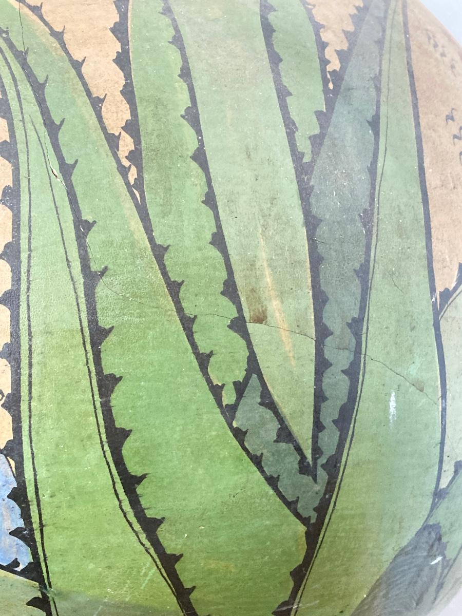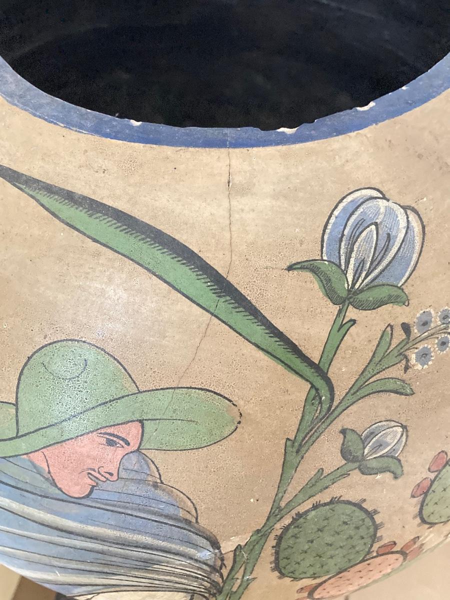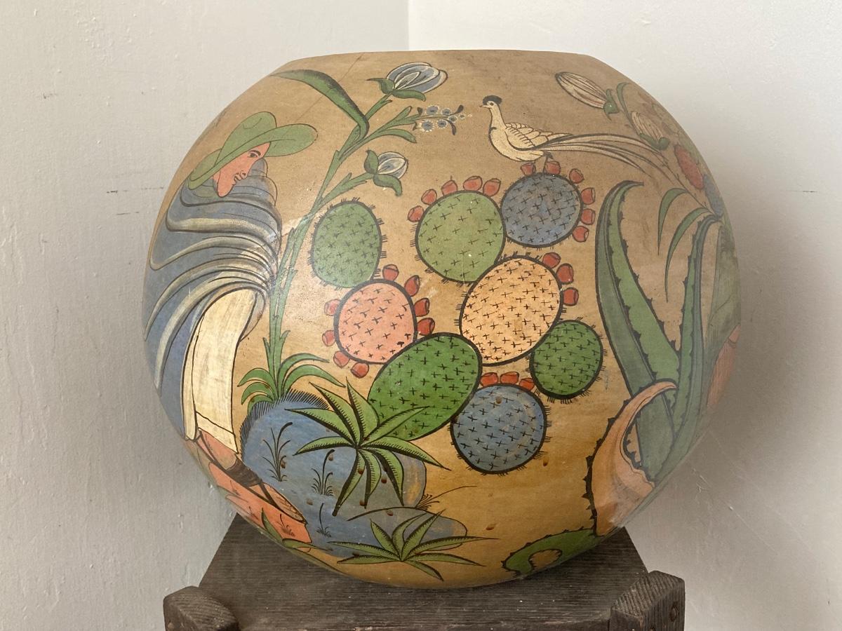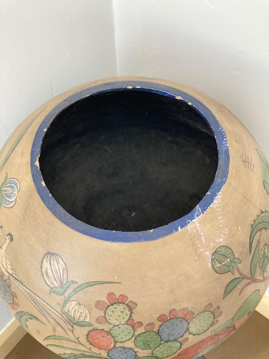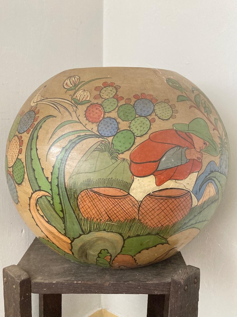 LOT 31: Vintage Mexican Tlaquepaque Pottery Vase/Planter with Pair of Primitive Wood Plant Stands