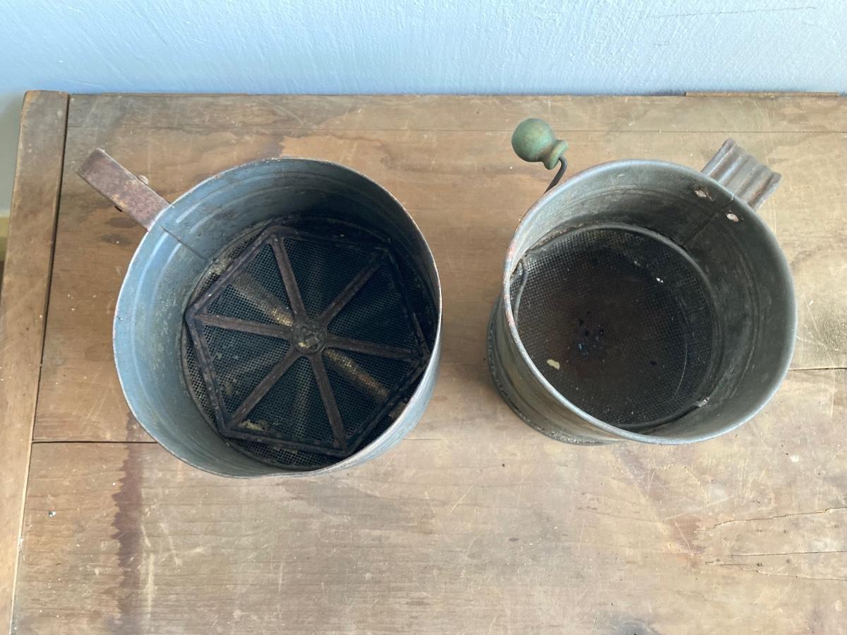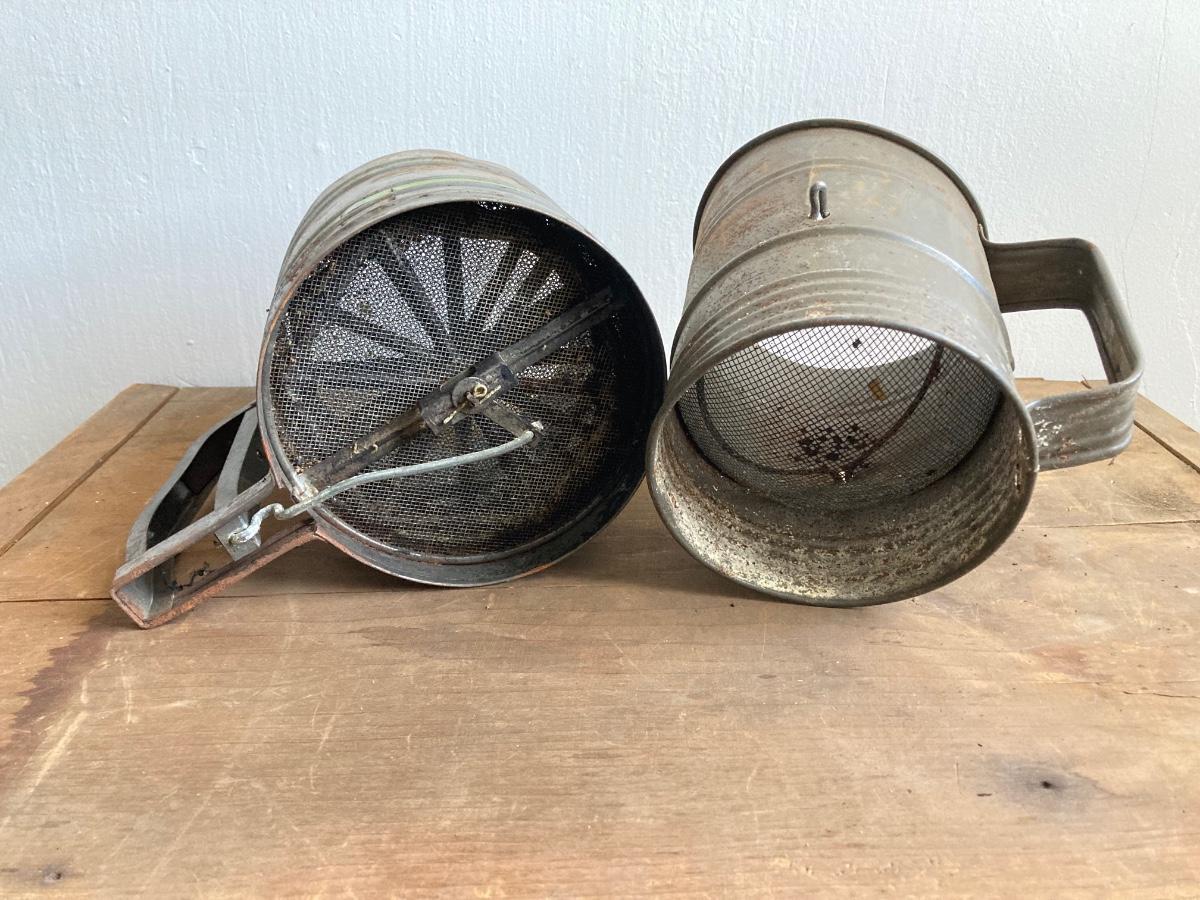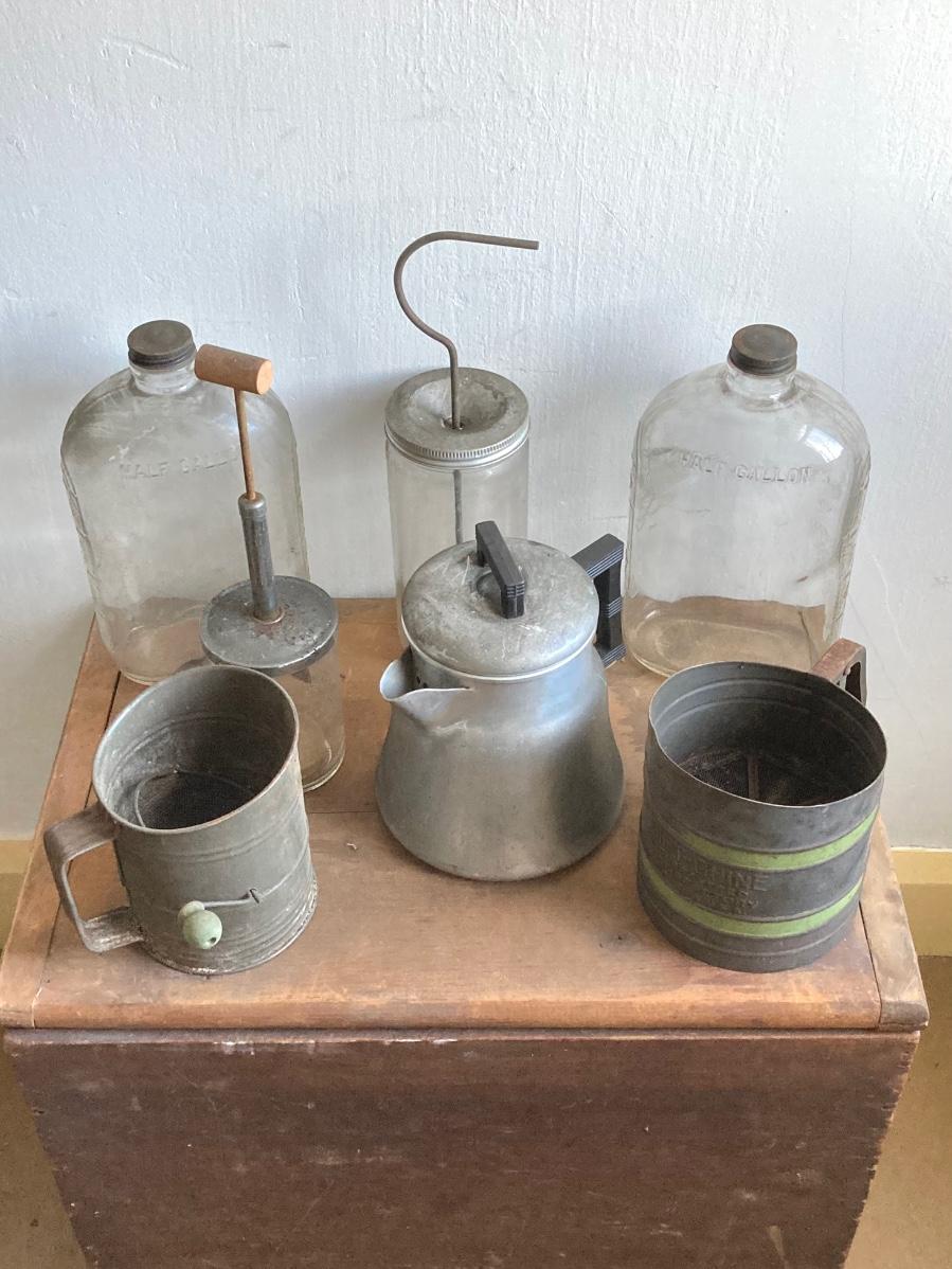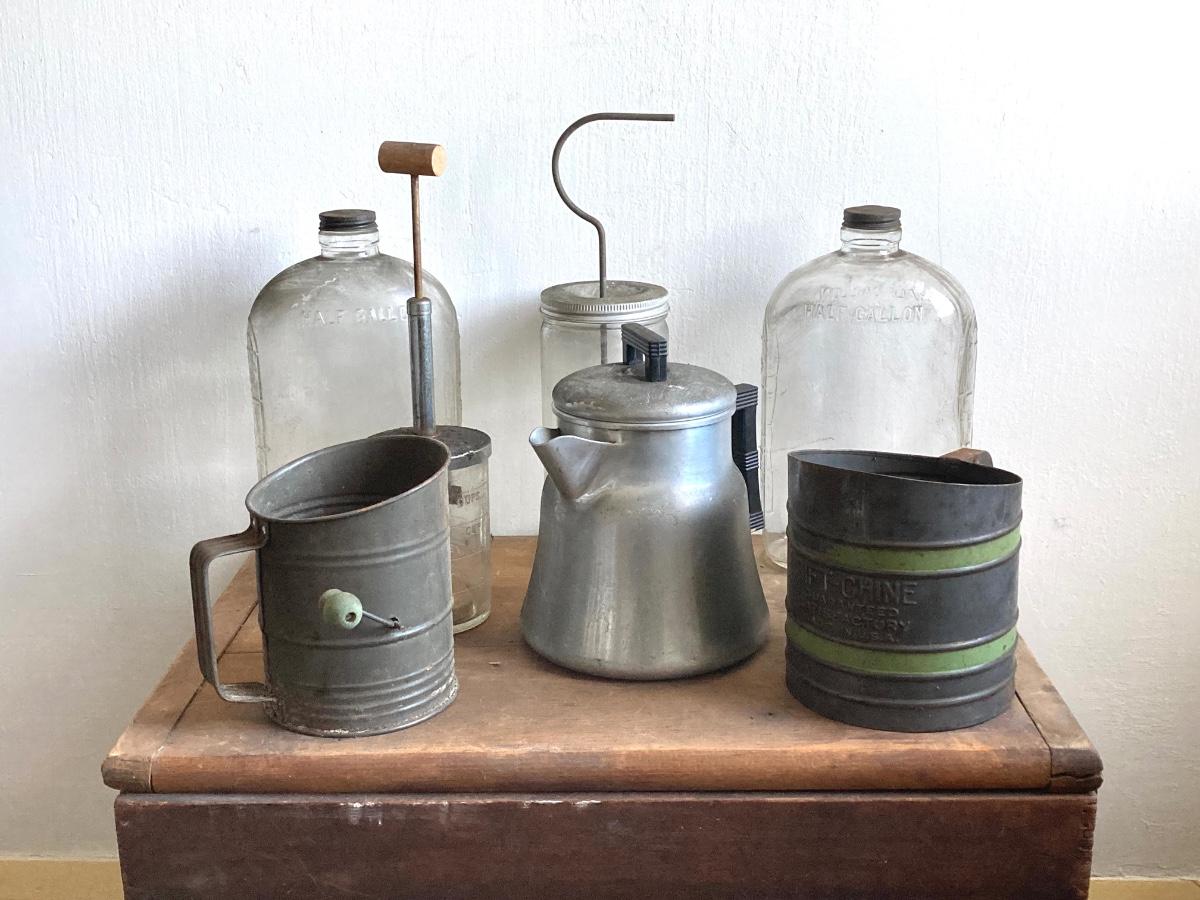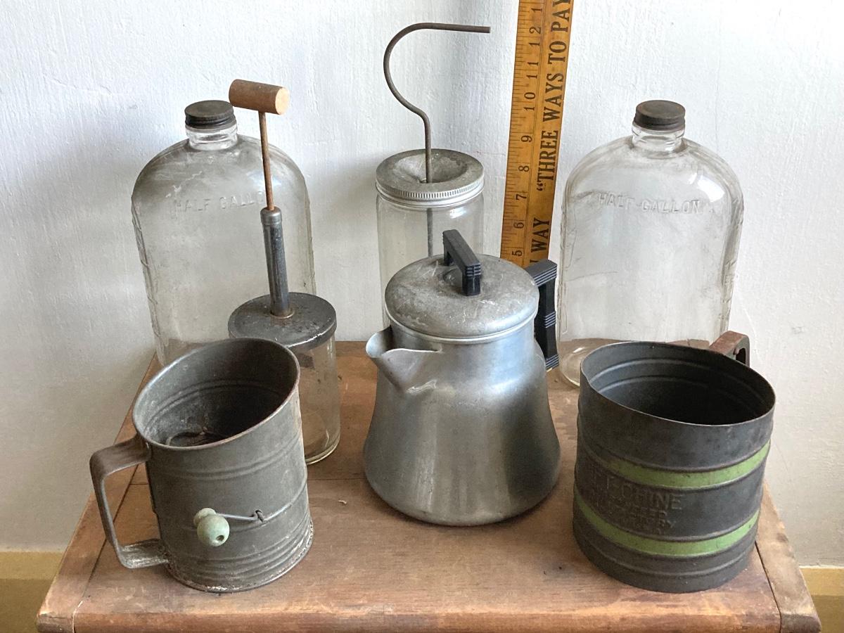 LOT 45: Vintage Kitchen Collection - Coffee Pot, Sifters (Sift-Chine), Choppers, Bottles and More