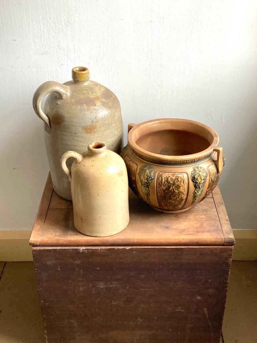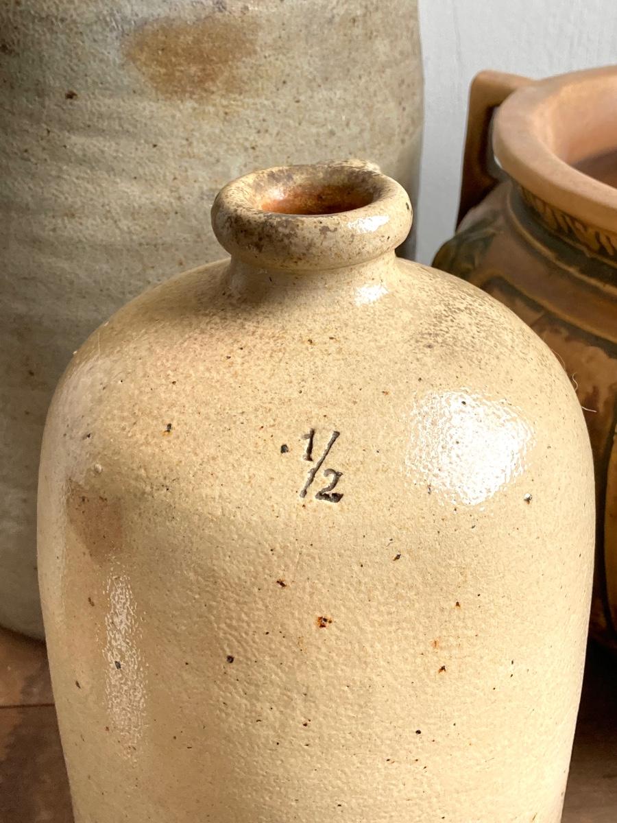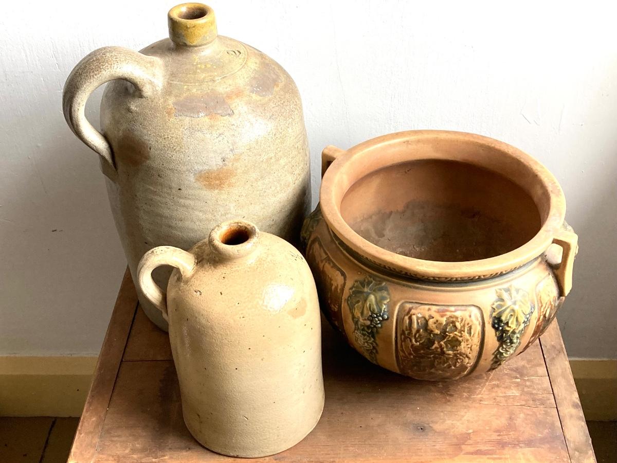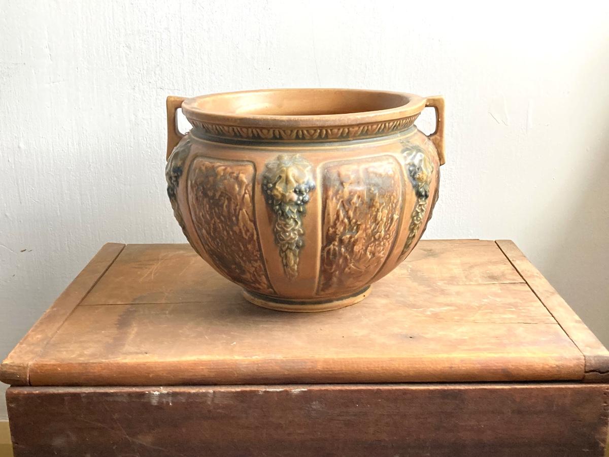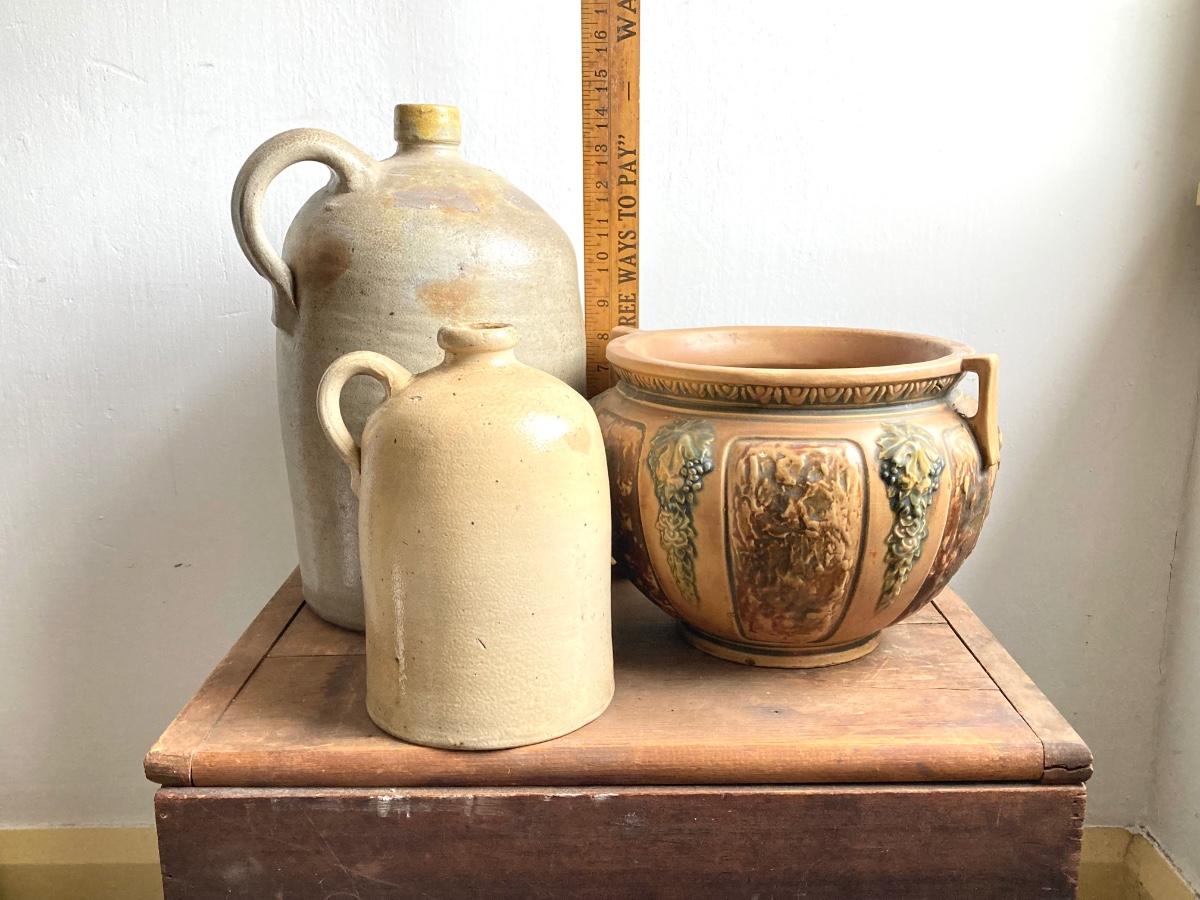 LOT 52: Vintage Roseville Pottery Planter along with a #2 Stoneware Jug & 1/2 Stoneware Jug